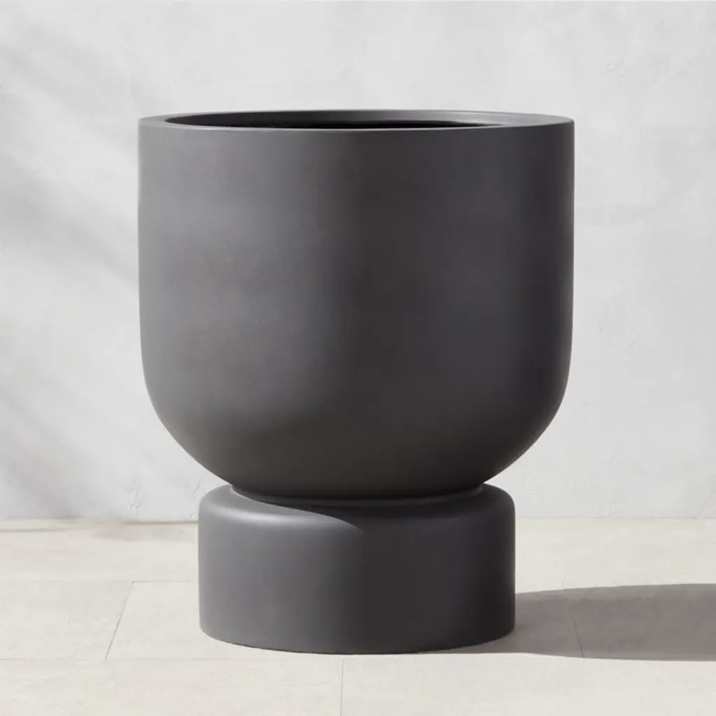 Designed by Studio Anansi, sculptural charcoal planter makes a statement indoors or outdoors. Crafted from a mix of sand and stone composite, planter is molded into a unique platform base with a wide opening. Perfect for a lush display. Refined charcoal finish is weather-resistant. Comes in a variety of medium, wide and tall sizesperfect for leveling and layering. CB2 exclusive.