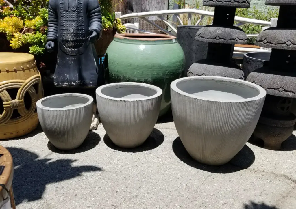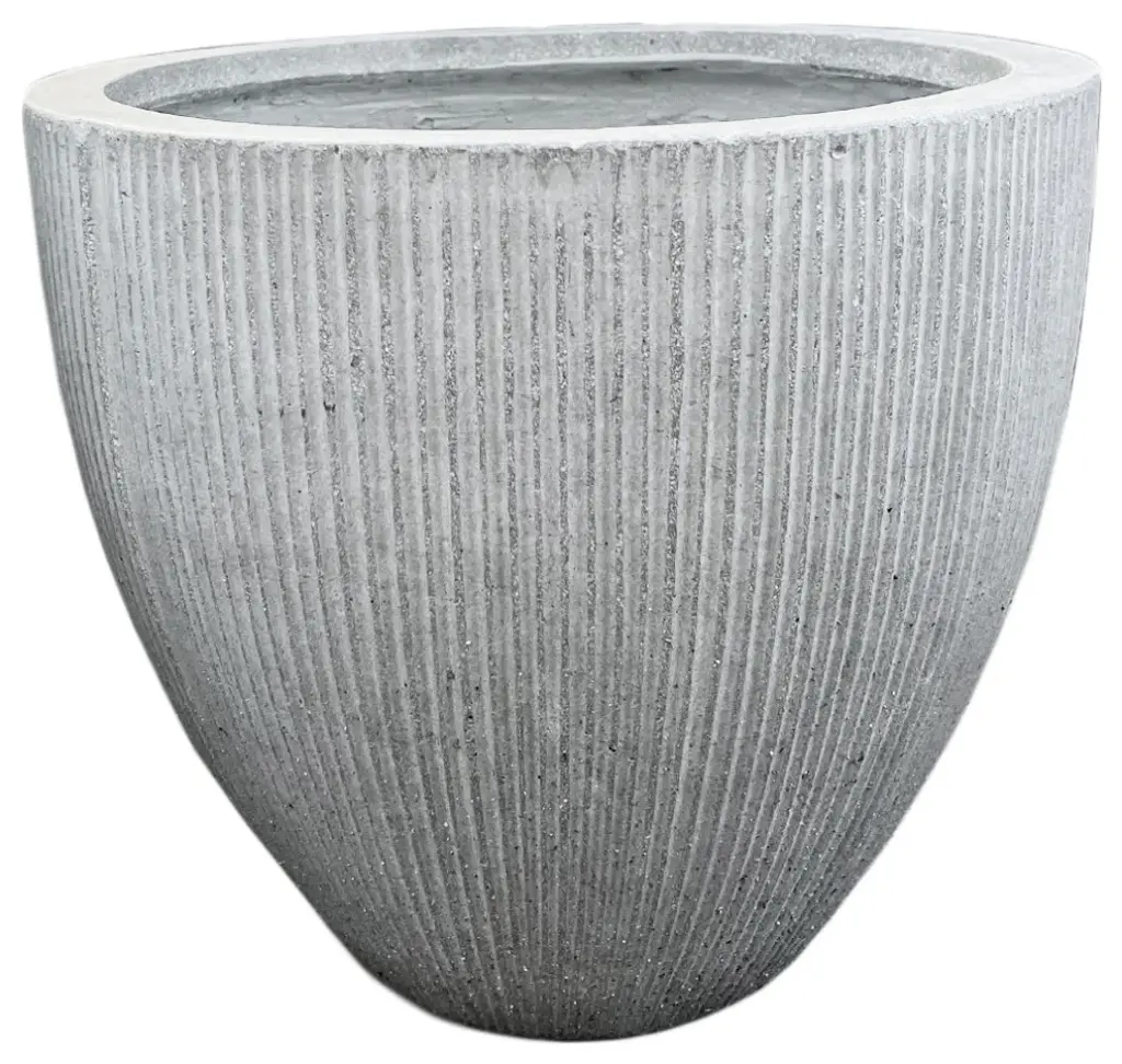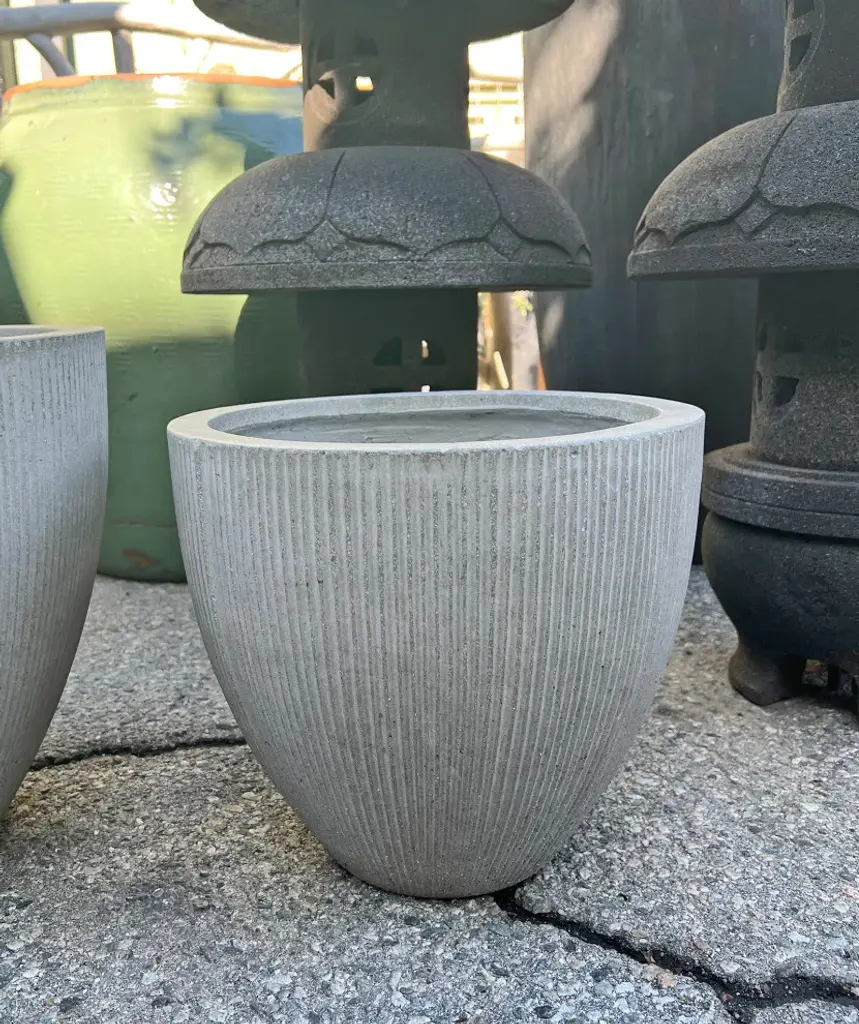 Fluted cement planter. Opening is less than 11" diameter. Includes drainage hole and removable plug if needed.