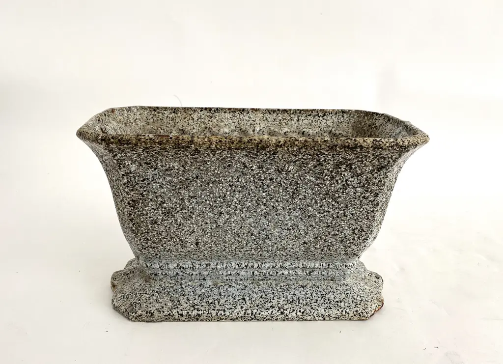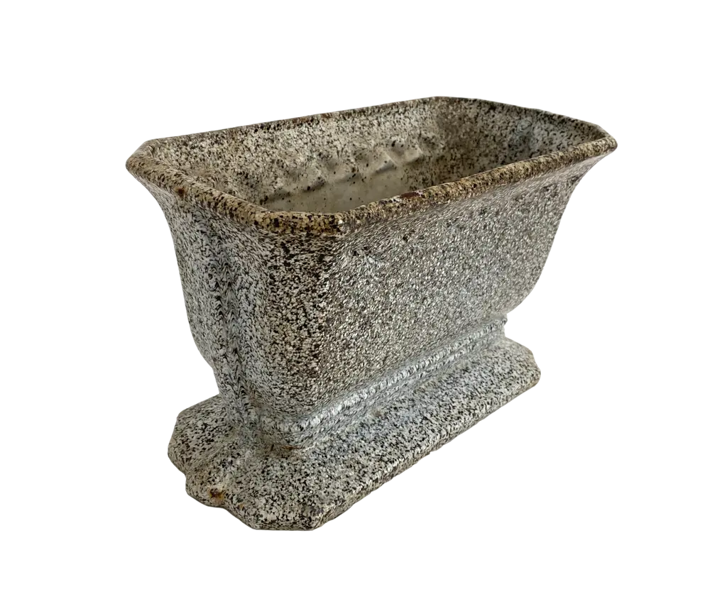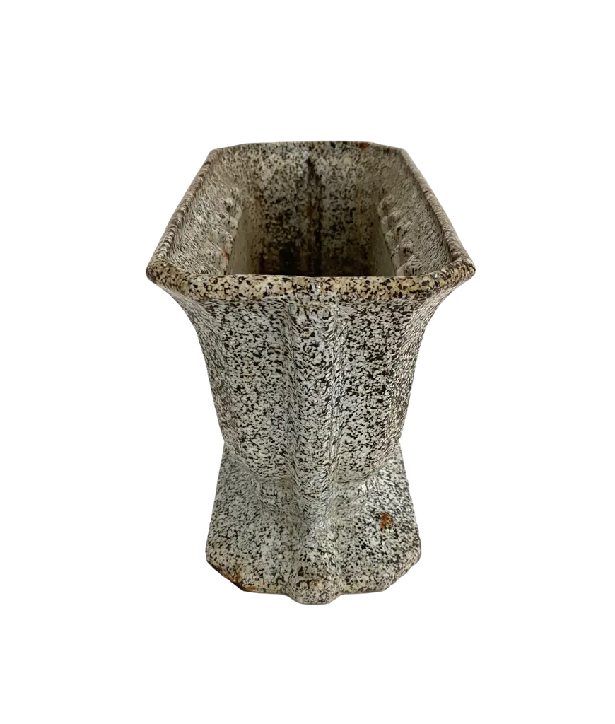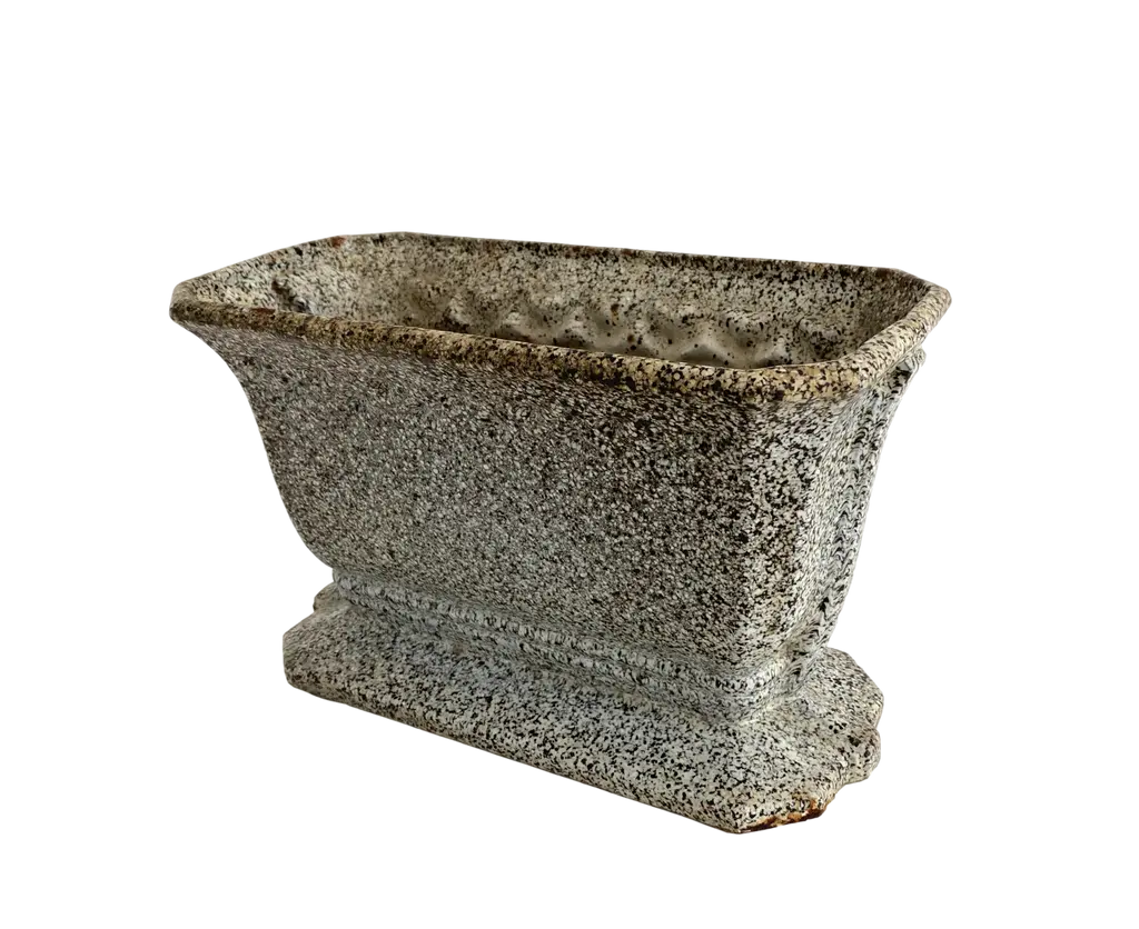 This heavy French cast iron oblong planter with black and white speckled enamel caught my eye right away. The monochromatic color way, the shape with fluted base, the weight make this unique piece a one off. Features drain holes at the bottom. Age and discoloration are part of the patina.