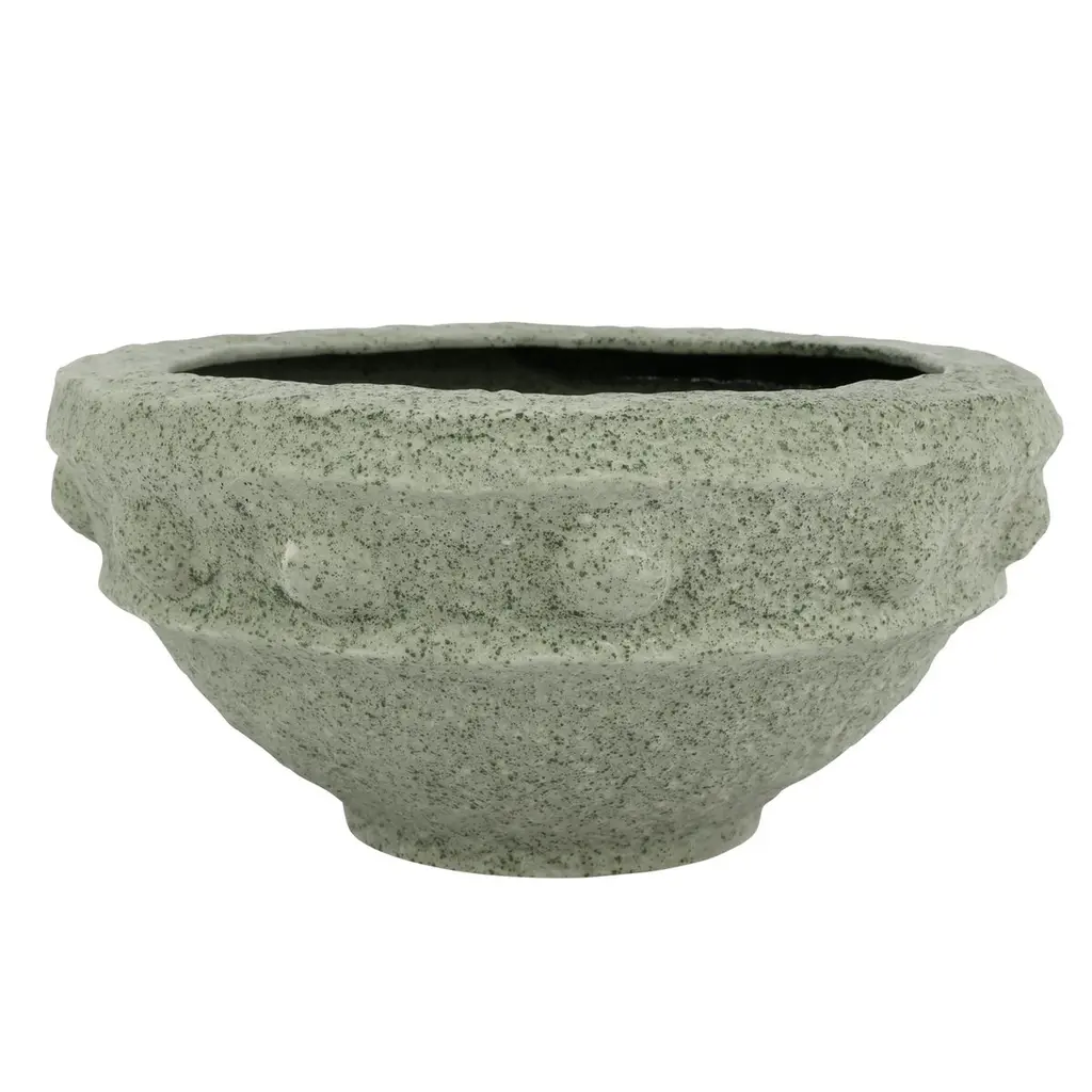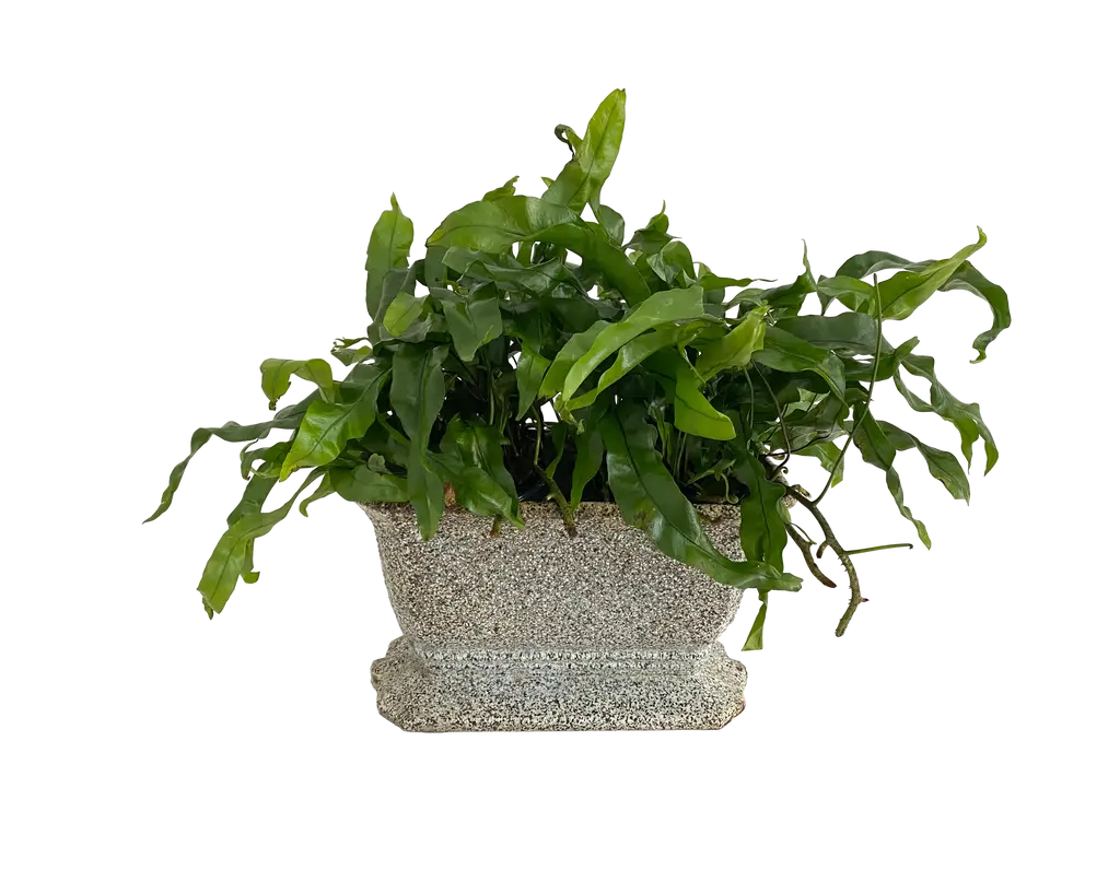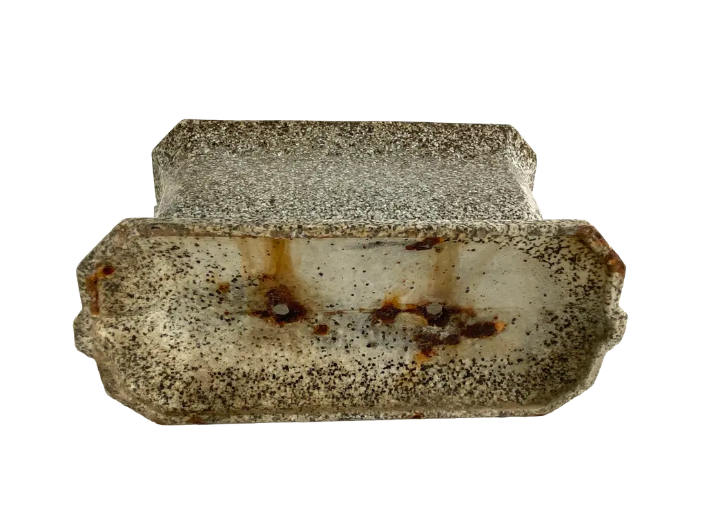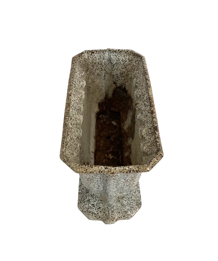 This heavy French cast iron oblong planter with black and white speckled enamel caught my eye right away. The monochromatic color way, the shape with fluted base, the weight make this unique piece a one off. Features drain holes at the bottom. Age and discoloration are part of the patina.