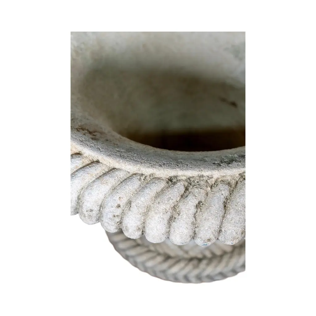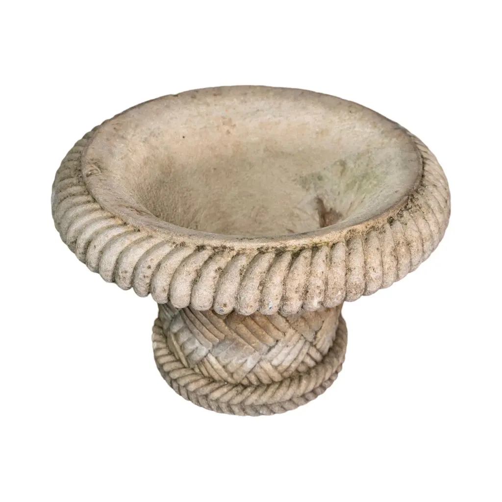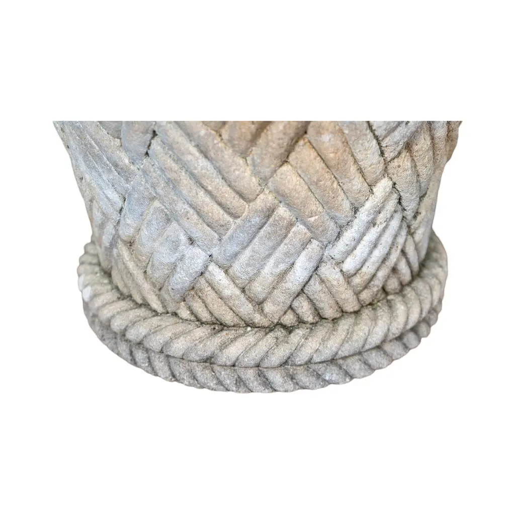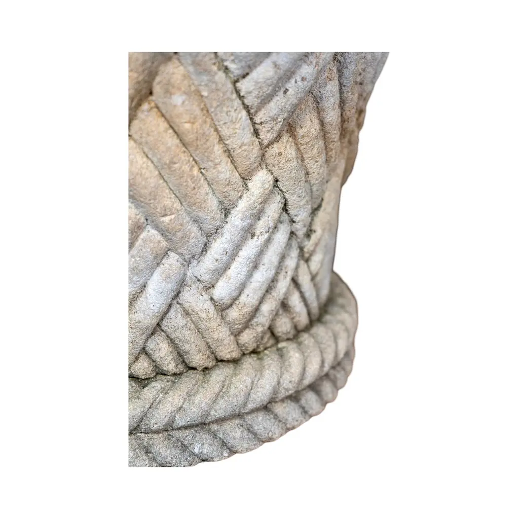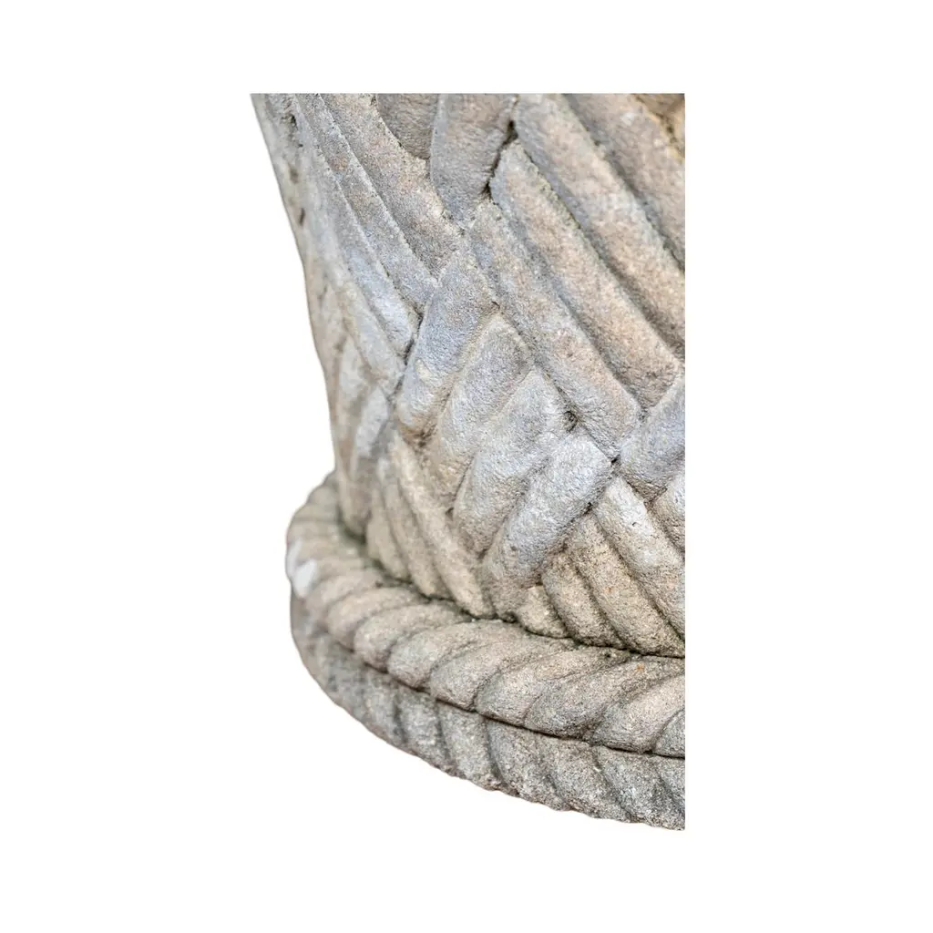 This circa 1980s French Limestone Planter showcases a classic basket weave carved design, adding charm and character to any outdoor space. Handcrafted in France, each planter is unique and features its own distinct wear. Made from durable limestone, this planter is built to last and adds a touch of elegance to your garden.
