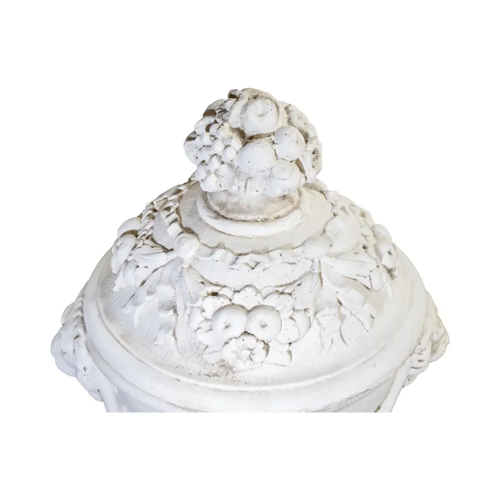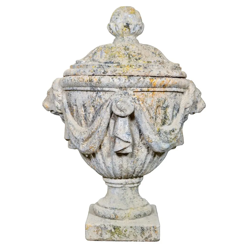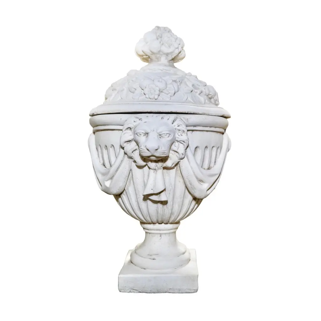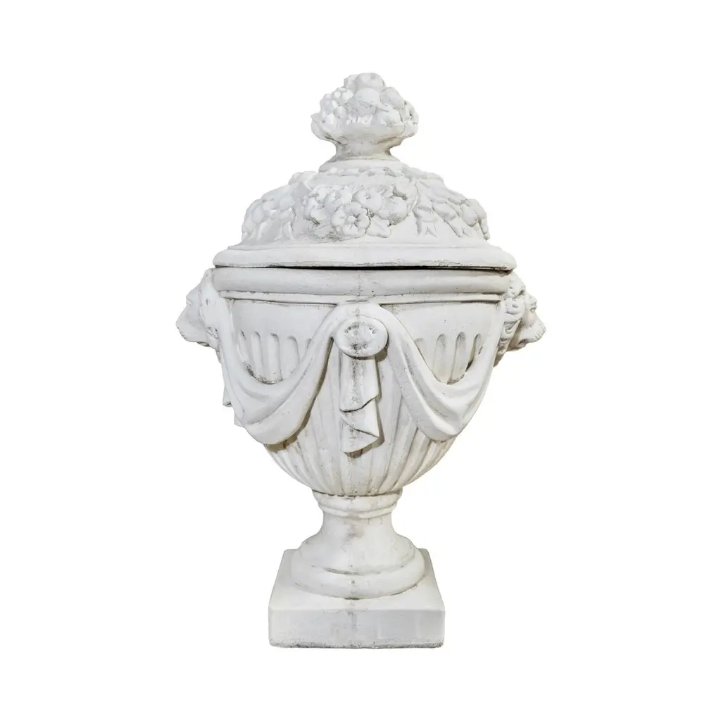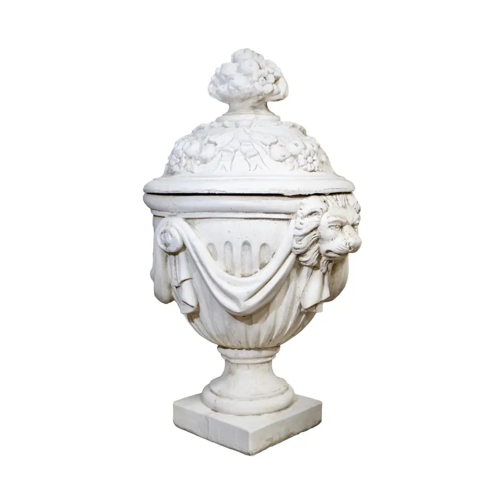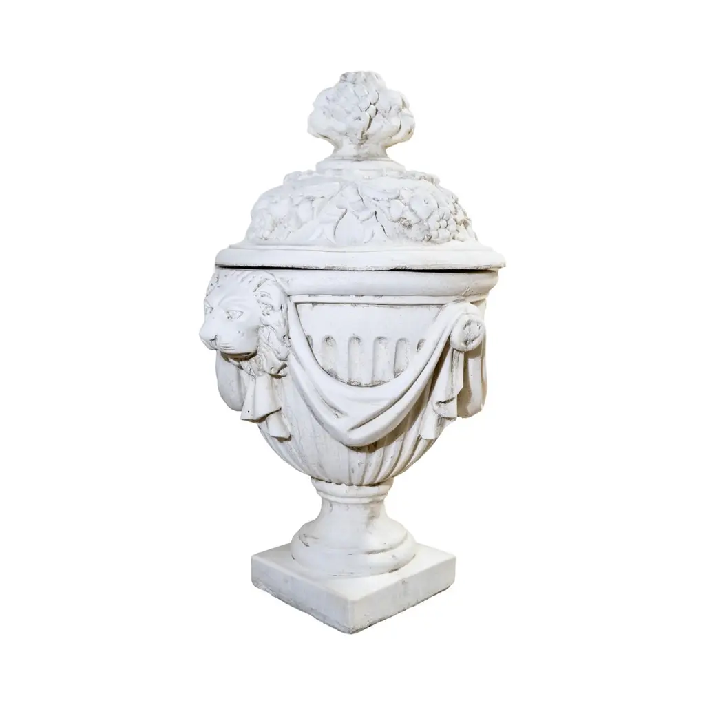 The French Decor Urn is a mid-century contemporary planter from France. Its intricate style carvings, fluted design, and swag style carvings make it a beautiful addition to any garden or outdoor space. Made with a composite stone material, this urn also features a detectable top lid with delicate floral motifs and a carved lion on the sides. Elevate your outdoor decor with this elegant French piece.