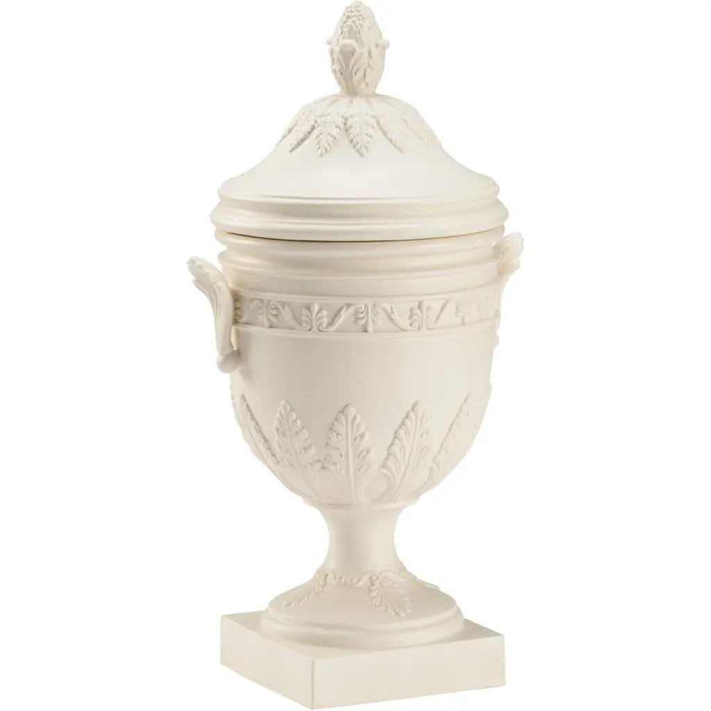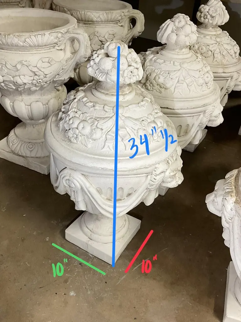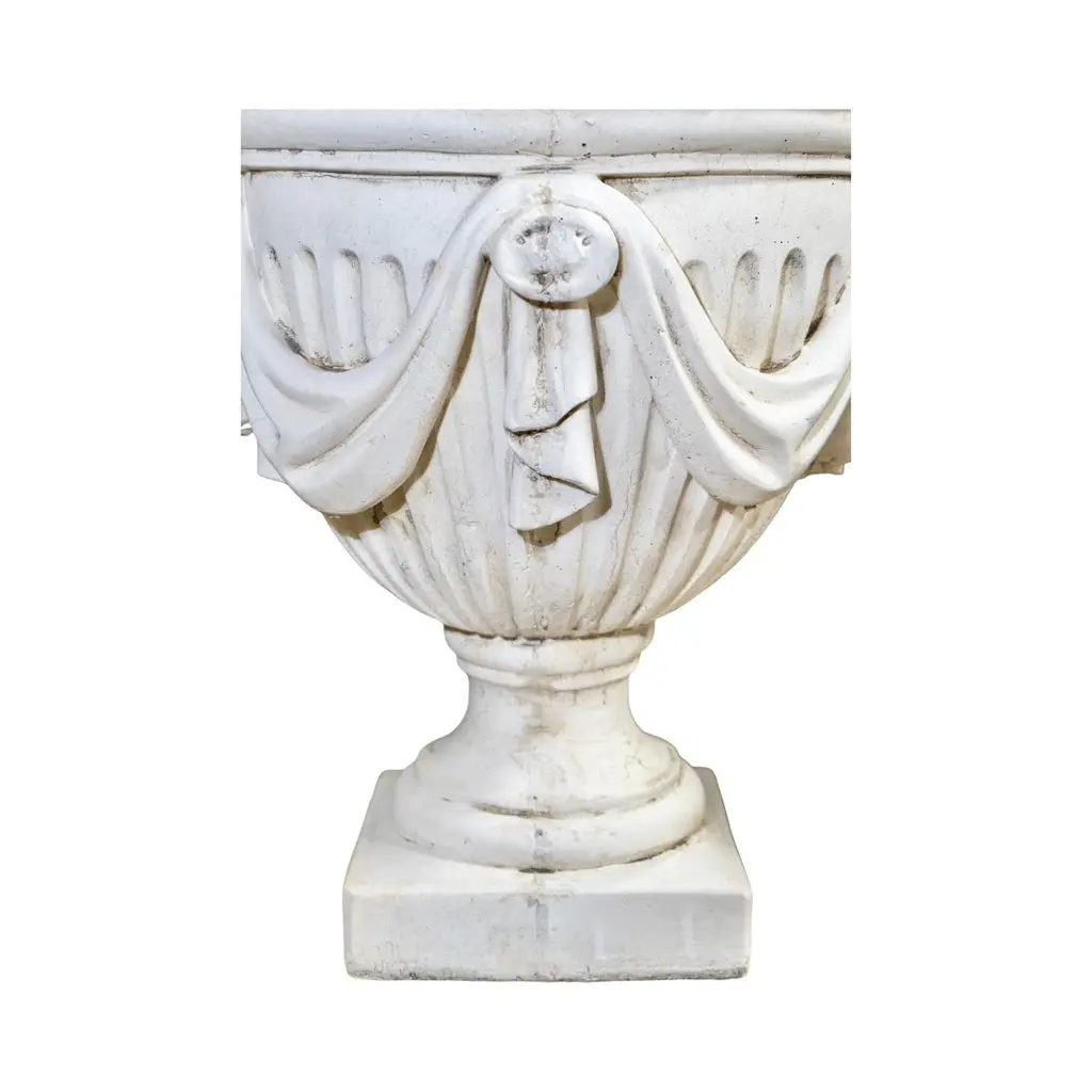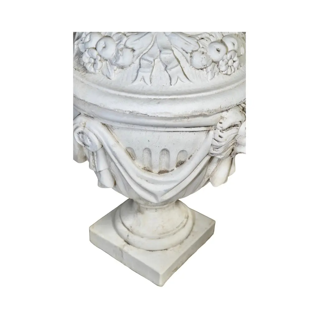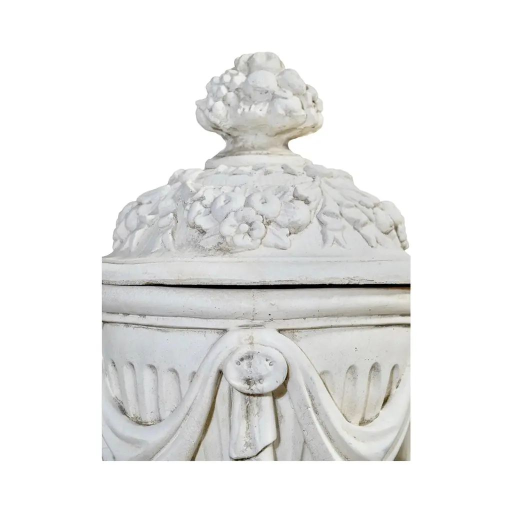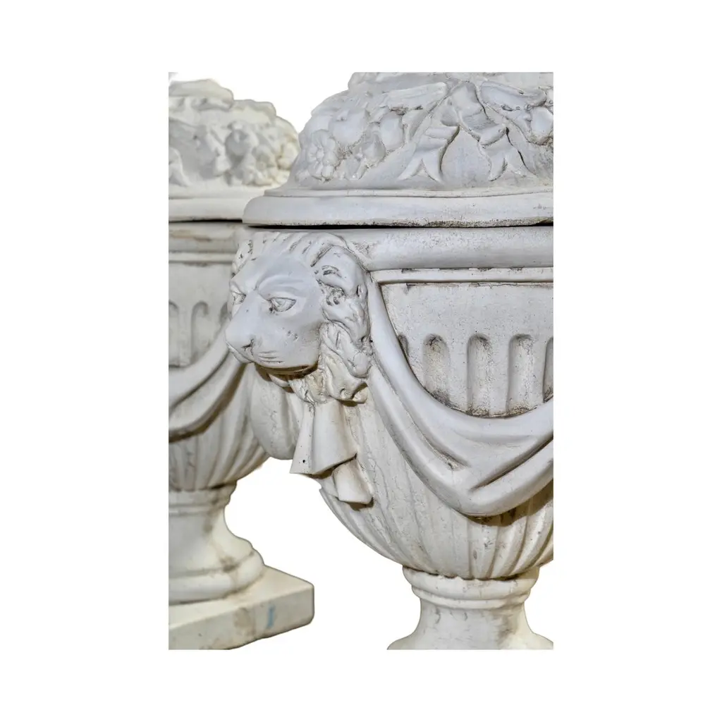 The French Decor Urn is a mid-century contemporary planter from France. Its intricate style carvings, fluted design, and swag style carvings make it a beautiful addition to any garden or outdoor space. Made with a composite stone material, this urn also features a detectable top lid with delicate floral motifs and a carved lion on the sides. Elevate your outdoor decor with this elegant French piece.