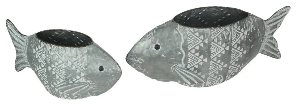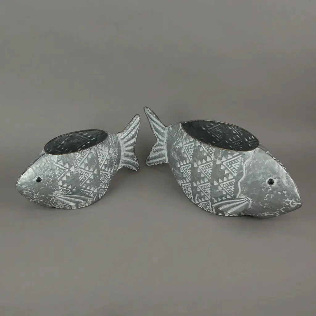OVERALL SIZE - Large - (16.5 Inches Long, 6 Inches Wide, 6.75 Inches High); Small - (12.5 Inches Long, 5.75 Inches Wide, 6.5 Inches High)DURABLE MATERIAL - Crafted of High Quality Metal For Years of Maintenance Free DisplayRUSTIC FINISH - Galvanized Metal With White Wash Accents For A Classic Aged LookVINTAGE STYLE - Compliments A Variety Of Decor Styles From Farmhouse to Beach HouseFISHY FLORIST - Great For Displaying Herbs, Succulents, Small House Plants, And FlowersGive your plants a splash of style with this set of decorative fish-shaped flower pots. Creatively crafted from galvanized metal, the whitewash accent finish gives them a unique vintage look that is sure a complement a variety of beach or farmhouse decor styles. The large measures 16.5 inches long, 6 inches wide, and 6.75 inches high; the small measures 12.5 inches long, 5.75 inches wide, and 6.5 inches high making them great for herbs, succulents, small house plants, and flowers. Makes for a great addition to your indoor or outdoor plant space.