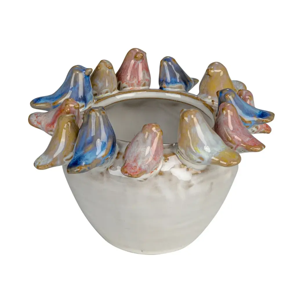 Birds of a feather. Our stoneware pot planter brings a touch of whimsy to your indoor or outdoor space. The reactive glaze finish creates a multicolor effect, while two perched birds add a playful element. Round in shape and measuring 5 inches in diameter, it's the perfect size for a 4-inch pot. Each planter is unique, with slight variations in color and pattern. So go ahead, let your green thumb take flight.