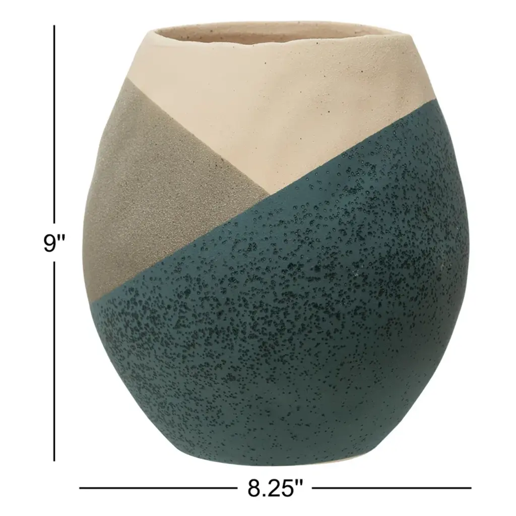This splendid hand-painted stoneware planter has a gorgeous multi-colored and multi-textured finish. It adds a modish contemporary touch and will look great on a table, mantle, dresser, or bookshelf.
