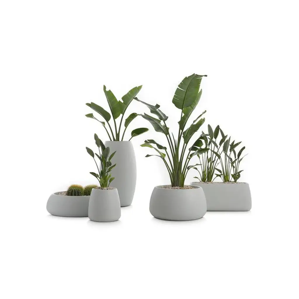 The serene look of the Gobi collection of planters is inspired by the gently rolling landscape of desert dunes. These round pots with their elegant curves are specially designed for use in outdoor spaces as they are made from 100% recyclable polyethylene. Each of the five models in the collection has its own distinct personality. This is the Gobi 3 planter, with a diameter of 31 in and a height of 17 in. Gobi 3 is a great option for plants with large leaves, such as Swiss cheese plants, but also for shrubs like box or for aromatic plants. It can be used on its own to decorate a corner of an outdoor lounge or eating area, but also together with several other planters, including models from this collection. For example, it goes especially well with Gobi 1 as it is a very similar shape and they look like members of the same family. Features