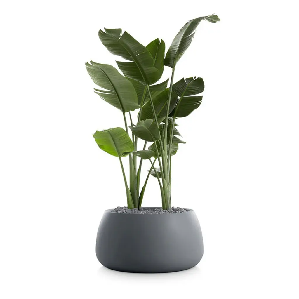 The serene look of the Gobi collection of planters is inspired by the gently rolling landscape of desert dunes. These round pots with their elegant curves are specially designed for use in outdoor spaces as they are made from 100% recyclable polyethylene. Each of the five models in the collection has its own distinct personality. This is the Gobi 3 planter, with a diameter of 31 in and a height of 17 in. Gobi 3 is a great option for plants with large leaves, such as Swiss cheese plants, but also for shrubs like box or for aromatic plants. It can be used on its own to decorate a corner of an outdoor lounge or eating area, but also together with several other planters, including models from this collection. For example, it goes especially well with Gobi 1 as it is a very similar shape and they look like members of the same family. Features