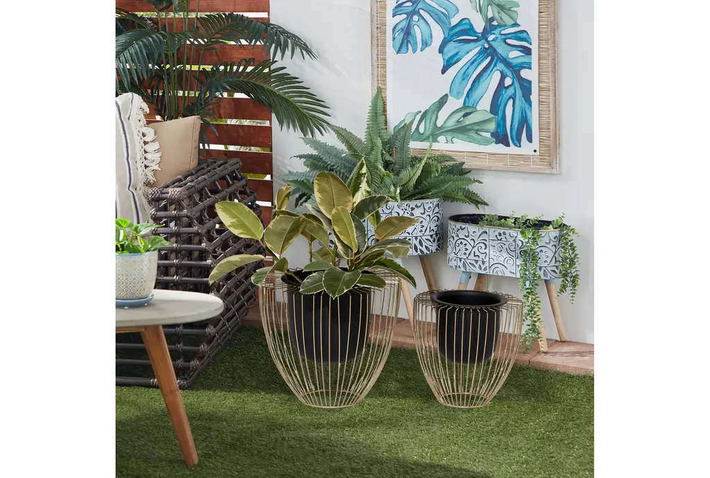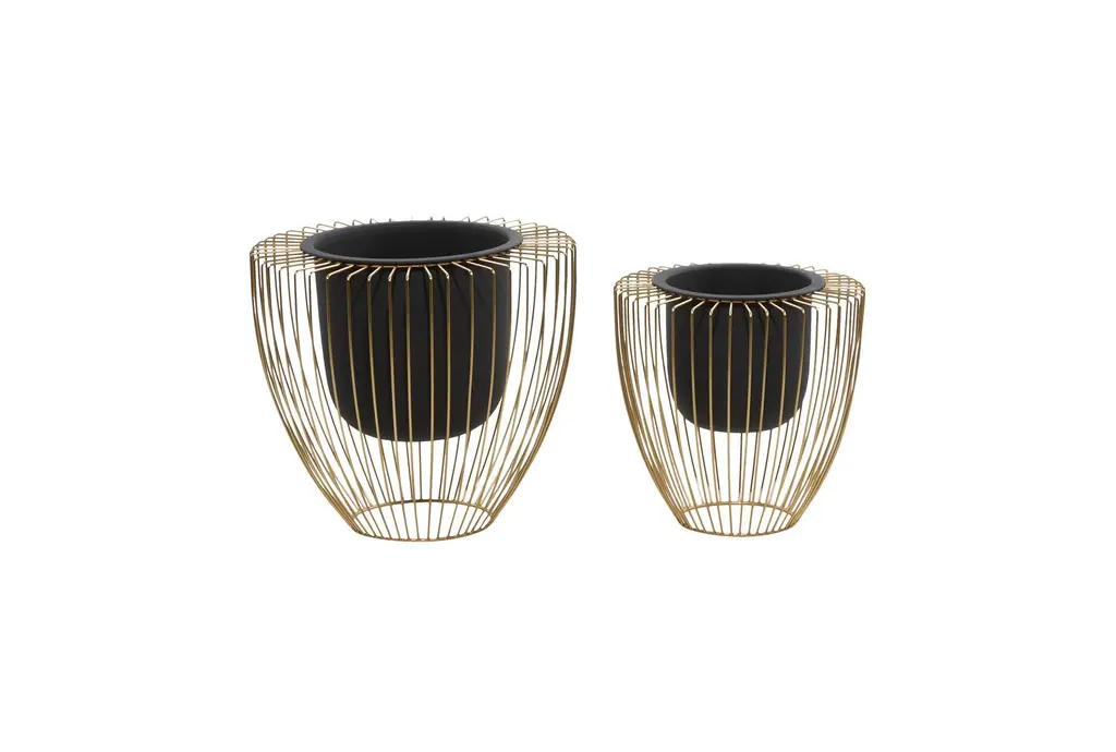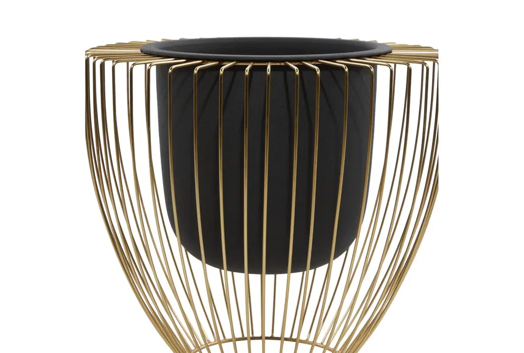 Leverage on the variation in pot depth and stand height, color, and metallic finish of this pair of indoor planters for contemporary and modern interior designing. Such features can complement almost any color palette, pattern, and texture. The solid construction of both vase-like gridded stands and no-drainage hole pots are made of iron material to add pizzazz to a corner of your living space. The taller planter stands 12" tall, while the smaller one is 11" high. Display as plant holders or corner accent pieces in modern and contemporary-themed interiors. Wipe clean with a dry cloth. Suitable for indoor and outdoor use. Made in India. Pots do not have drainage holes. This item comes in a set of two planters. Contemporary design. This item comes shipped in one carton. Planters do not have drainage holes but they are not watertight.