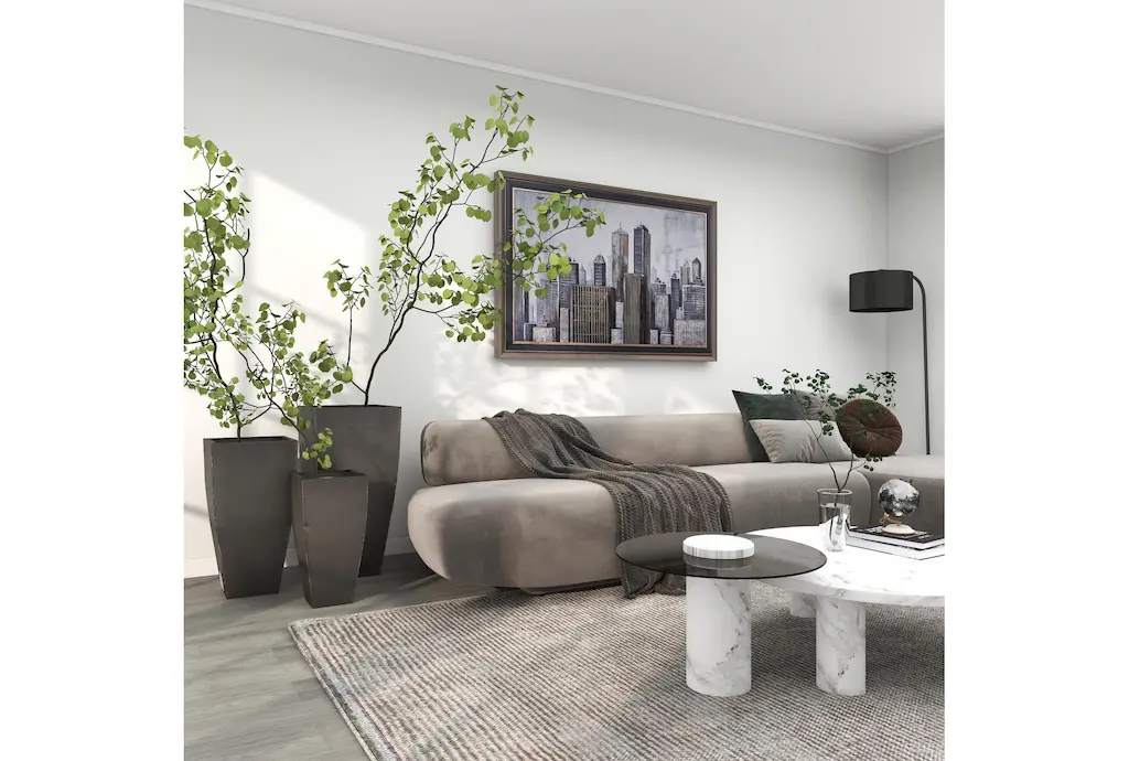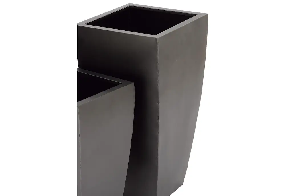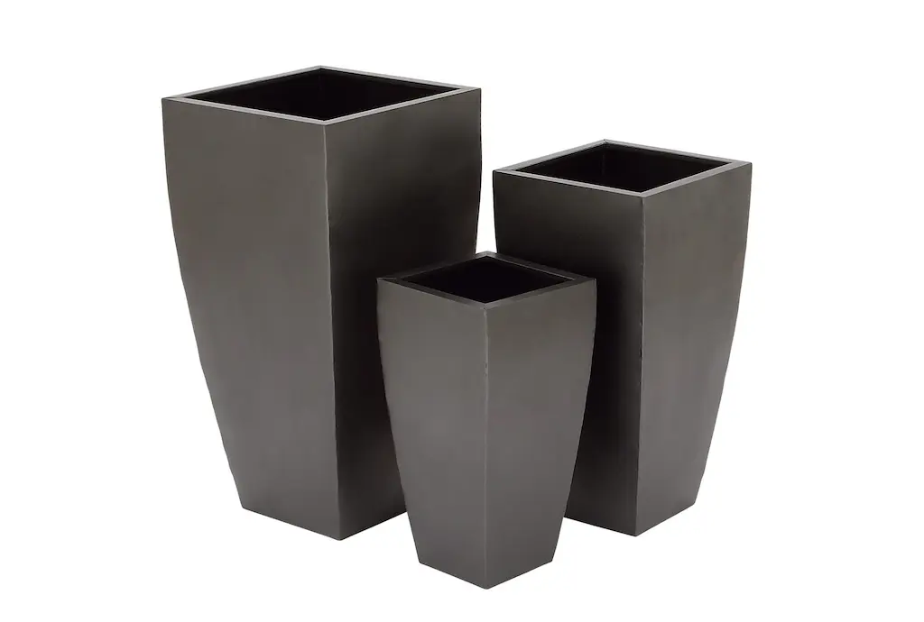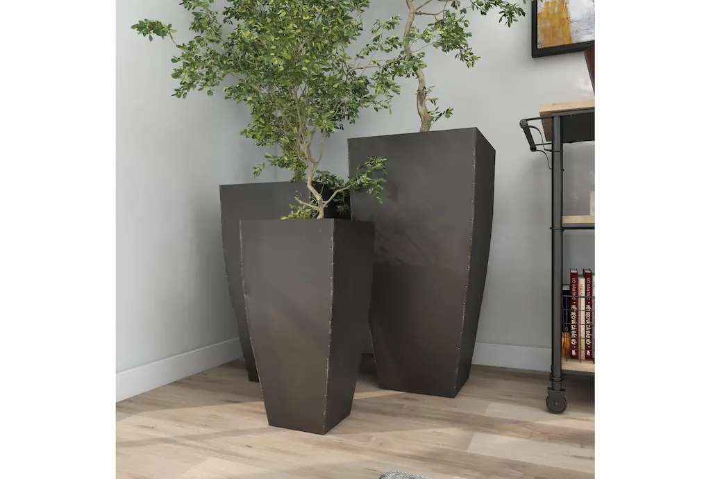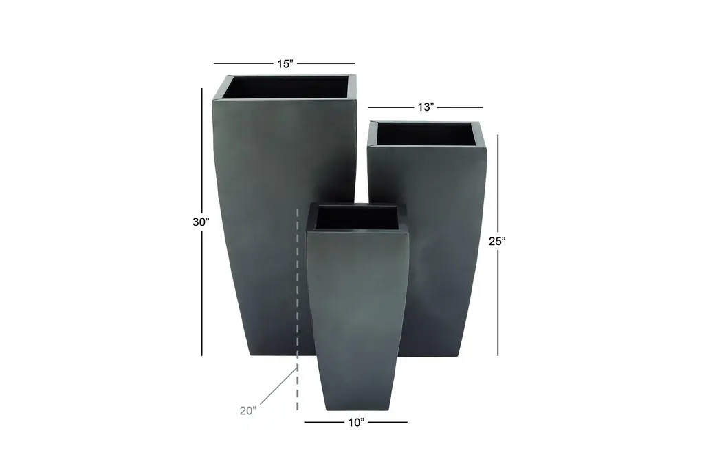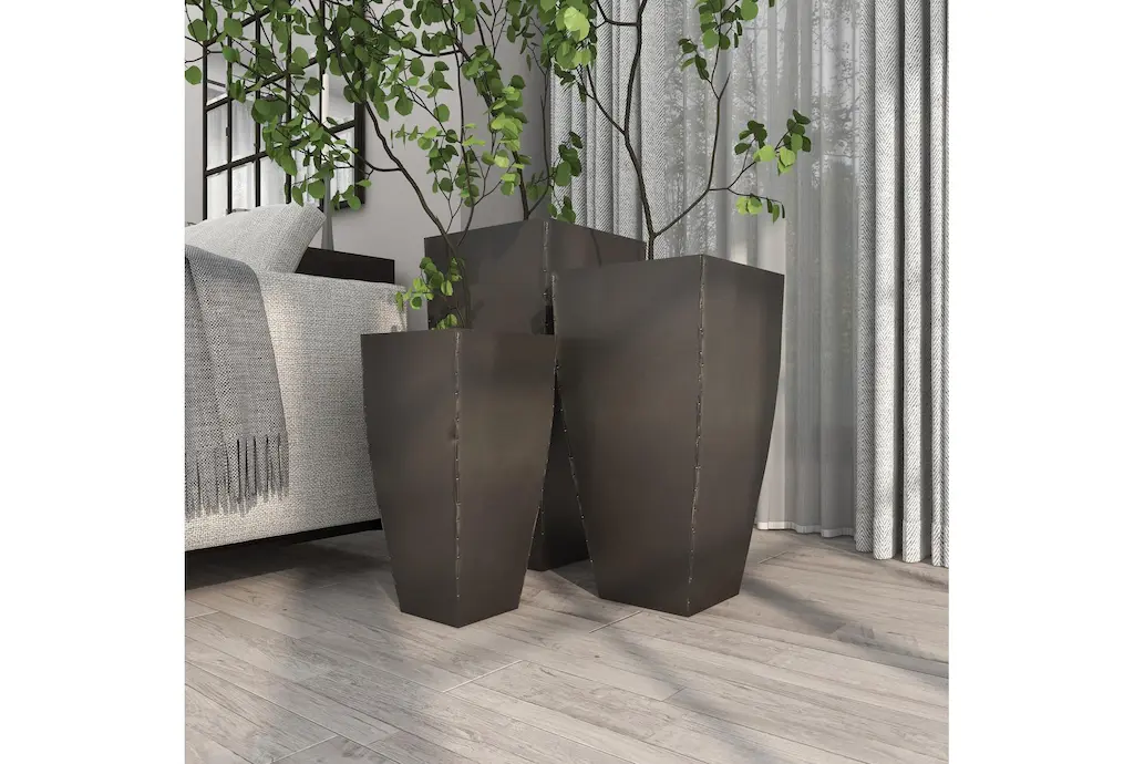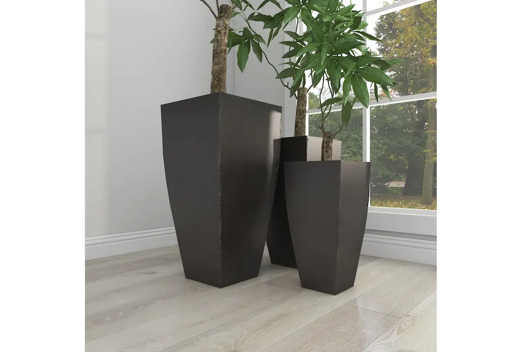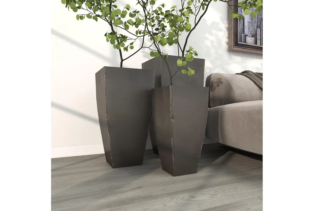 Each piece offers durability that can jazz up contemporary-themed indoor corners. Display them together or separately to showcase your greeneries. This item ships in 1 carton. Please note that this item is for decorative use only. CONTEMPORARY STYLE: Tall, gray metal indoor & outdoor planters with contemporary silhouettes. Suitable for indoor and outdoor use. This item ships fully assembled in one piece. Maximum weight limit is 20 lbs. Planters do not have drainage holes but they are not watertight. This dark gray colored plant pot comes as a set of 3. Contemporary style.