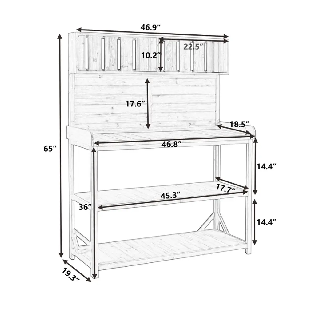 Embrace the beauty of gardening with our 65" Forest Natural Farmhouse Garden Potting Bench, designed to enhance your outdoor space. This rustic potting bench offers a spacious 46.8x18.5-inch workstation, perfect for organizing your gardening tools and planters. With a total height of 65 inches and a potting height of 36 inches, it provides ample space for all your gardening needs. The bench features four storage shelves and a side hook, ensuring your tools are always within reach. Its anti-falling safety device ensures stability on uneven ground, making it a reliable addition to your garden.