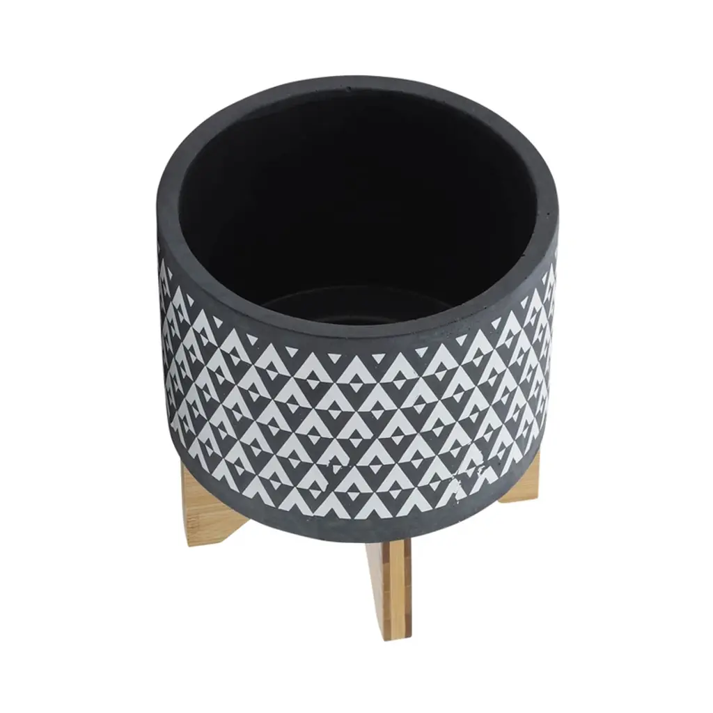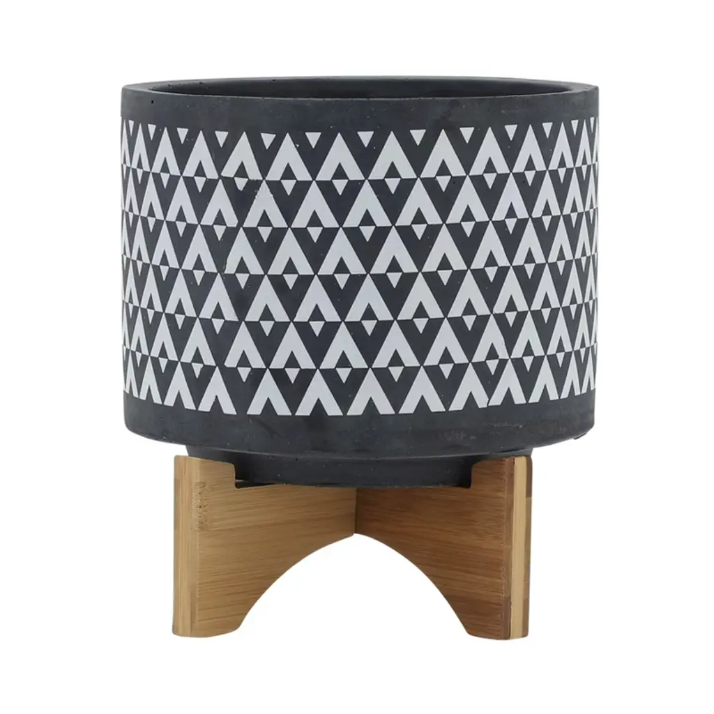 Gulches Aztec Ceramic Planter On Wooden Stand, Gray, 8X8x9"