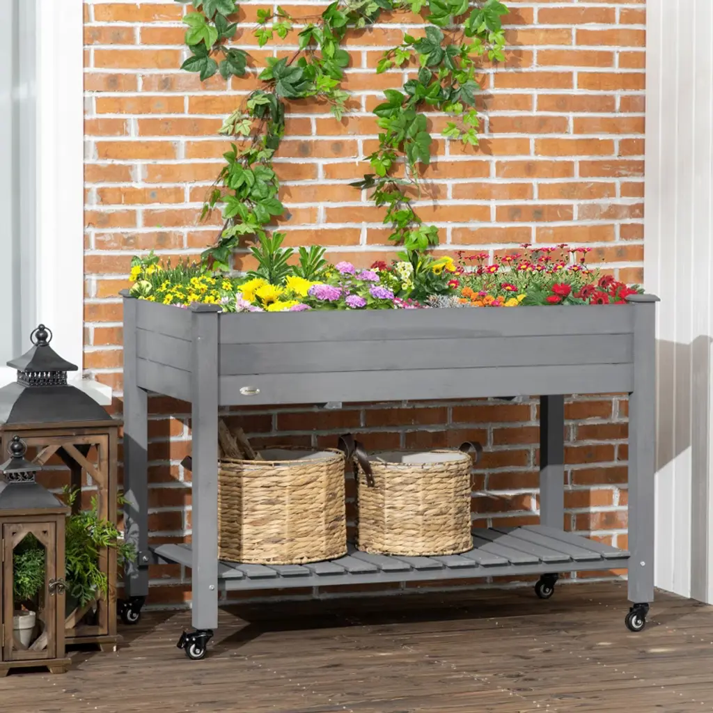 Enhance your gardening experience with the Gulches Mobile Elevated Garden Planter. Designed for versatility and convenience, this planter features a spacious planting area and a handy storage shelf. With dimensions of 46.5" L x 21.75" W x 32.75" H, it fits perfectly in backyards, patios, and balconies. The lockable wheels allow for easy mobility, while the proper drainage system ensures healthy plant growth. Ideal for cultivating vegetables, flowers, and herbs, this planter is a must-have for any gardening enthusiast.