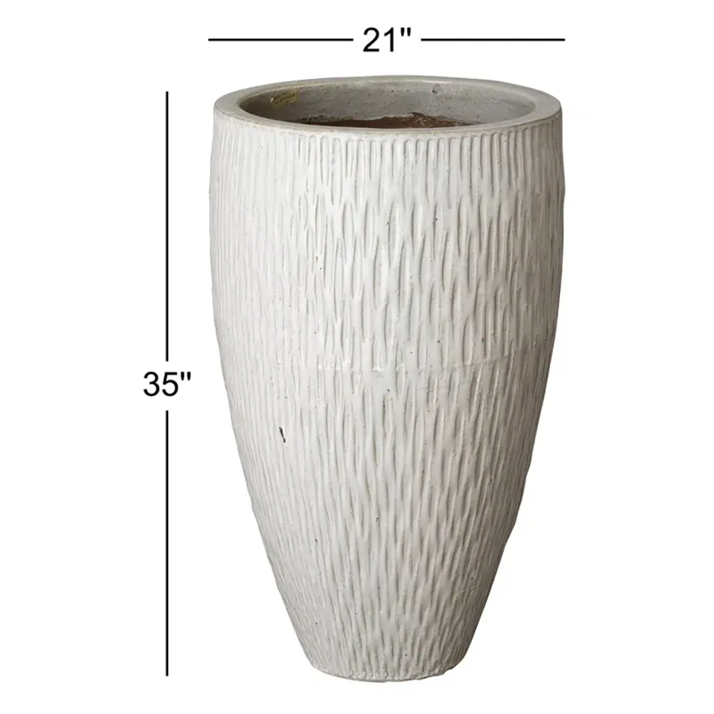 This Tall Round Textured Planter is crafted of ceramic with a Distressed White glaze. Suitable for outdoor and indoor use. Adds color and texture to your home or garden.