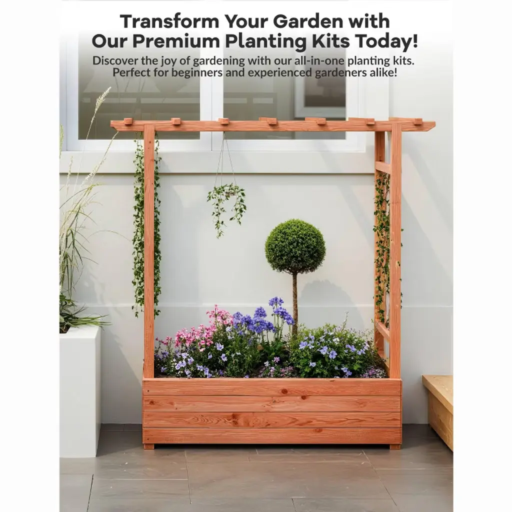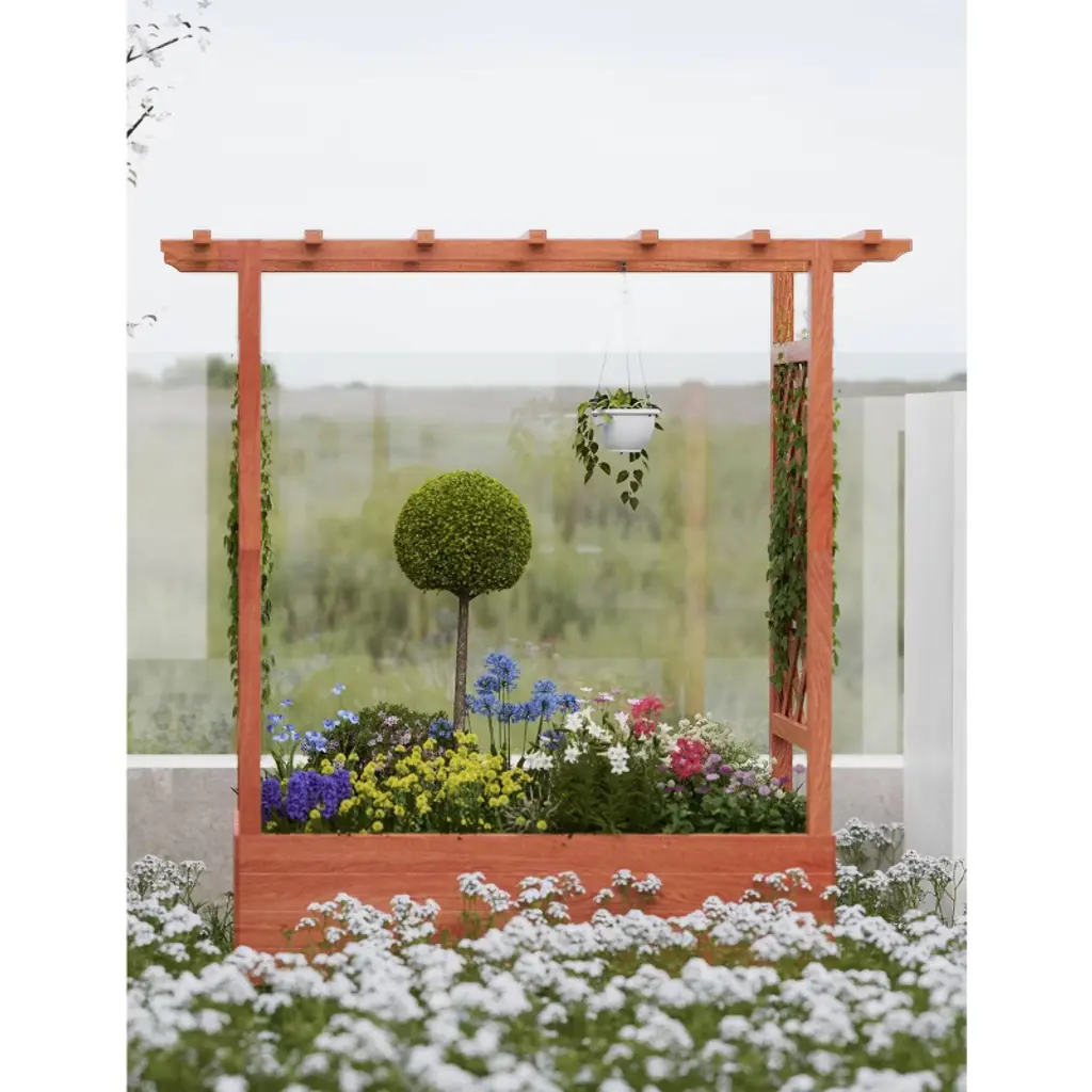 This raised garden bed features a spacious planting area with integrated roof trellis and dual side trellises, perfect for vegetables, herbs and climbing plants. The elevated design includes side supports and decorative hanging roof for lights or baskets, combining functionality with aesthetic appeal in one compact unit.