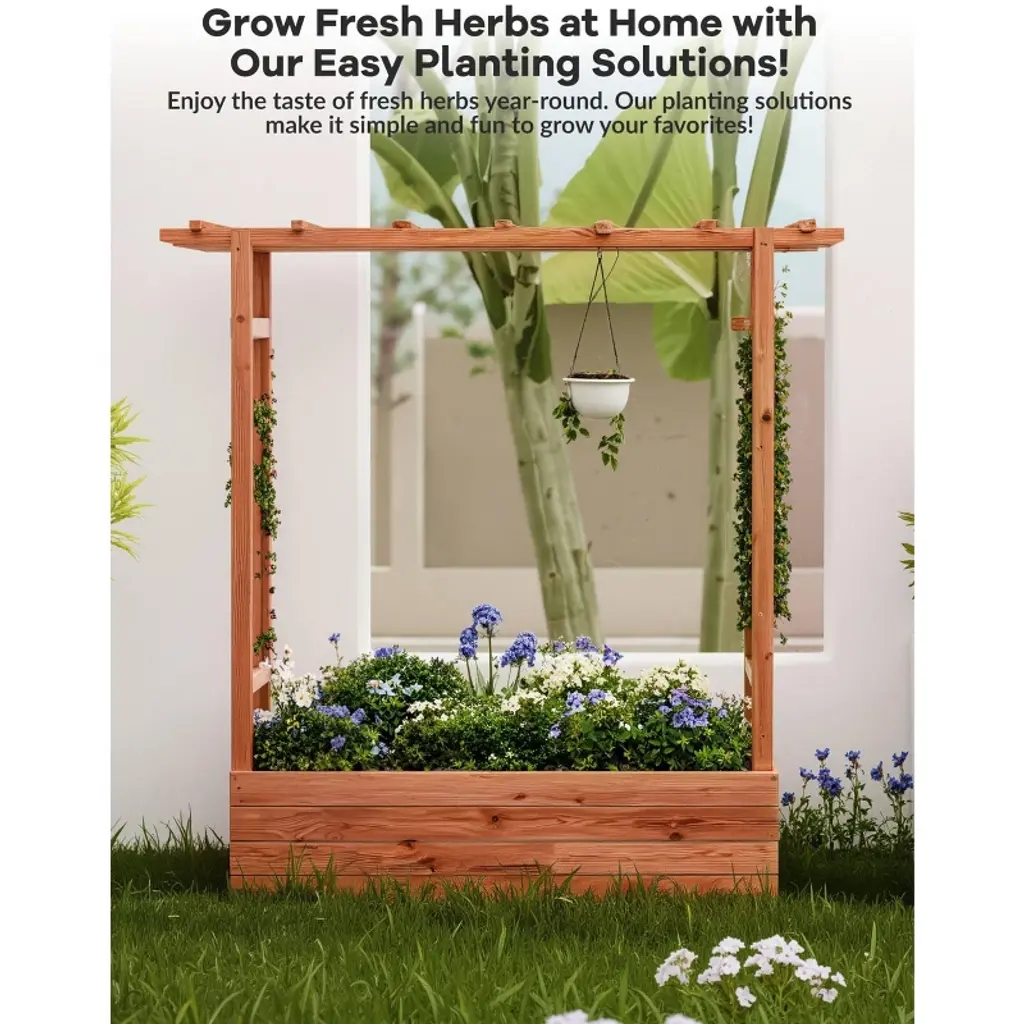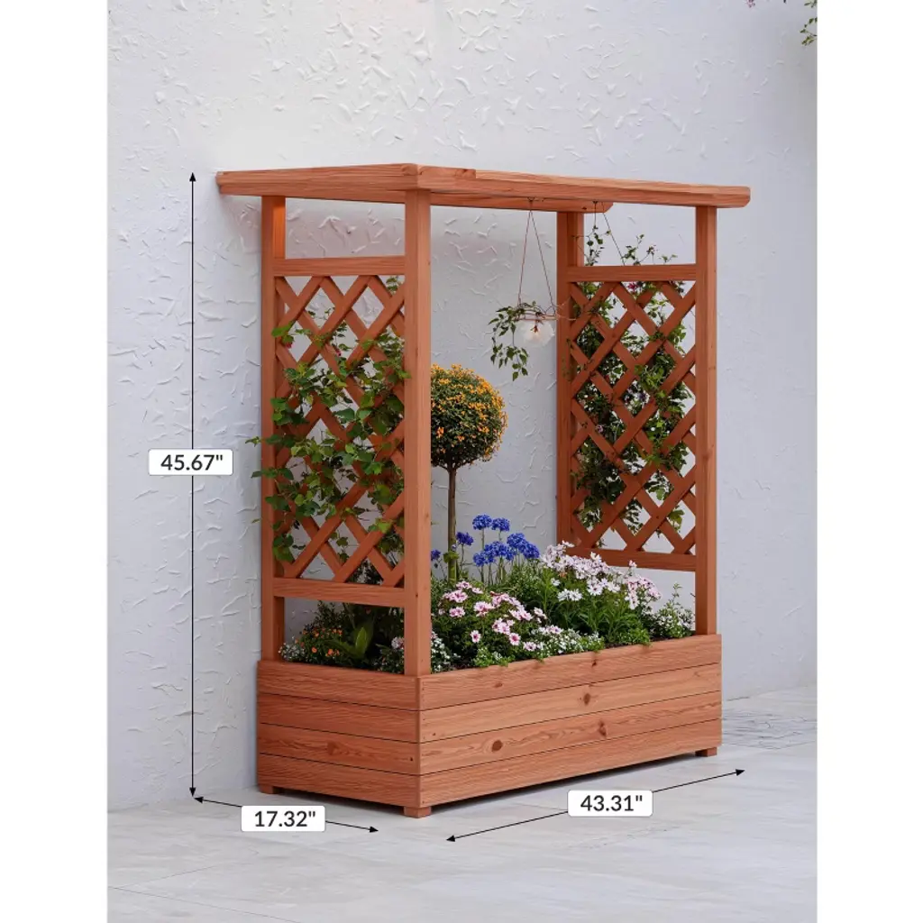 Gustowave Elevated Garden Bed With Arch Trellis & Hanging Roof For Vine Climbing Plants, Wood Planter Box With Hanging Roof, 43x17x45inch
