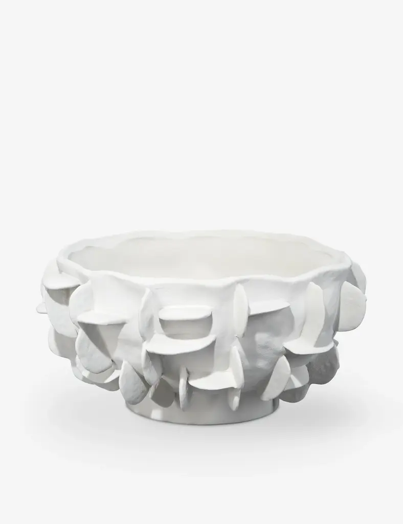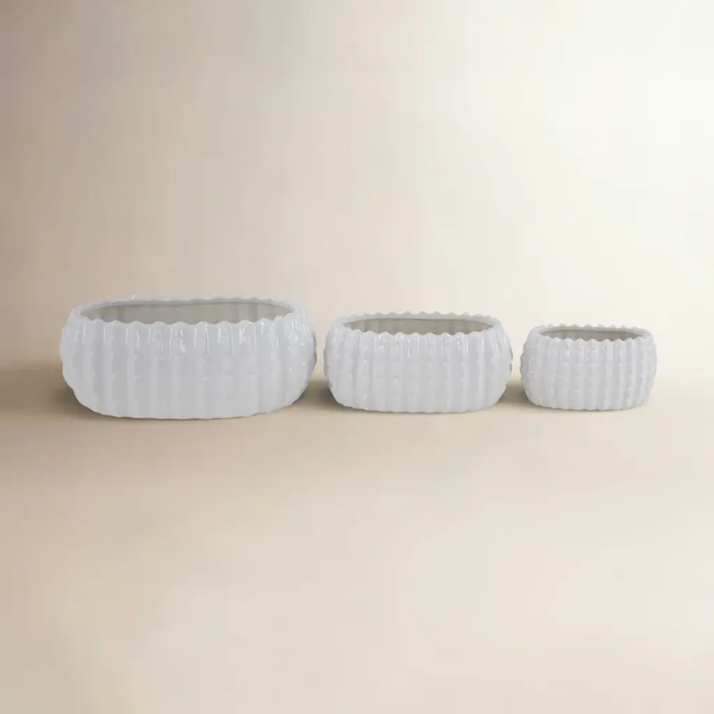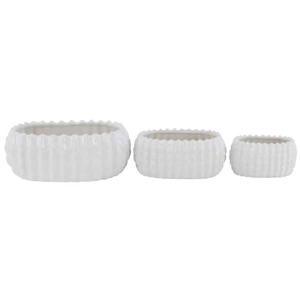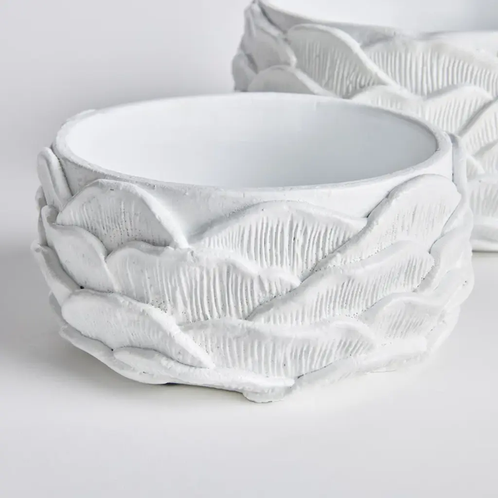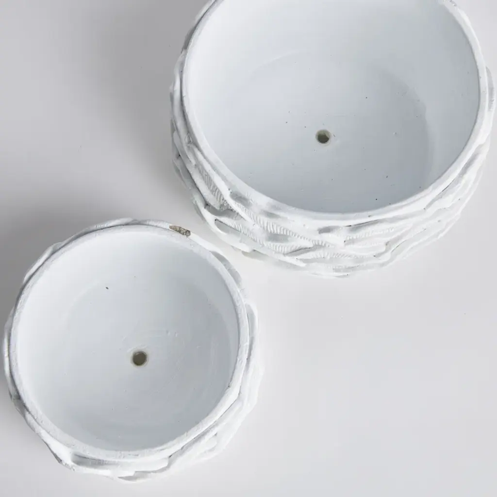 The oversized, layered petals that adorn this set of pots give it an artisan feel. The bright white glaze and hand finished touches make it a great value. Fill it with lush greens or a prized orchid and enjoy!