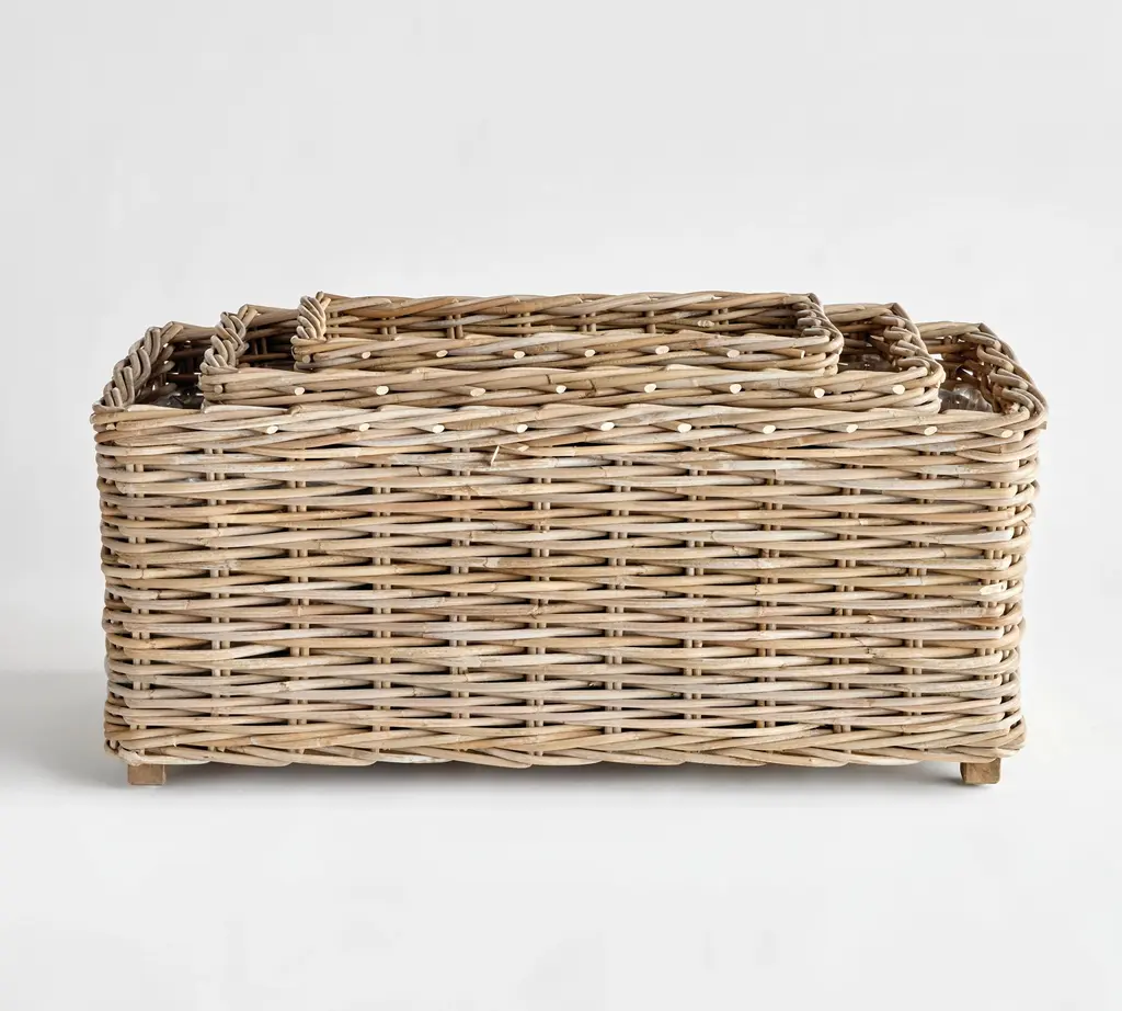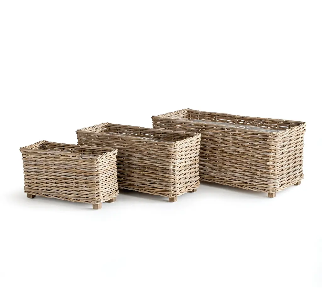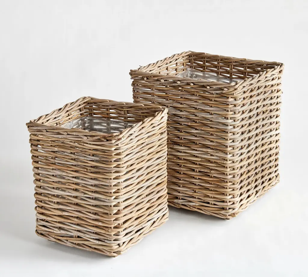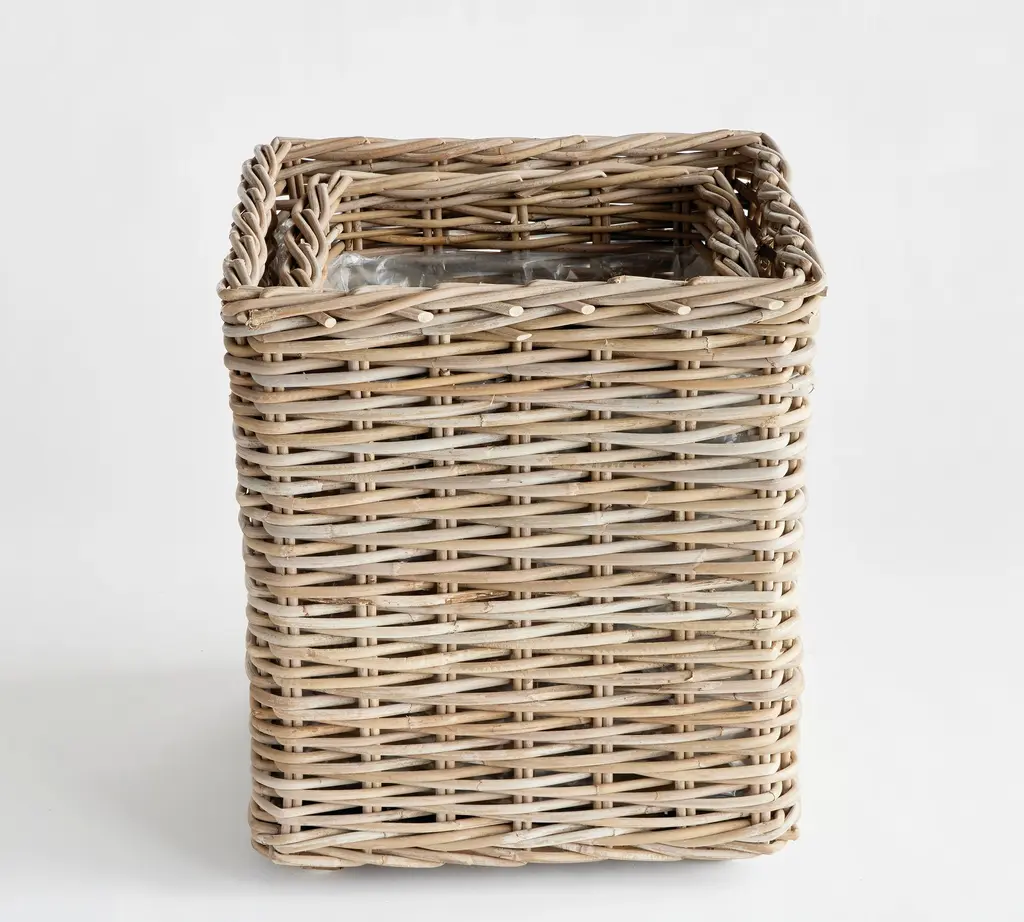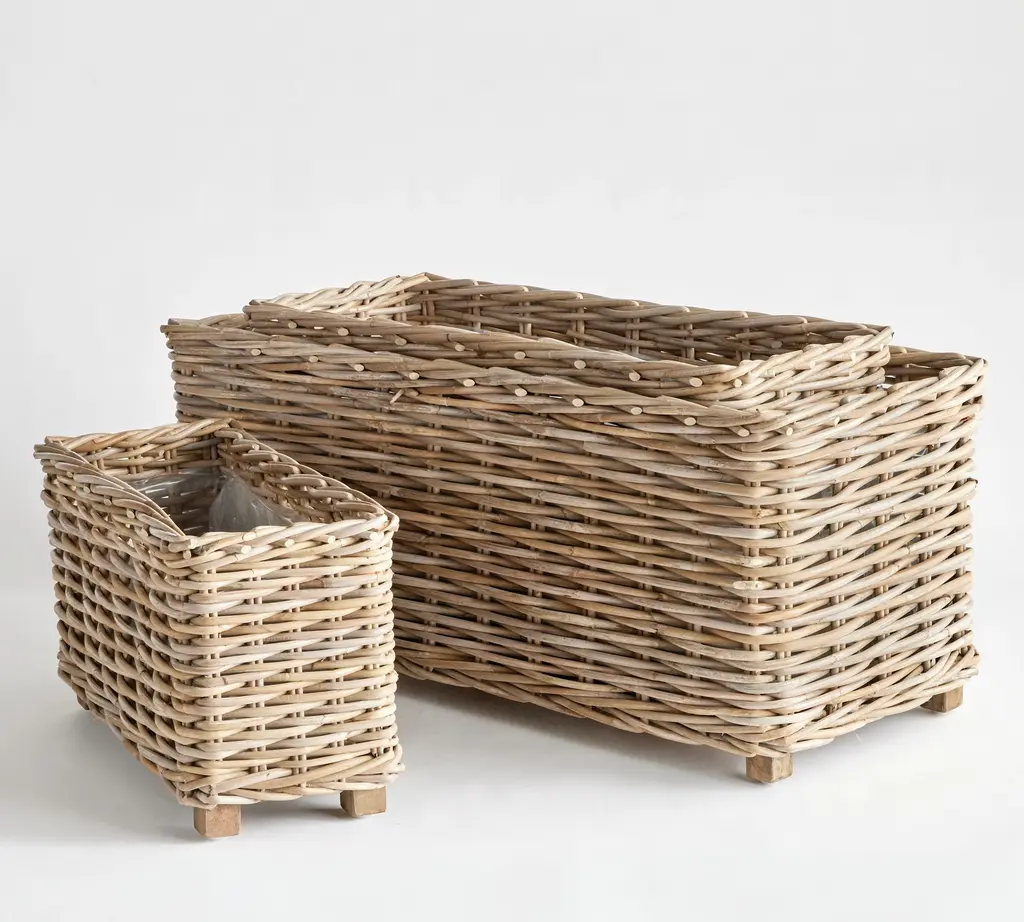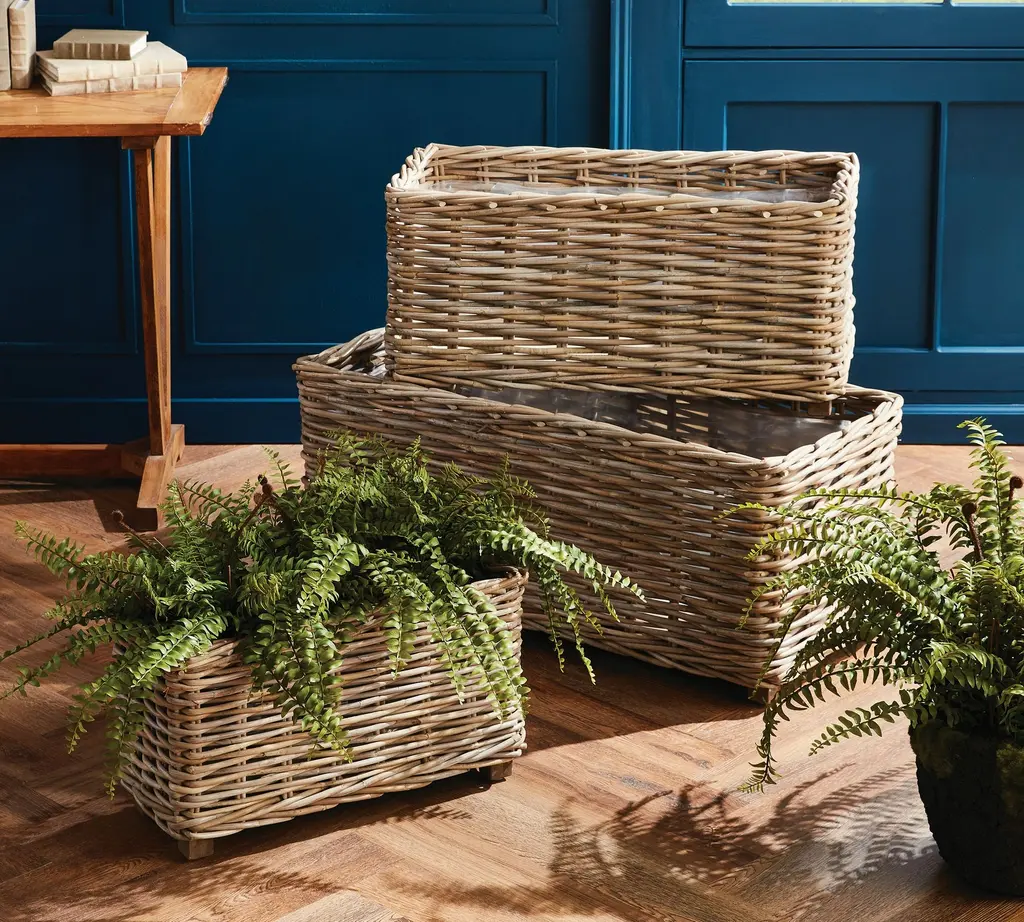 The warm, heirloom quality of wicker is a perfect complement to your plants. Each is designed with a solid wood frame for stability and elevation, complete with plastic liners to keep it clean and dry.
