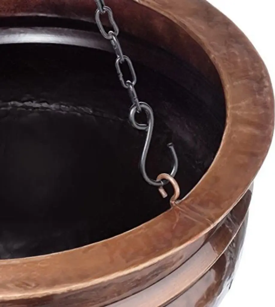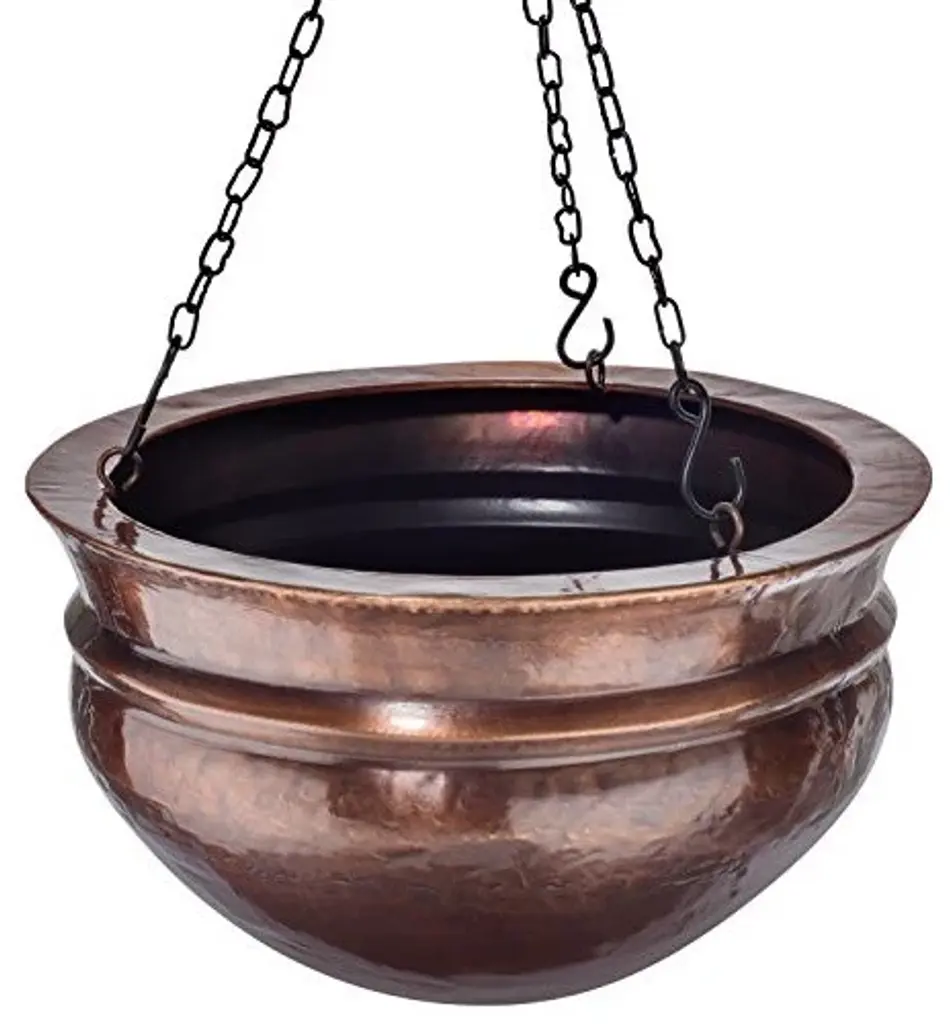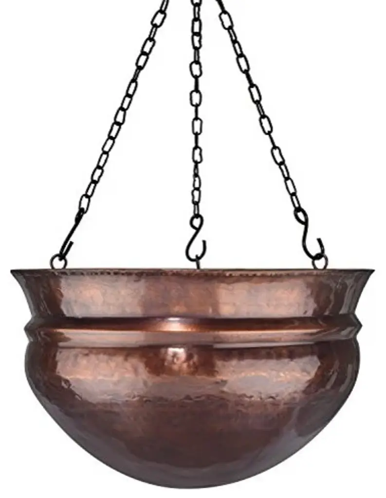 HEAVY AND DURABLE CONSTRUCTION "“ Brass planter pot with hand-applied antique copper finish built to last. Includes heavy duty black chain with S hooks. Top of the chains are joined by a ring. Drainage hole in base of metal planter pot. The design of this outdoor planter is modern with a timeless feel. Place outdoors on your patio, deck, or balcony. Sold as a single, but also great in pairs or multiples.ROUND PLANTER - MINIMALIST STYLE "“ The round planter pot measures 16 inches diameter at widest and 9 to 9.5 inches from top to bottom of the planter. Item are hand-crafted and hand-hammered. Items are hand-crafted and many vary slightly in size due to being handmade. This planter garden box will make an eye-catching focal point and impressive statement wherever it"™s placed. Unique and sturdy.ELEGANT STYLE FOR ALL SEASONS - Built to last, use with any seasonal décor. Stunning filled with flowers and greens. Easy to update and freshen your holiday decor. Try a color theme this season and a texture theme next month. Simple enough to blend with any outdoor theme. Trending now, the rich antique copper finish adds earthy warmth to your traditional or modern home.PLANTERS WITH PERSONALITY "“"“ Plants not only promote a healthy home environment but can offer a touch of elegant beauty to your home and garden. Uniquely designed with a heavy, durable construction, the H Potter hanging succulent planter is the perfect accent for alfresco dining and outdoor living. Tranquility of greenery is an ideal mood setter and stress reliever, this gardening planter is the perfect size to fit nearly any location and can be moved easily.QUALITY BY H POTTER "“ H Potter has been designing and manufacturing premium quality garden products for over 20 years. We do not pretend to be the cheapest, but you get what you pay for. Packaged well, with stunning craftsmanship and backed by great customer service, we"™re proud to say our garden products are built to last. If you"™re looking for something memorable, this beautiful round planter would make a perfect wedding decoration or birthday gift idea.