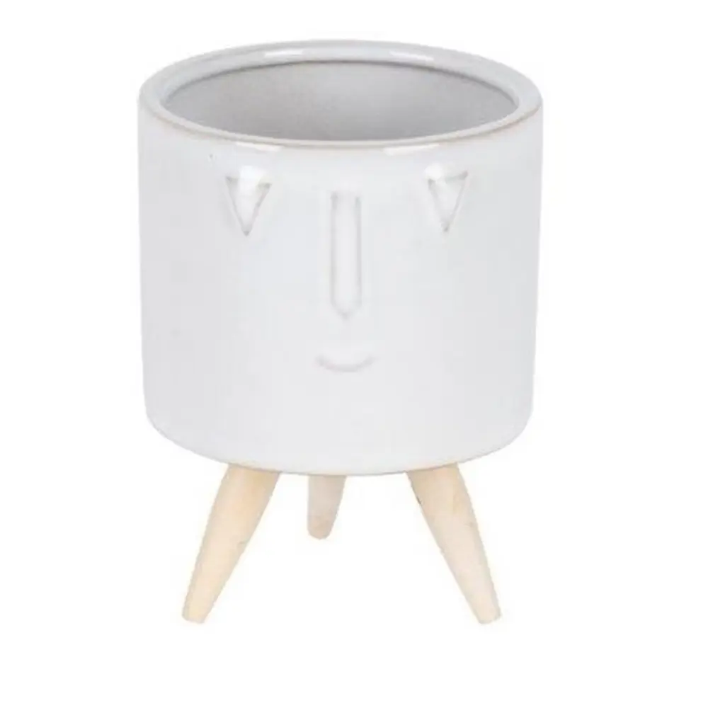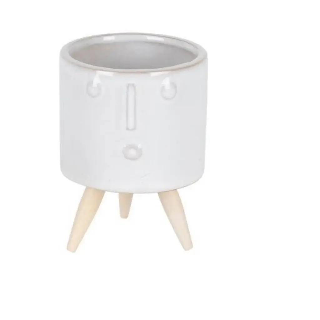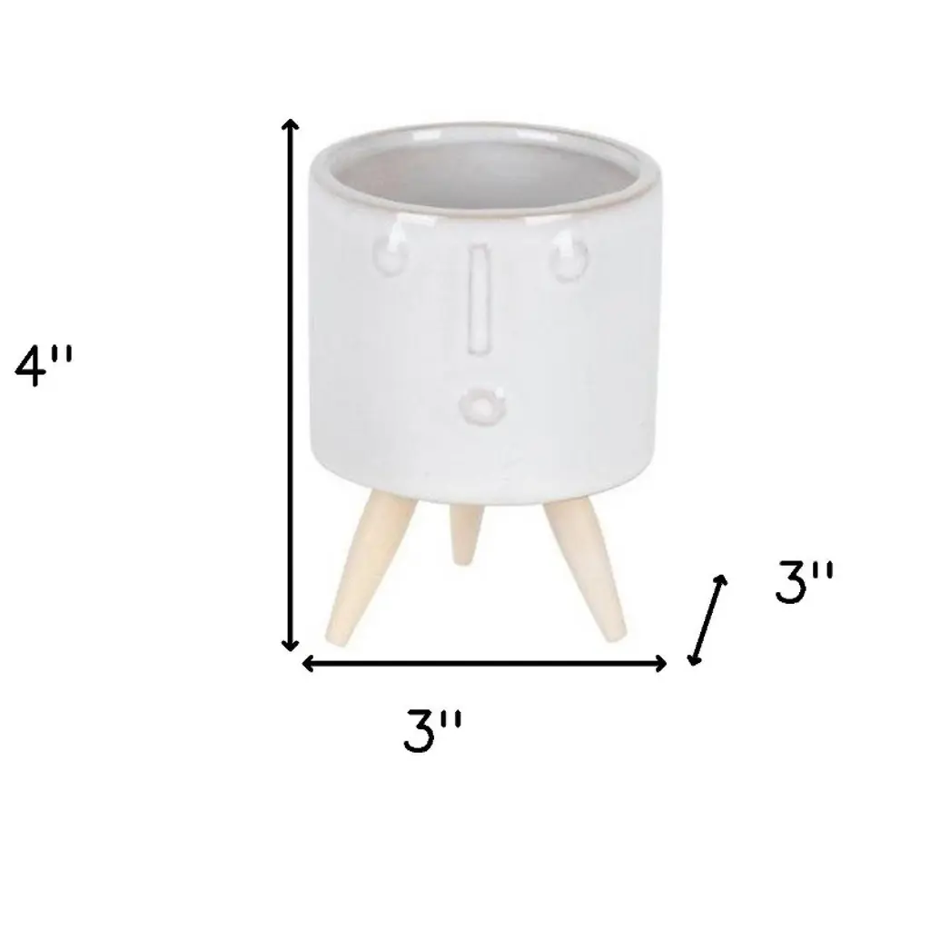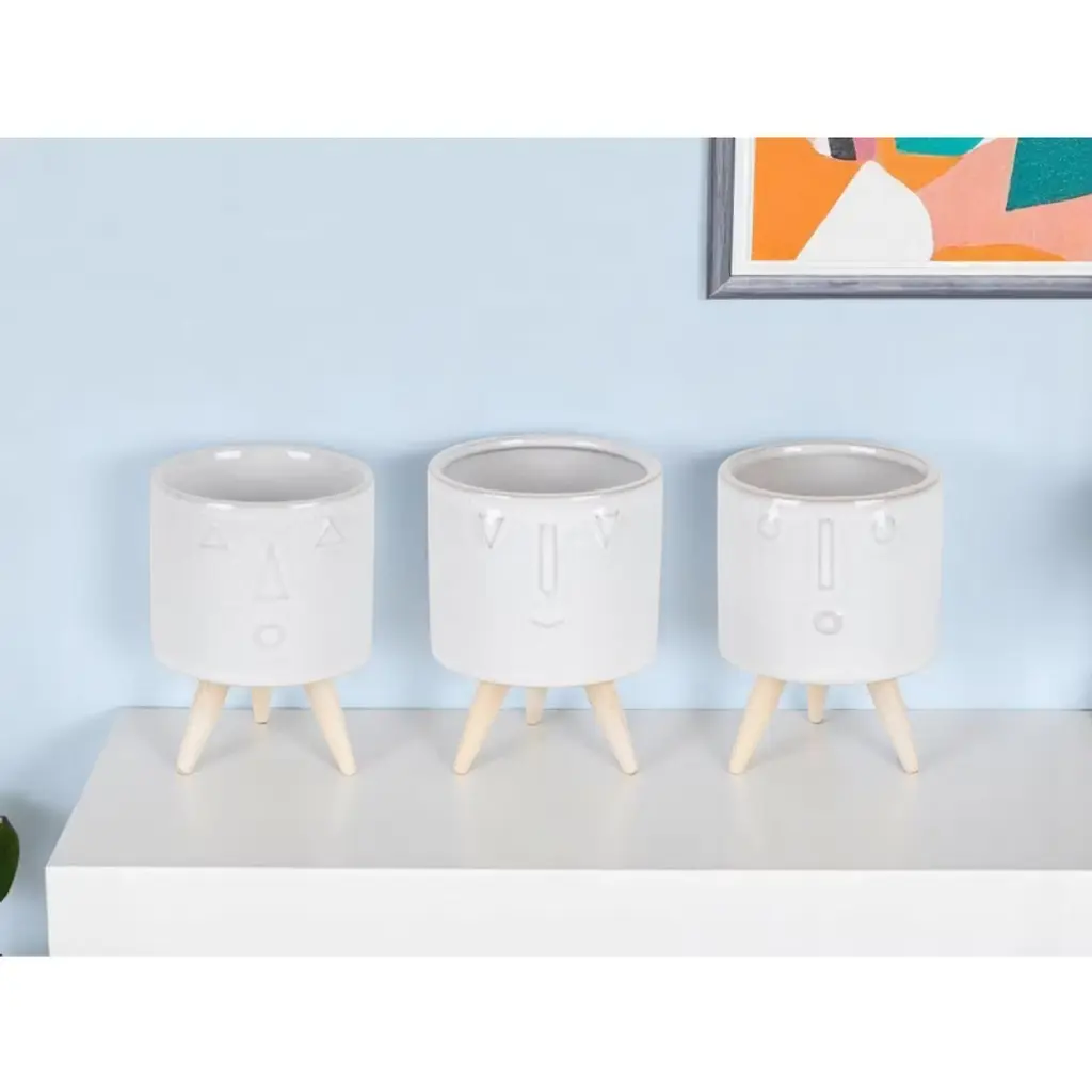 Set of three white porcelain 1 ounce round funny face pot planters with stands brings a delightful touch to your indoor space. Crafted from high-quality porcelain, these pot planters showcase a modern aesthetic that fits effortlessly into any décor. Each planter features a unique funny face design, adding a playful element to your home. Perfect for small plants or succulents, these planters each have three wooden legs and are finished with a creamy white reactive glaze. With three planters included, you can create a cohesive display on shelves, tables, or windowsills, enhancing your indoor gardening experience while infusing character into your living environment. 4-inch h x 3-inch w x 3-inch d.