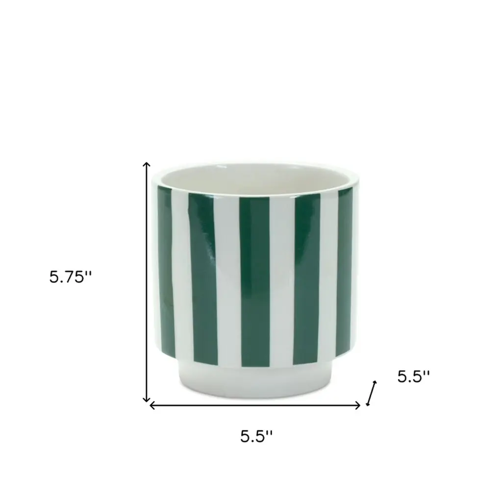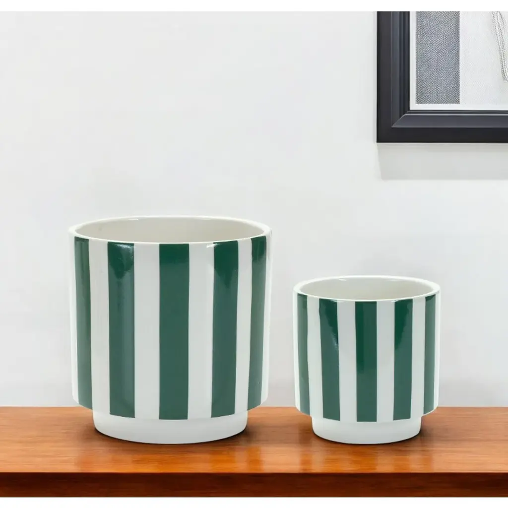 Set of two green and white dolomite striped 4 ounce round pot planters brings a fresh touch to any indoor space. These round planters are designed to elevate your home decor while showcasing your favorite plants. With a generous capacity they provide ample room for growth and display. Crafted from durable dolomite, these planters combine practicality with style, ensuring longevity. Their modern design features a chic green and white striped pattern, making them an eye-catching addition to your living area or office. This set includes two planters, perfect for creating a cohesive look in your home environment. 5.75-inch h x 5.5-inch w x 5.5-inch d.