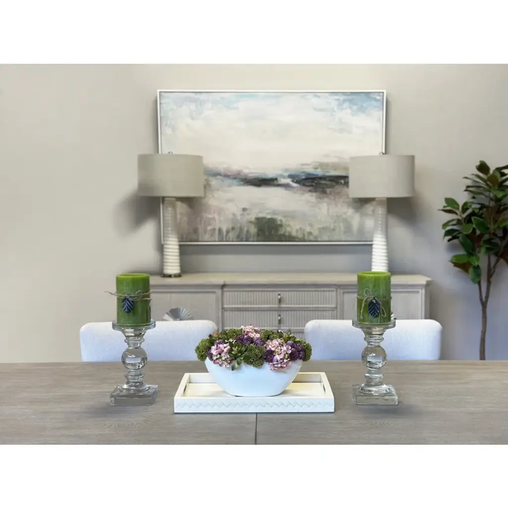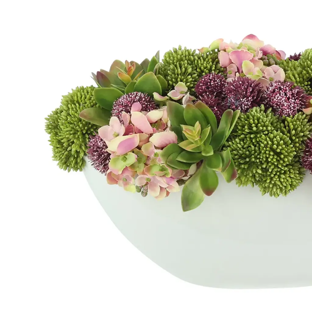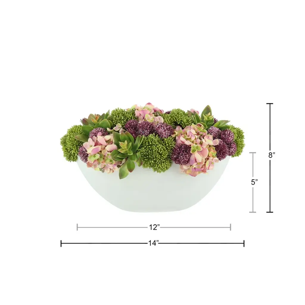 Welcome the beauty of nature indoors with this stunning succulent floral arrangement! Featuring a mix of pink, purple, and green faux succulents, hydrangeas and pompoms, this arrangement will bring a charming botanical element to your space. The white fiberstone planter provides the perfect contrast to the vibrant colors of this maintenance free floral. It arrives ready to be displayed and enjoyed for years to come!