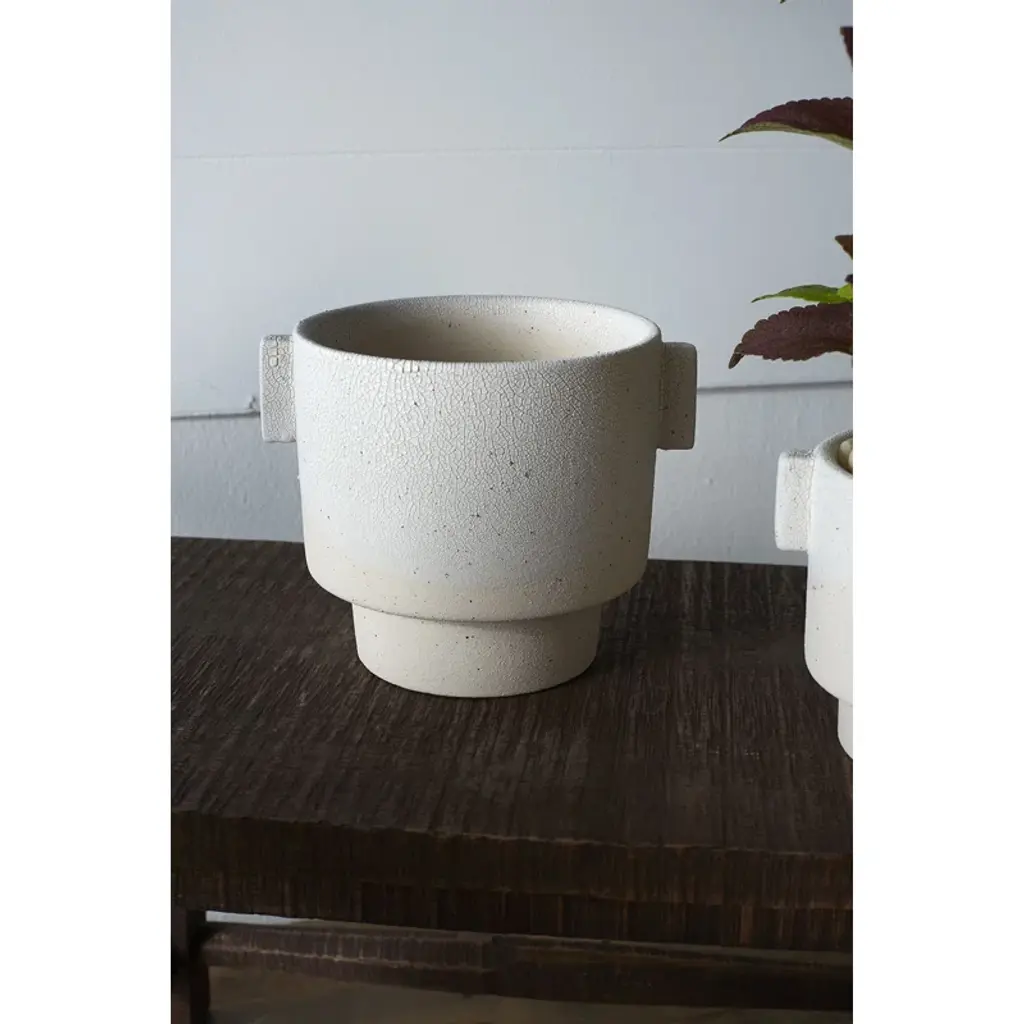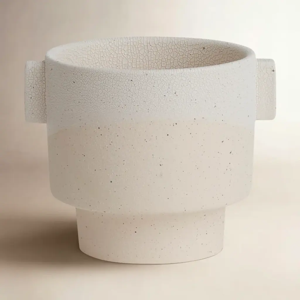 The Iberia pot is a uniquely modern-shaped container with a beautifully layered tone-on-tone textured finish. The top portion of the pot features a white crackled glaze and rectangular handles on either side, while the footed base has a naturally speckled bisque.
