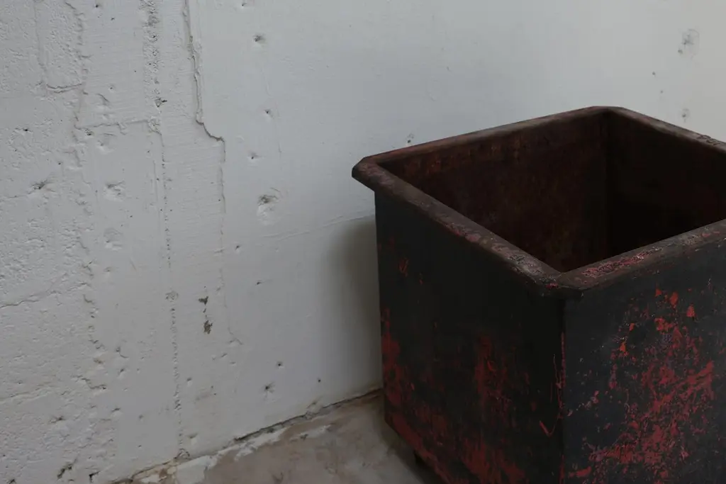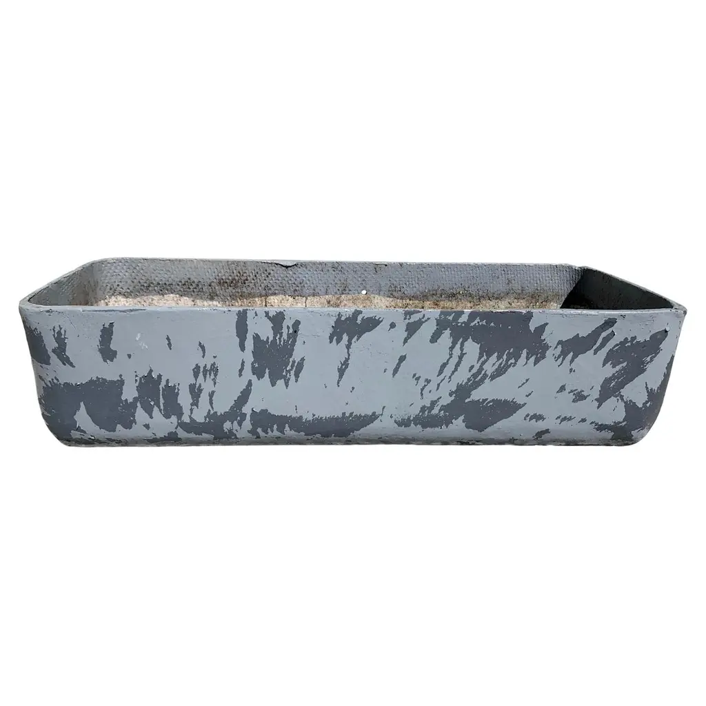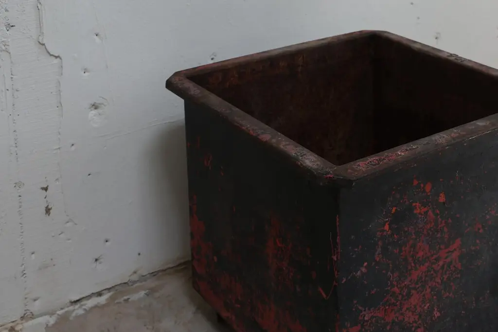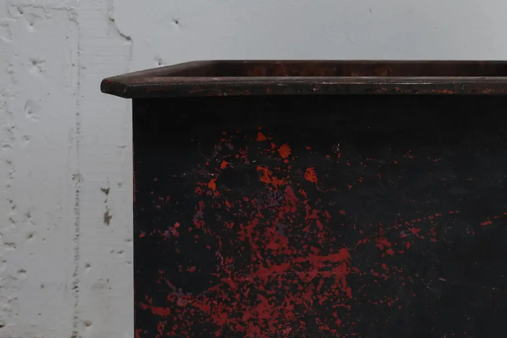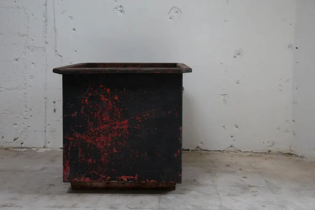 An exceptional mid-20th century industrial iron planter, salvaged from a European factory where it once served as a utilitarian vessel for holding raw materials and/or scrap metal during the height of post-war industrial production. Its robust, welded construction and heavy gauge is typical of that time period. The surface showcases decades of authentic wear, with layers of distressed black paint revealing deep traces of burnt red underneath. This creates a painterly, almost abstract composition that truly is what sets this piece apart from most. Today, it stands as a sculptural object, rich in history and visual intrigue. Whether repurposed as a planter, storage piece or simply admired for its raw beauty, it makes a strong statement in any interior or garden setting.