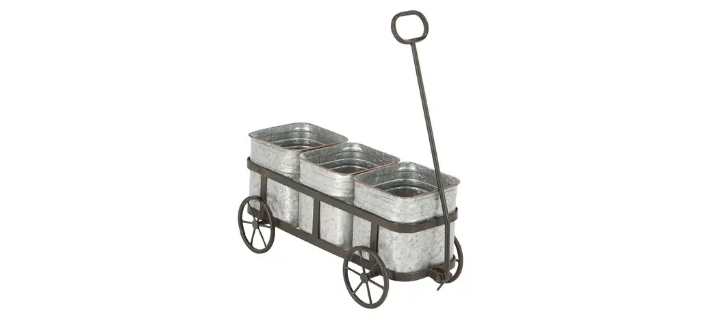 Measures 10.25-Inches high and 13-Inches wide and 19.25-Inches deepFull-metal construction is strong and durable, and the roomy wagon compartment can hold virtually anything that fits as a charming display.Flowers and greenery shown in product images are for illustration only; your wagon will arrive ready to fill with your plants or decor items of choice.Bringing together the nostalgic, rustic charm of a classic child''s pull-along wagon with captivating tabletop decor, our all-metal Wagon Planter is a delightful addition to your home. This whimsical design showcases a playful silhouette, complete with smaller spoked wheels in the front and larger ones at the back, as well as the iconic pull handle on the front spoke. The interior of the wagon offers a charming space for displaying dried or silk flowers, decorative items, or even serving as a catchall for small essentials like spare change and keys when placed on a hall table. With its galvanized tin finish and brown trim, this wheeled planter exudes an aged, rustic look that pairs beautifully with vibrant floral arrangements. Measuring 10.25 inches in height, 13 inches in width, and 19.25 inches in depth, it''s a versatile and eye-catching piece that adds a touch of playful nostalgia to your decor.