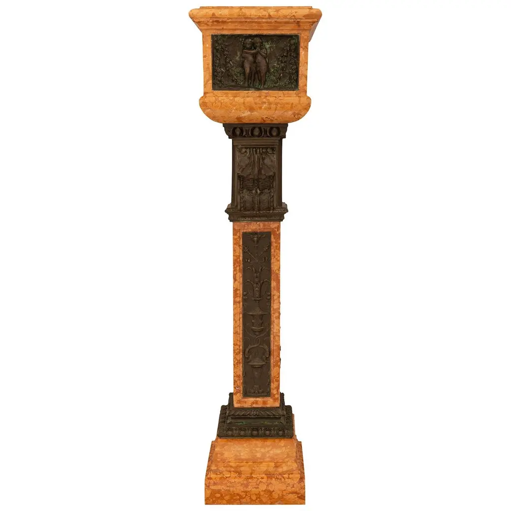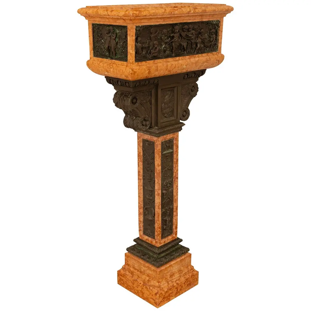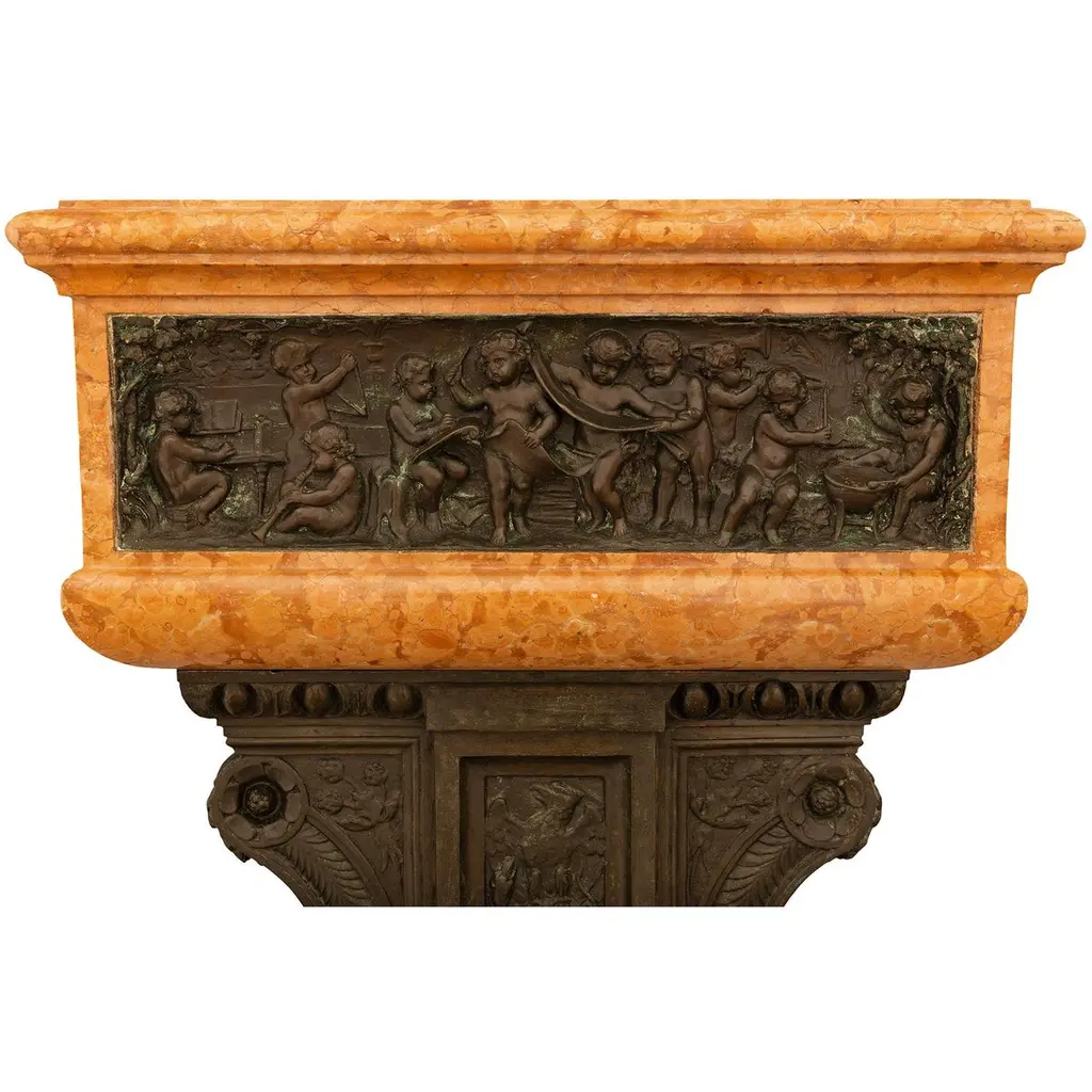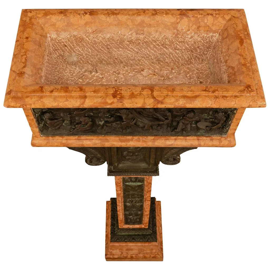 An attractive and most impressive Italian 19th century Louis XVI st. Rosso Verona marble and Verdigris Bronze birdbath/planter. This beautiful planter is raised by a squared marble shaft with patinated Bronze panels on each side and supported on a square stepped marble base below. Each panel on the shaft contains most charming figures including scrolling cornucopias, male masks, seashells, and maiden busts atop hoofed feet being flanked by dolphin heads. Above the shaft of this unique planter is an ionic style patinated Bronze capital decorated by a central panel of an eagle with open wings which is flanked by two foliate and rosette designed curved sides. Atop the Ionic capital sits the rectangular mottled edge marble planter which has patinated Bronze and Verdigris panels on each side. Each panel depicts joyous and fun loving cherubs playing musical instruments and dancing around in what looks like a celebration, in the manner of Clodion.