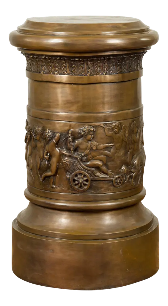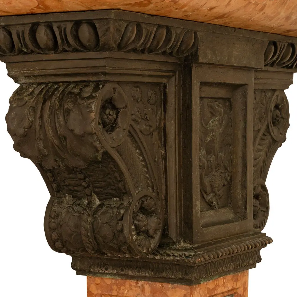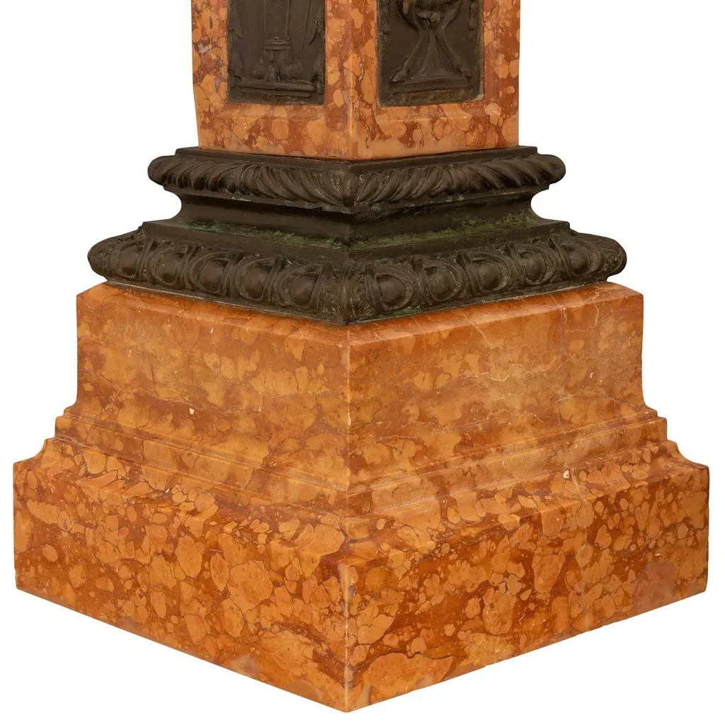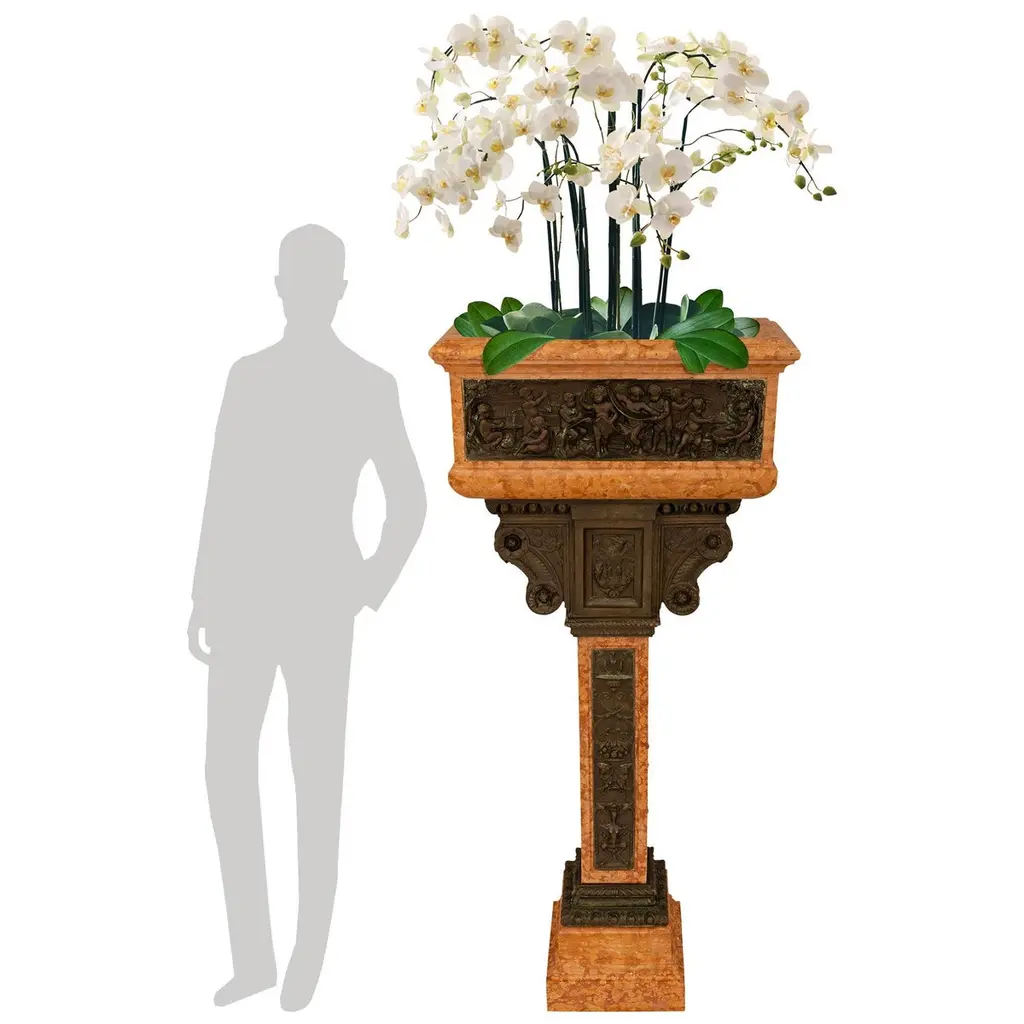 An attractive and most impressive Italian 19th century Louis XVI st. Rosso Verona marble and Verdigris Bronze birdbath/planter. This beautiful planter is raised by a squared marble shaft with patinated Bronze panels on each side and supported on a square stepped marble base below. Each panel on the shaft contains most charming figures including scrolling cornucopias, male masks, seashells, and maiden busts atop hoofed feet being flanked by dolphin heads. Above the shaft of this unique planter is an ionic style patinated Bronze capital decorated by a central panel of an eagle with open wings which is flanked by two foliate and rosette designed curved sides. Atop the Ionic capital sits the rectangular mottled edge marble planter which has patinated Bronze and Verdigris panels on each side. Each panel depicts joyous and fun loving cherubs playing musical instruments and dancing around in what looks like a celebration, in the manner of Clodion.