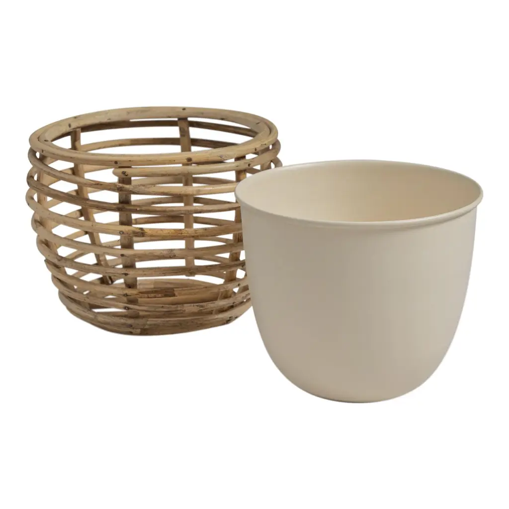 Ivory Metal Planter With Rattan Cane Stand