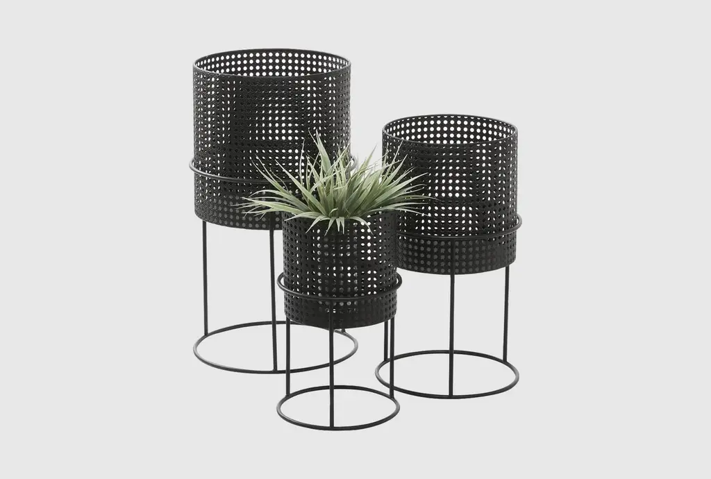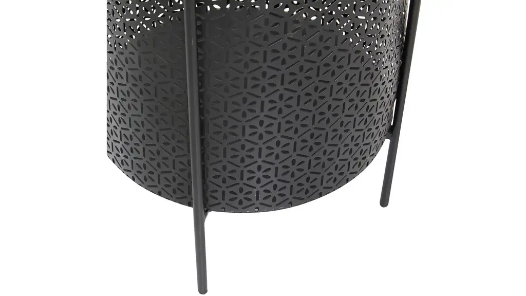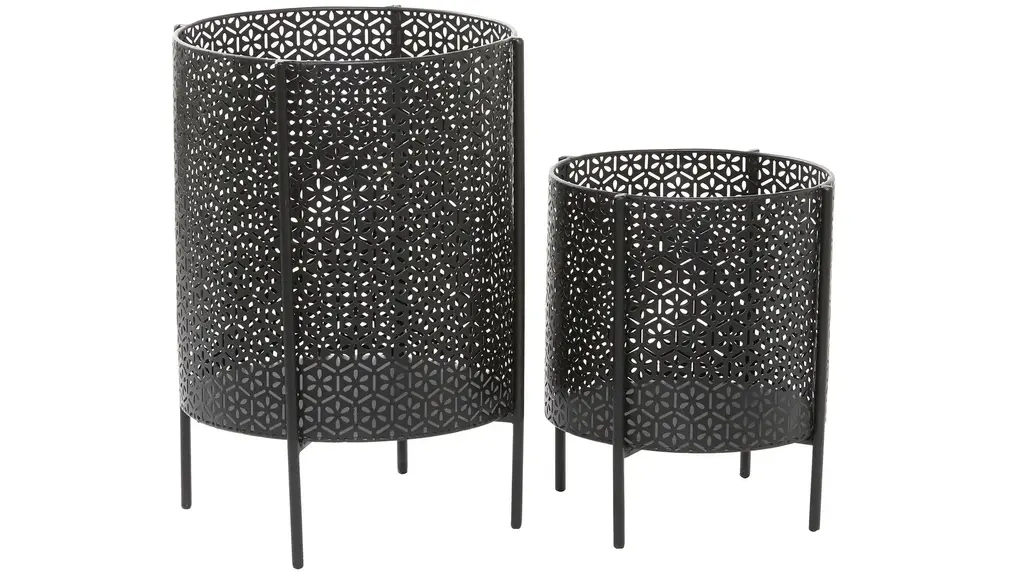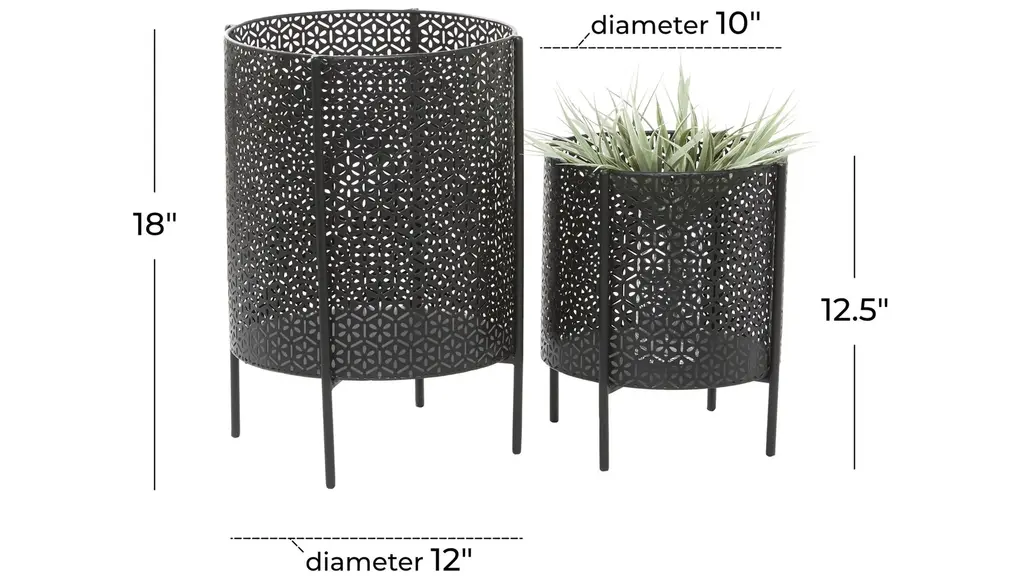 Add this luxurious Ivy Collection CosmoLiving by Cosmopolitan Black Metal Planter Set of 2 to your laid-back living space and experience elegance with a carefree vibe. This metal crafted mesh planter features floral cut out design forming the unique appeal of this piece. The beautiful black finish of the cylindrical mesh complements well with the black finish of its 4 legs. Place this on any corner of your living space and get that instant green escape whenever you need it in your boho style home. Suitable for indoor and outdoor use. No drainage holes.