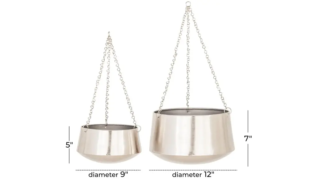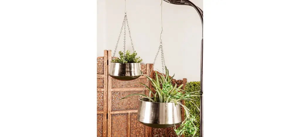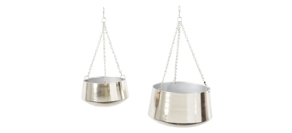 Verdant plants and flowering shrubs provide serene respite in these hectic times, housed beautifully in the Ivy Collection Mamoru Planter Set of 2. Crafted from metal and featuring round-shapes, these hanging plant holders elevate the look of modern and glam themed homes and gardens. The planters have a sleek silver finish and feature shiny chain hangers, fully heightening its stylish look. Wipe clean with a dry cloth. Suitable for indoor and outdoor use. No drainage holes.