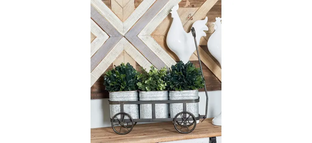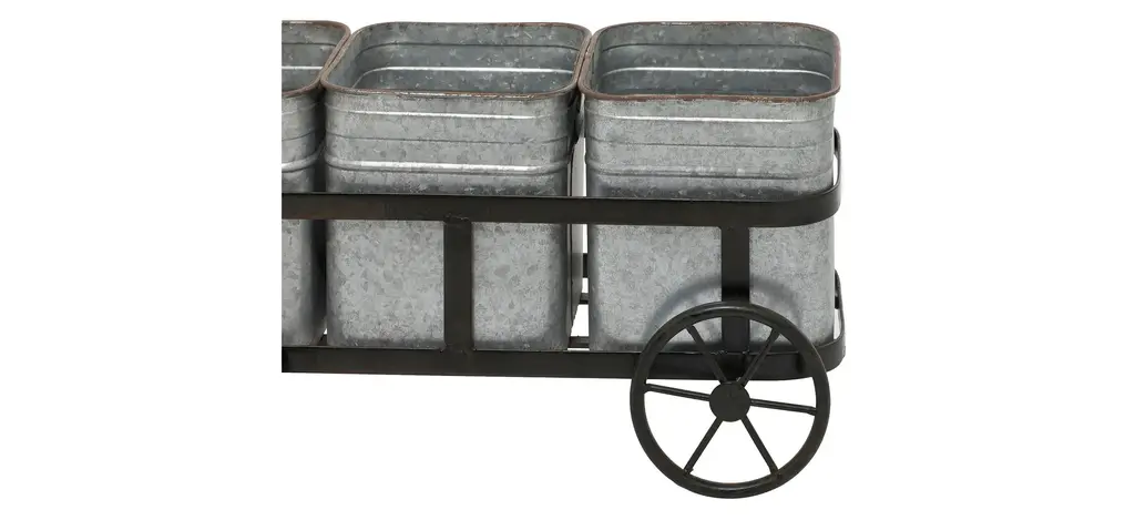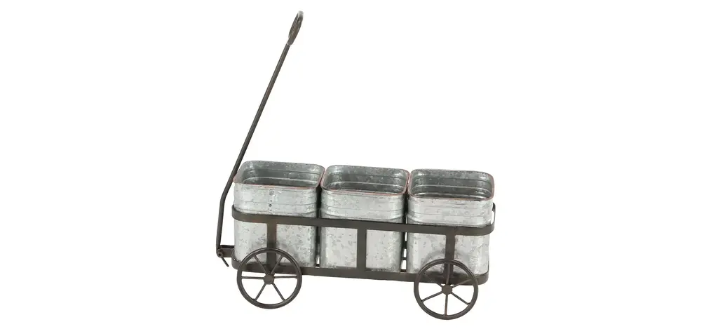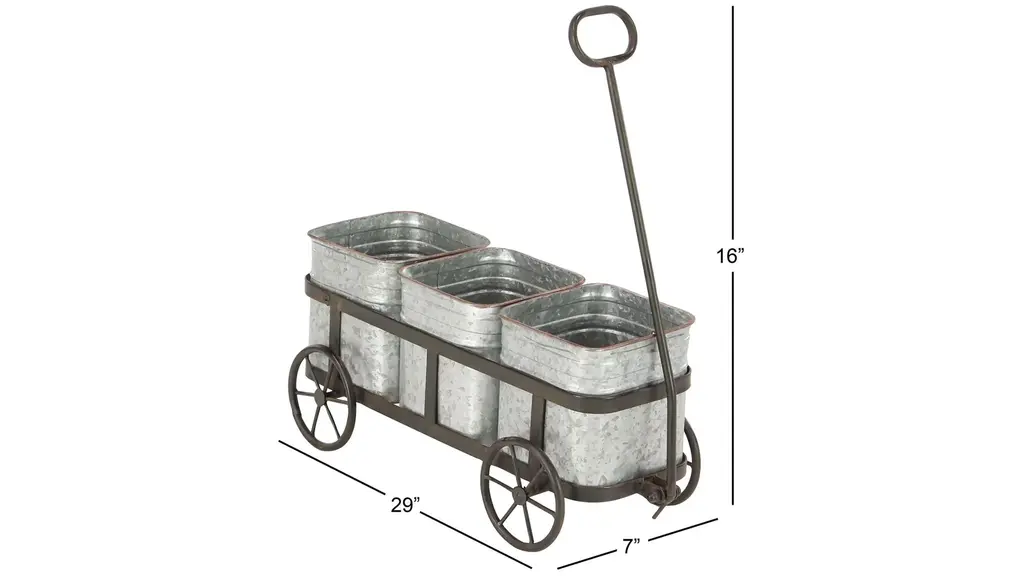 Full of Farmhouse charm, this Ivy Collection Mhoireach Planter features three galvanized metal plant boxes nestled in a decoratively rusted dark brown metal wagon planter. Easily pull this outdoor planter to your desired spot by the long metal handle, which also adds a decorative accent. A decorative garden piece that fits an Old English or traditional landscape design. Wipe clean with a dry cloth. Suitable for indoor and outdoor use. No drainage holes.