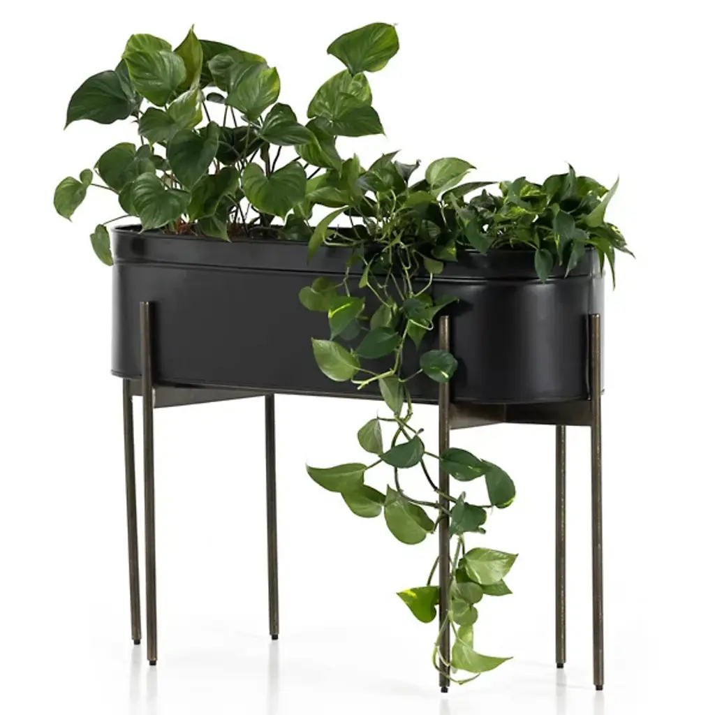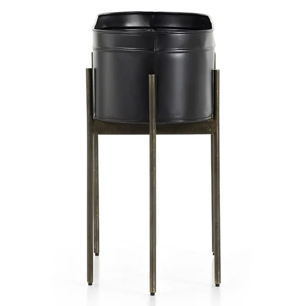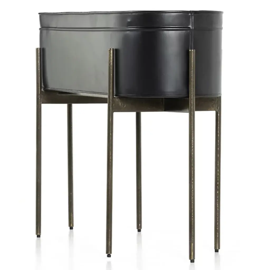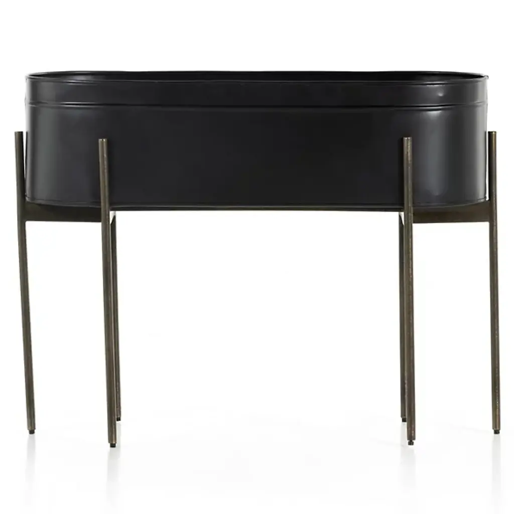 The Jed Large Outdoor Planter by Four Hands features six slim, dark brass-finished iron legs supporting an inset oval planter. Made in India and featuring a contemporary flair, it suggests a rustic modern aesthetic perfect for outdoor spaces. A plastic plant liner is recommended for longevity, ensuring durability and ease of maintenance, while the overall design delights with dramatic visual contrasts.