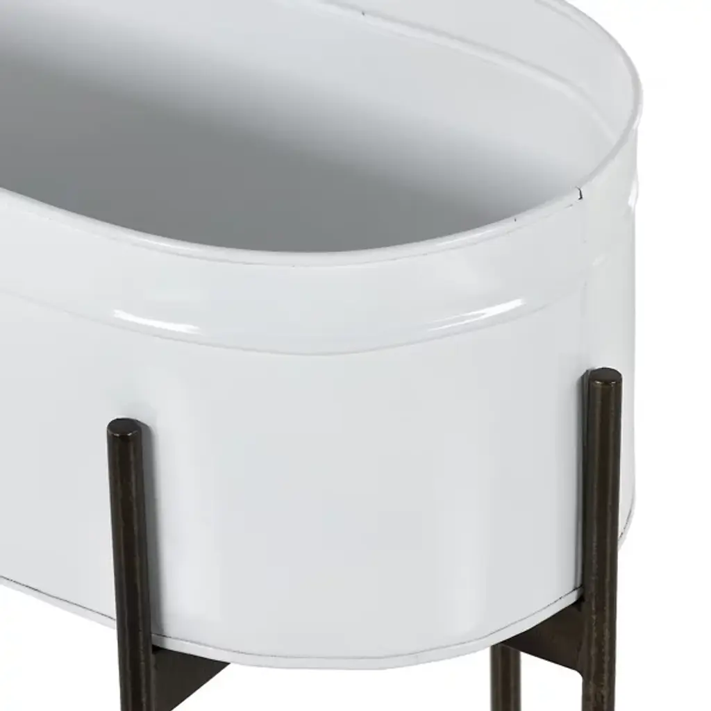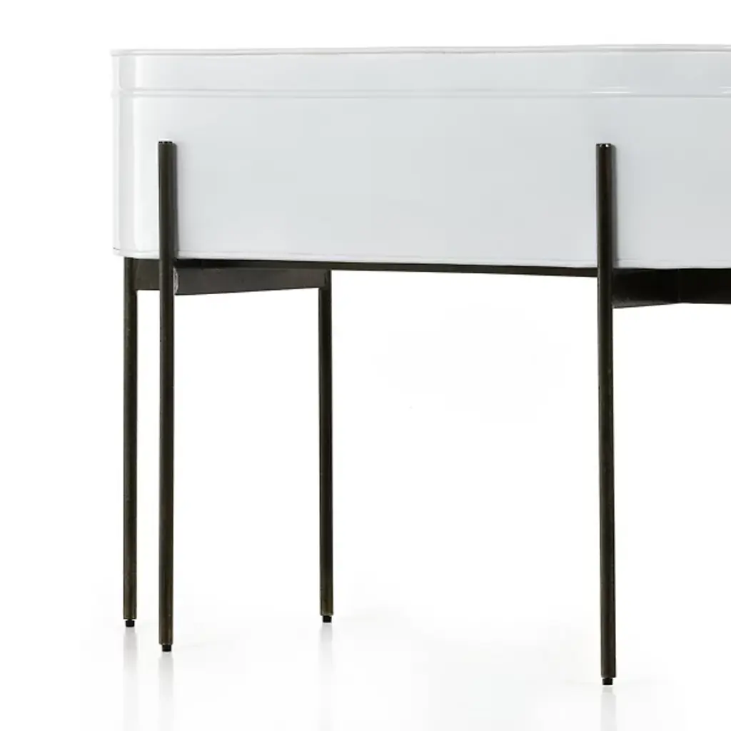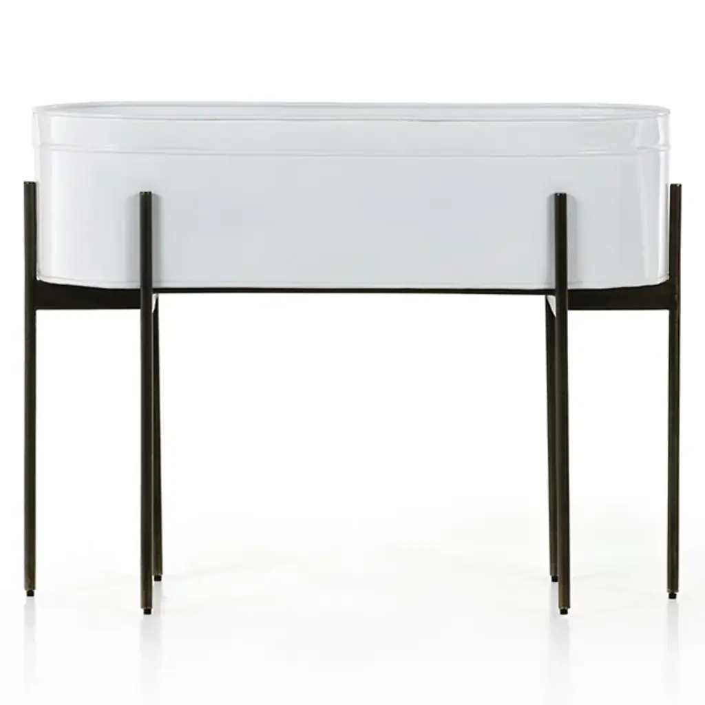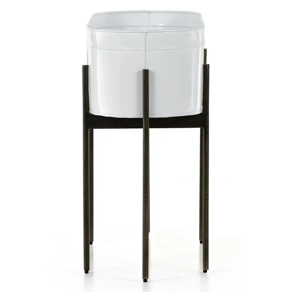 The Jed Large Outdoor Planter by Four Hands features six slim, dark brass-finished iron legs supporting an inset oval planter. Made in India and featuring a contemporary flair, it suggests a rustic modern aesthetic perfect for outdoor spaces. A plastic plant liner is recommended for longevity, ensuring durability and ease of maintenance, while the overall design delights with dramatic visual contrasts.