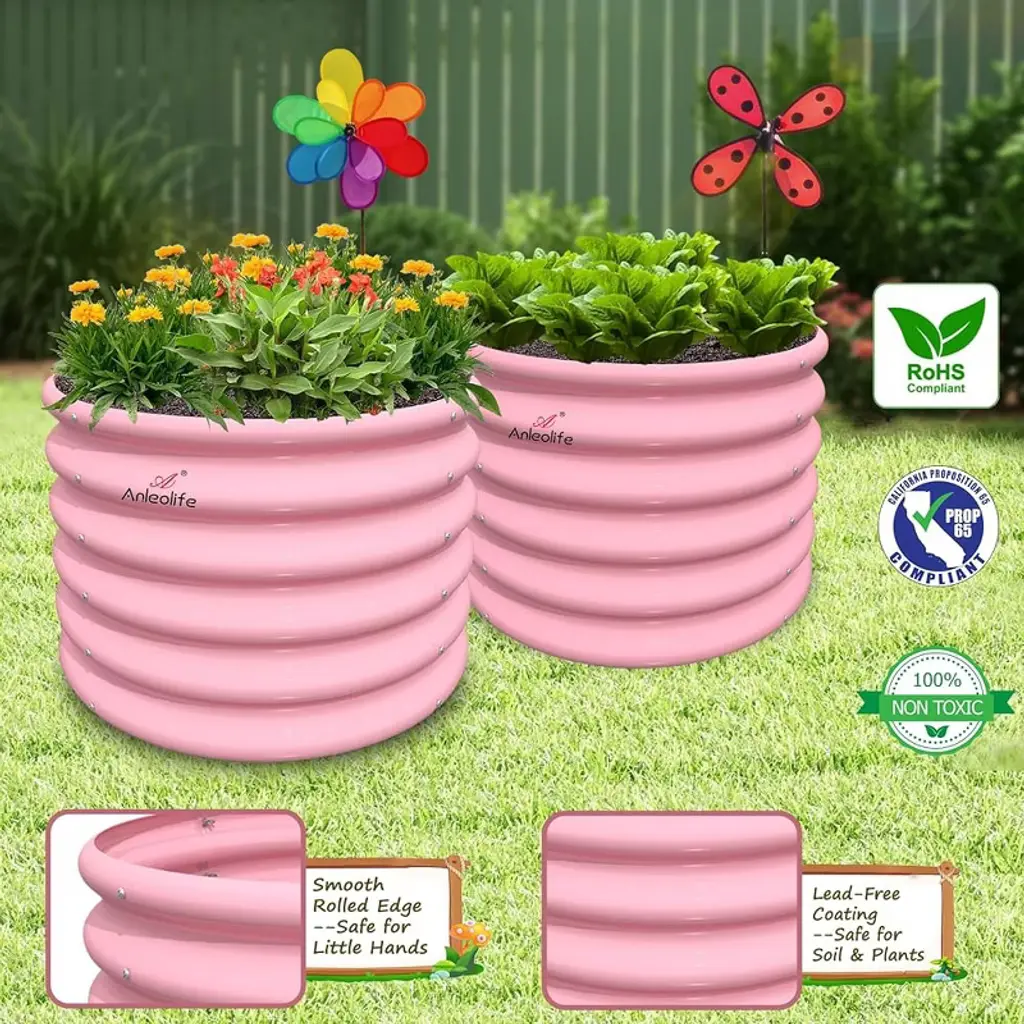 Jujabu 4-pack Kids Raised Garden Beds – 24"x24"x18" Round Blush Pink Galvanized Planters For Veggies & Flowers