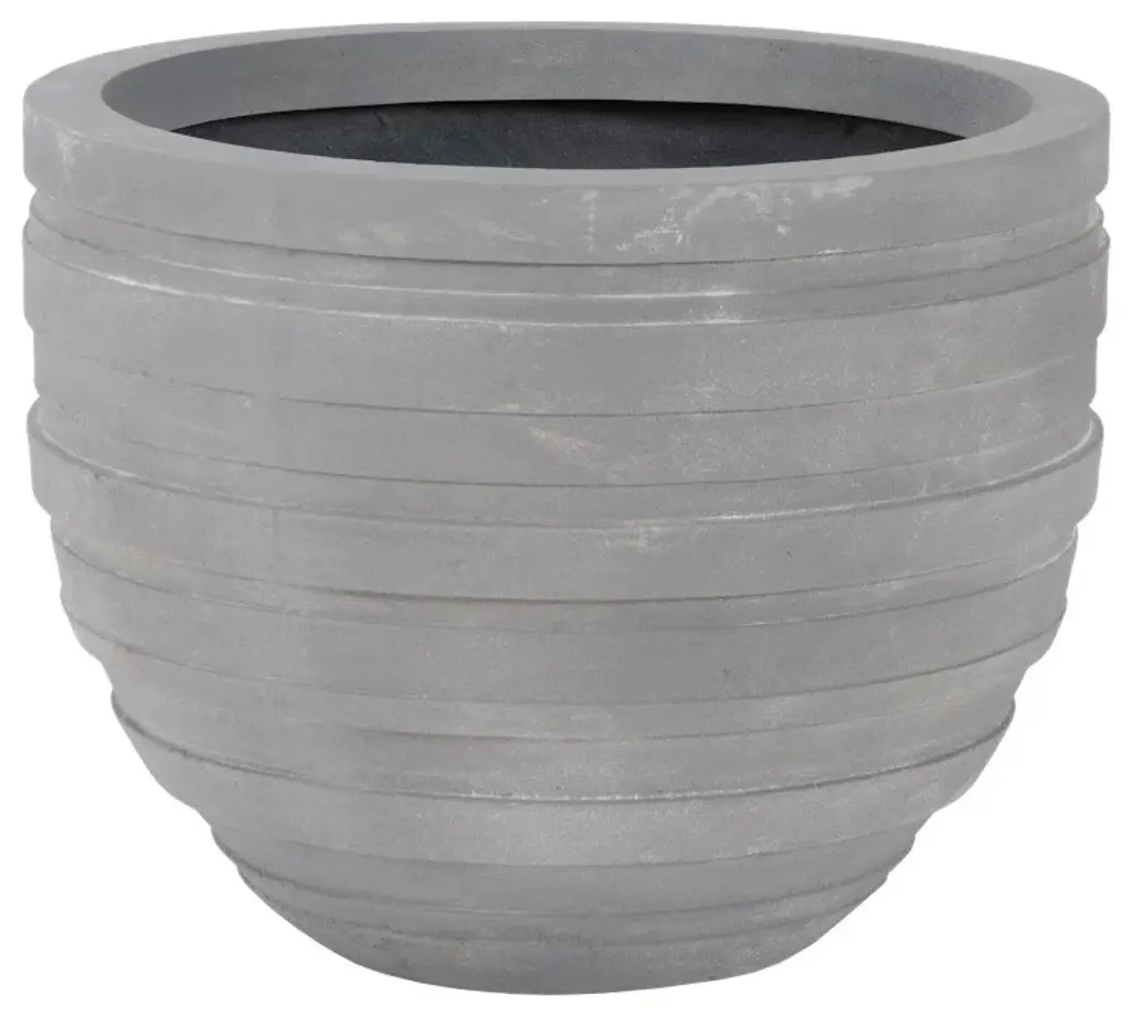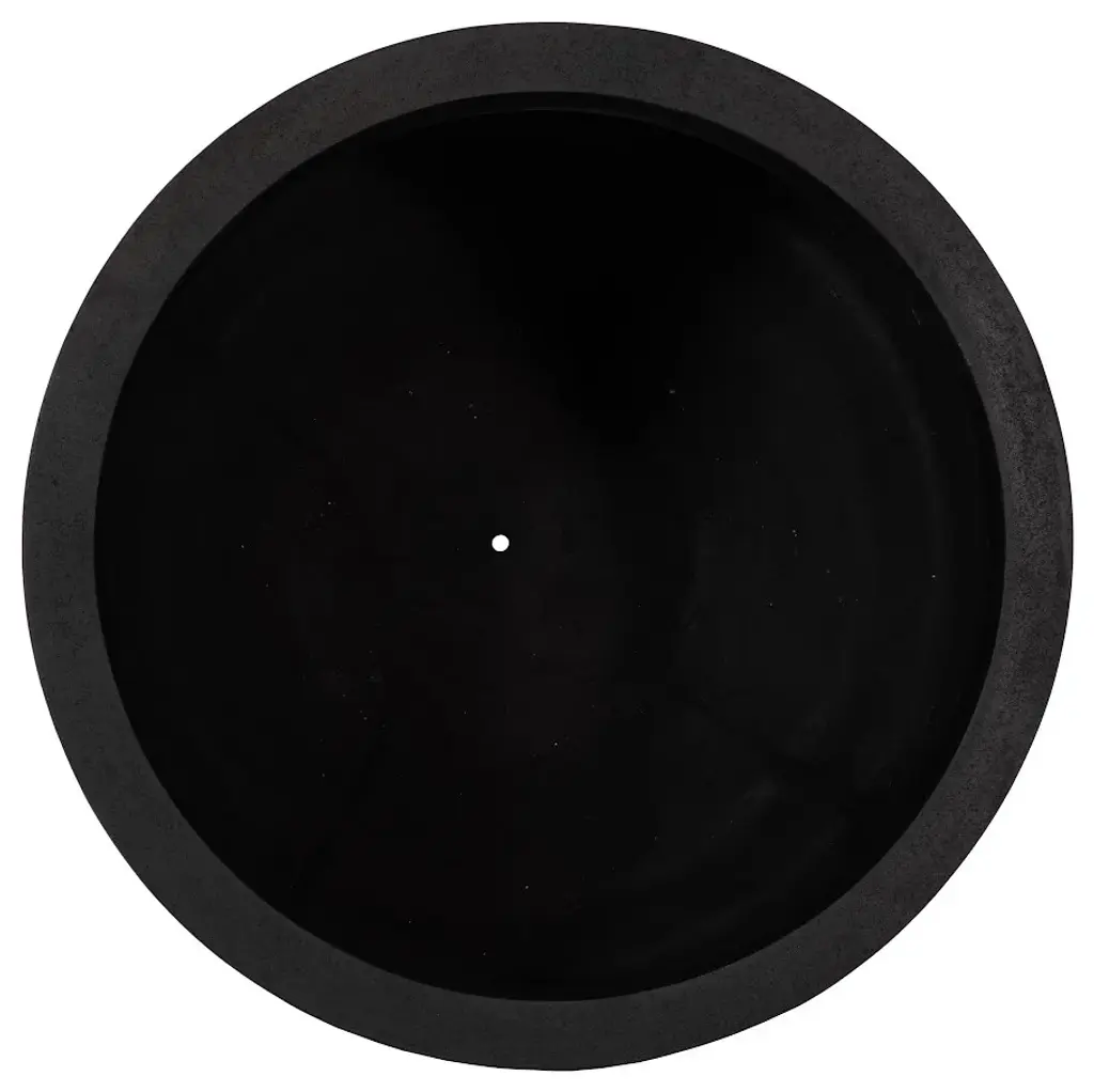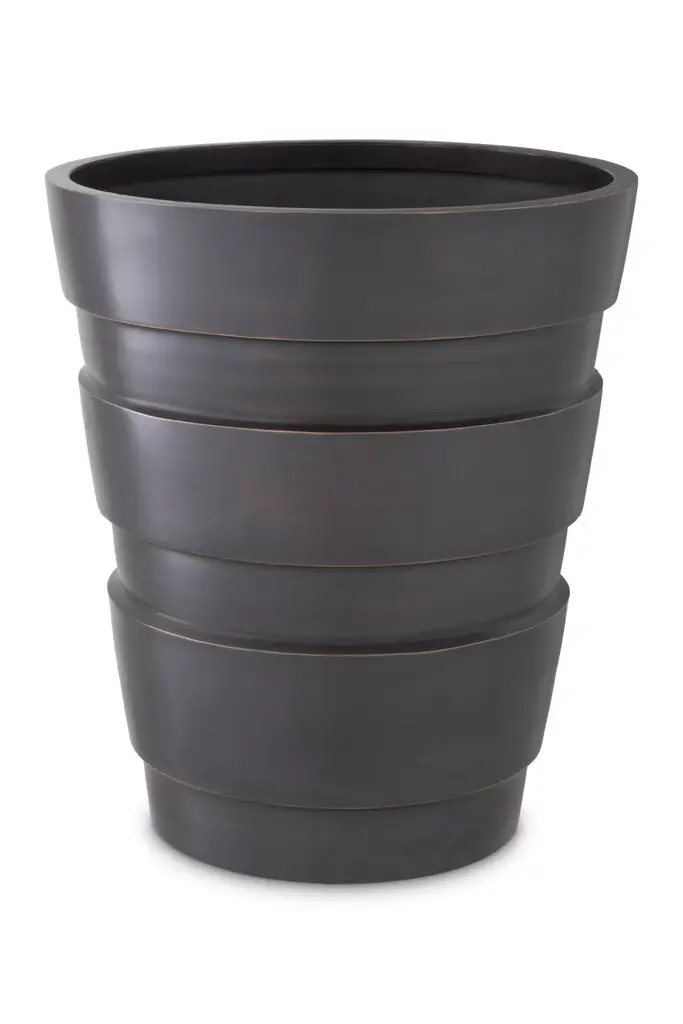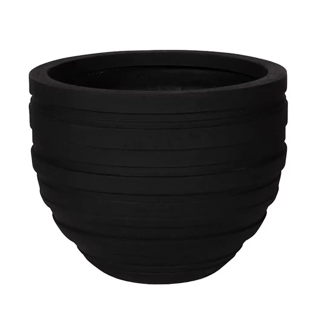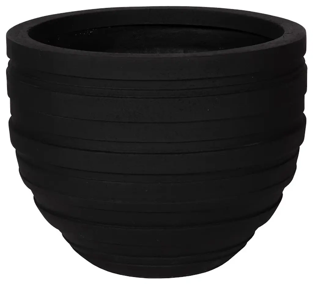 The June Medium Black Planter is ethereal in its matte black finish. Made of composite, its surface is striated to mimic fabric that has been wrapped around a vessel and slathered in a beautiful papier-mâché treatment. One of the loveliest aspects of this design is that it is strikingly contemporary for a garden planter thanks to its crisp black finish and the top lip that rolls into its interior to leave the shape clean-lined.