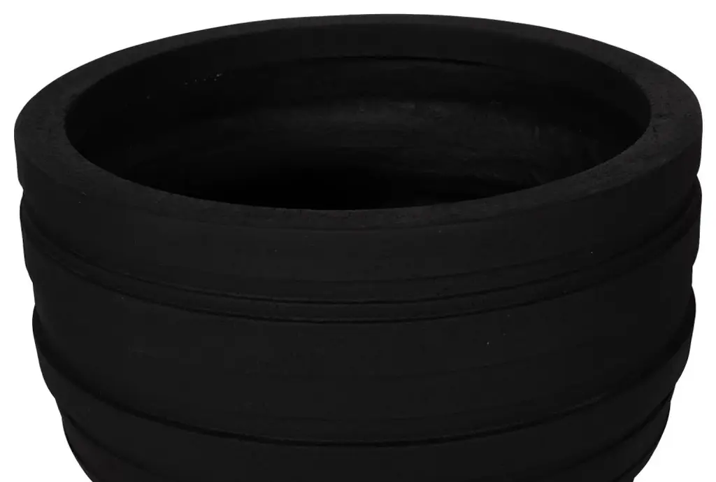 The June Extra Small Black Planter is ethereal in its matte black finish. Made of composite, its surface is striated to mimic fabric that has been wrapped around a vessel and slathered in a beautiful papier-mâché treatment. One of the loveliest aspects of this design is that it is strikingly contemporary for a garden planter thanks to its crisp black finish and the top lip that rolls into its interior to leave the shape clean-lined.