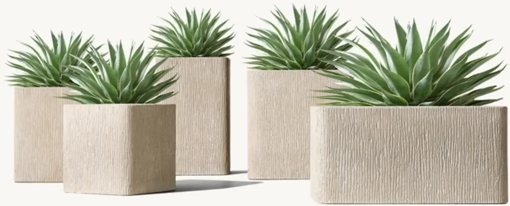 The Kasos planter's simple geometric form is a clean-lined counterpoint to its rough-hewn surface. A chiseled texture and tonal variations lend it a timeworn look, yet the planter is rendered in a hand-cast, hand-painted composite concrete that is durable and weather resistant.