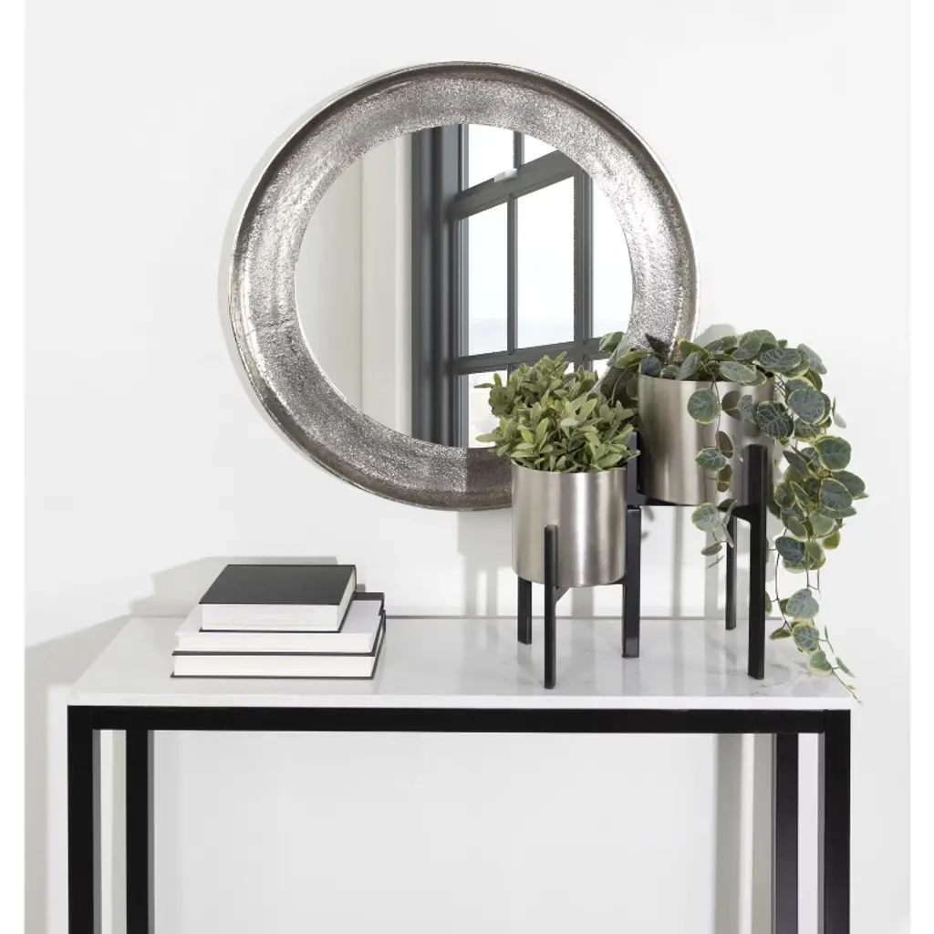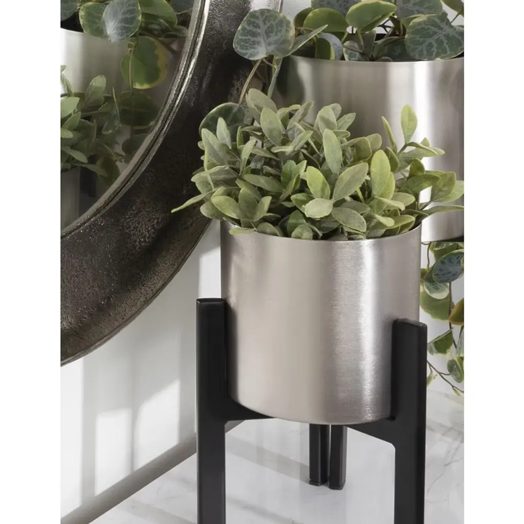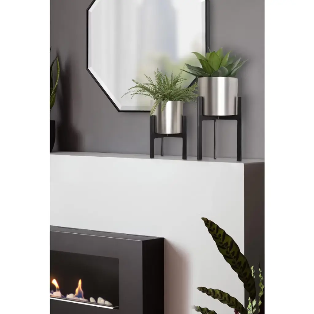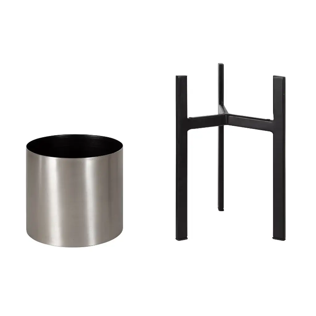 Decorate your modern home with a beautiful piece of greenery displayed in one of the Kolding modern planters. Inspired by clean, minimal design, the Kolding planter offers a freestanding design with bold and resilient iron material. The Kolding planters each have a two-tone finish, their pots utilizing a chic nickel plating and their stands having a transitional black finish. This planter's chic, two-tone finish makes it easy to blend into any room or decor theme. This set of freestanding planters have two different sizes: the larger planter is 6.75 inches wide by 6.75 inches deep by 14 inches tall, while its smaller size is 5.5 inches wide by 5.5 inches deep by 10 inches tall. These varied sizes make it easy to display the Kolding as a dynamic display or spread throughout your home for a cohesive decorative theme. Their deep pots can serve a variety of functions, too: use them to showcase a plant with the proper liner or use them as a catch-all for household necessities. Shake things up in your home by placing it near your entryway or vanity as a catch-all for keys, clutches, and more. This planter is perfect for showcasing your green thumb without sacrificing your modern or minimalist taste thanks to its simple, clean design and lightweight, quality material.