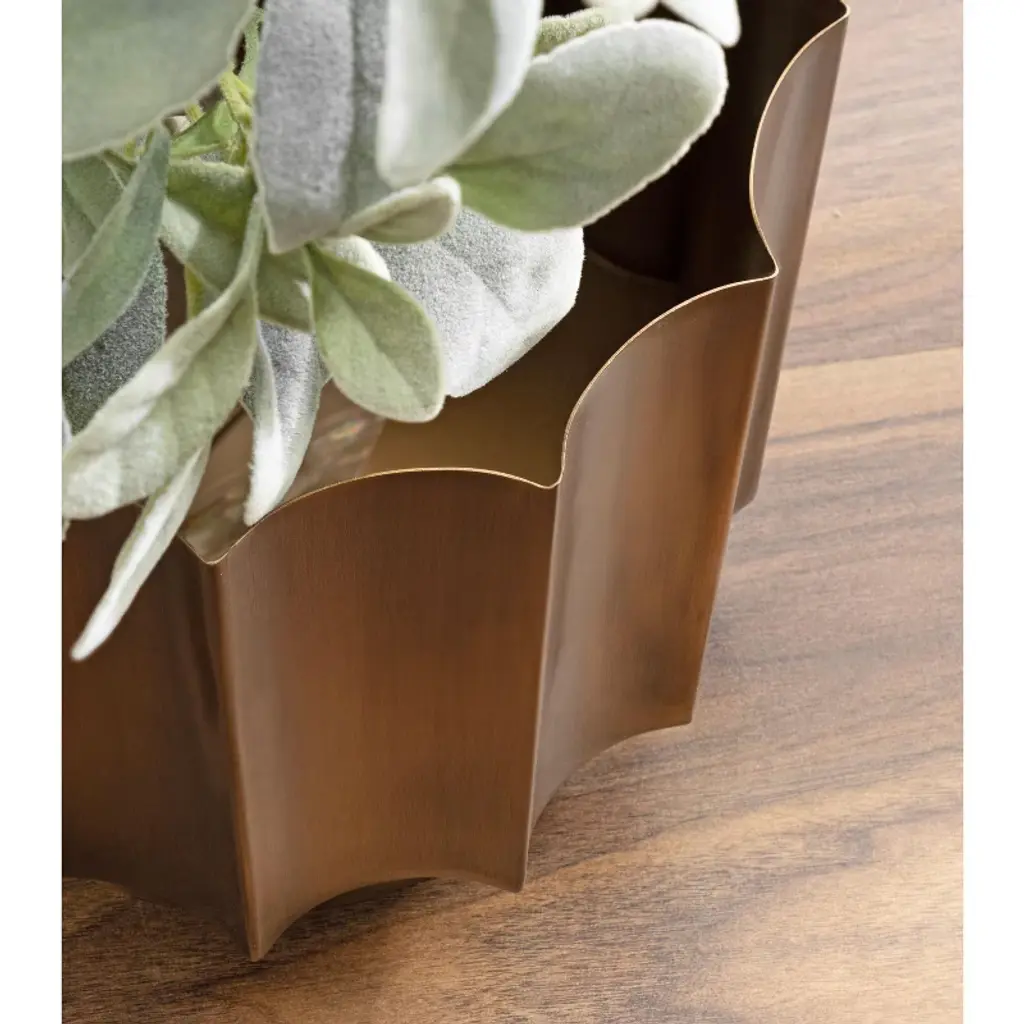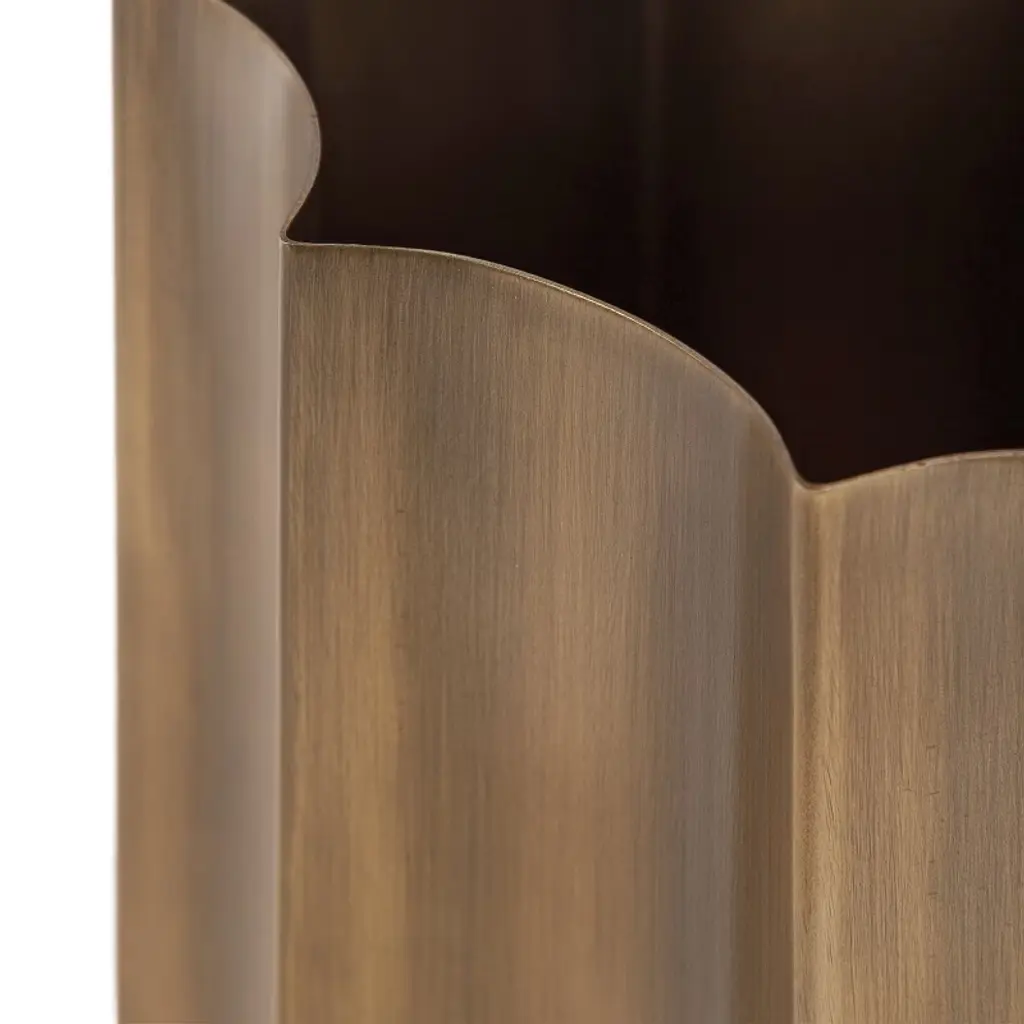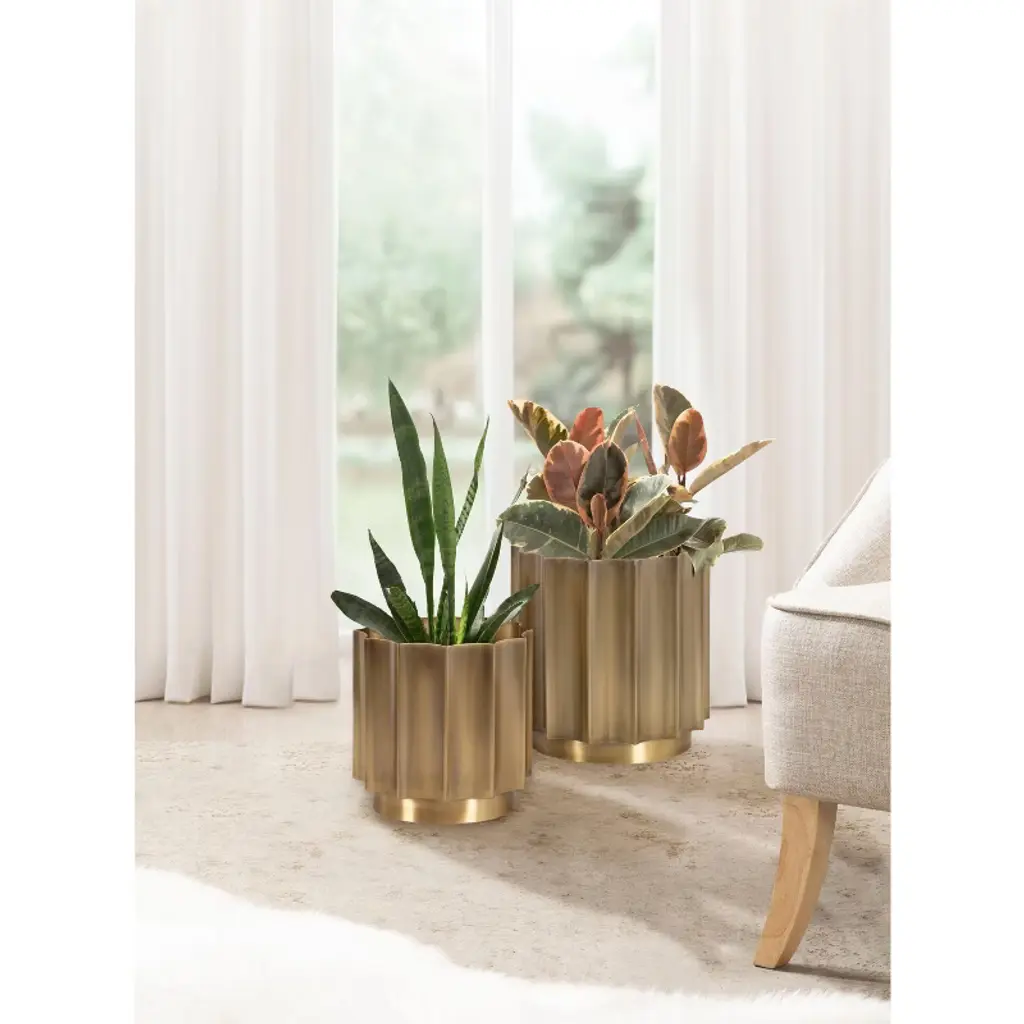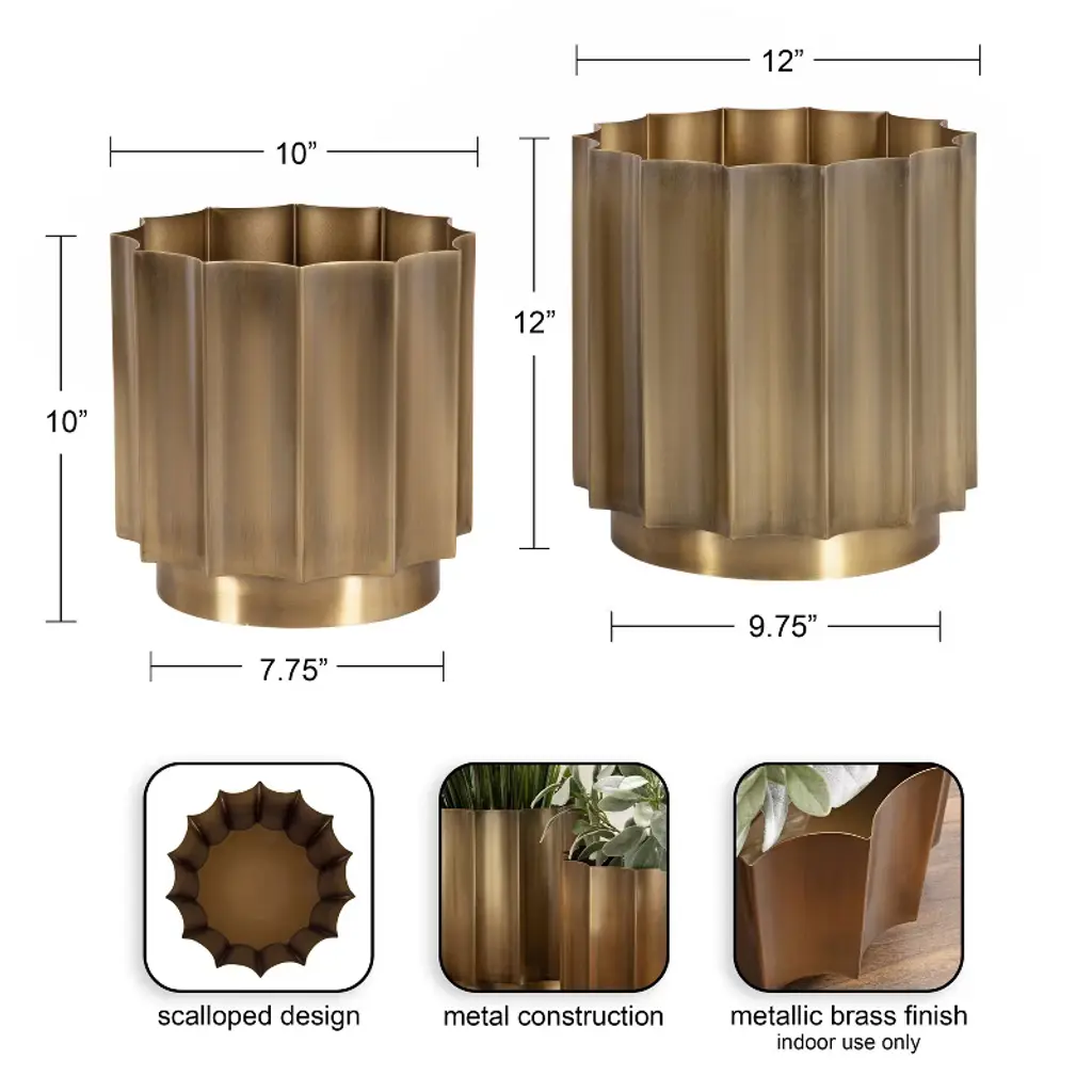 Remake your home into a space of modern simplicity and unique design with the Scalone planter set. This collection of sophisticated, freestanding planters showcase a unique style with their geometric, scalloped pots built with fluted panes. Each planter pot was forged in iron and then finished with an antique brass hue. Each planter has its own size, with the larger of the two standing at 12 inches tall, 12 inches wide and 12 inches deep, while the smaller plant stand is 10 inches tall, 10 inches wide, and 10 inches deep. The staggered sizes of this collection make it easy to showcase them together or spread throughout your living room, bedroom, bathroom, entryway, or sunroom. The inner basins are perfect for adding faux plants to your office, too, in case you need a little greenery.