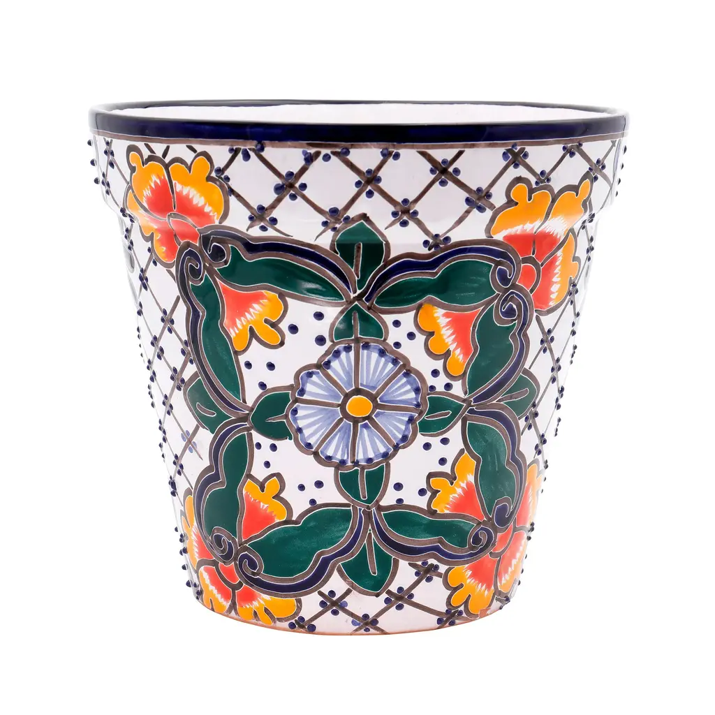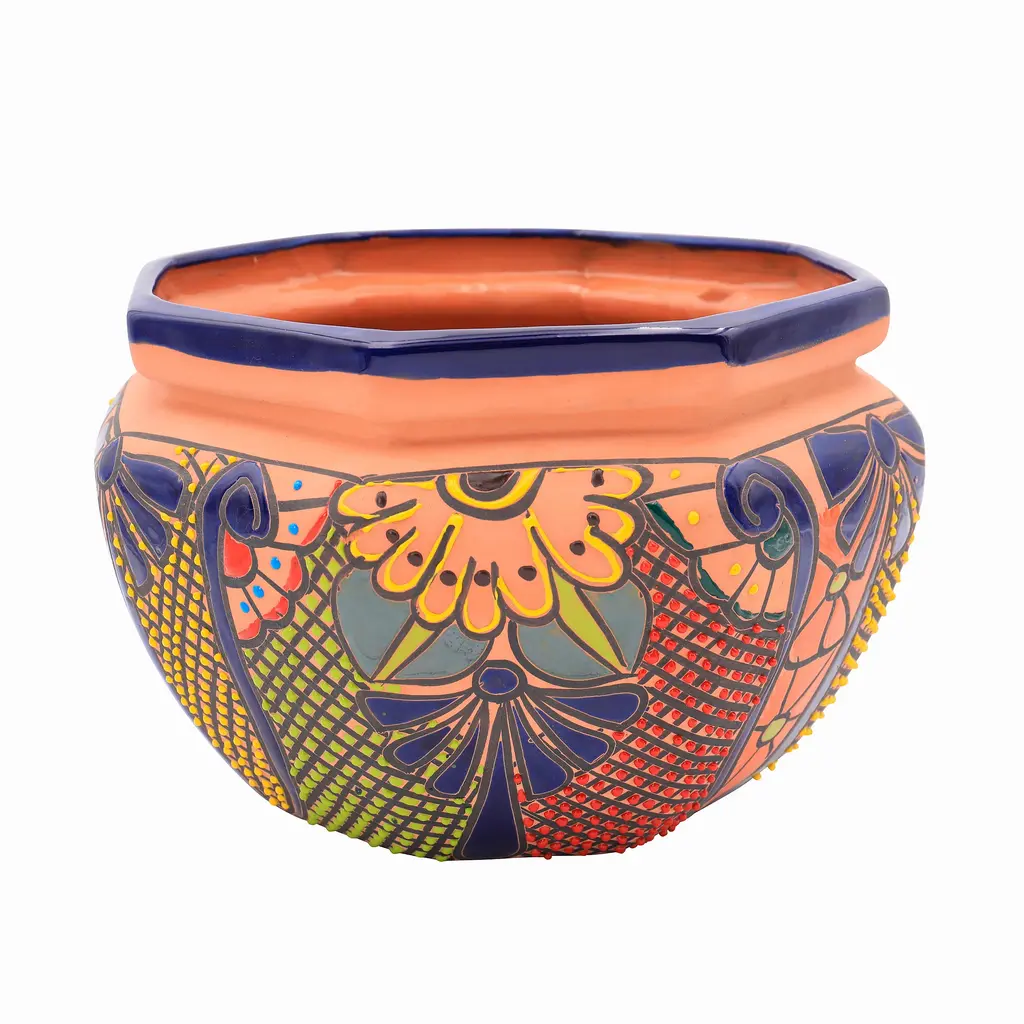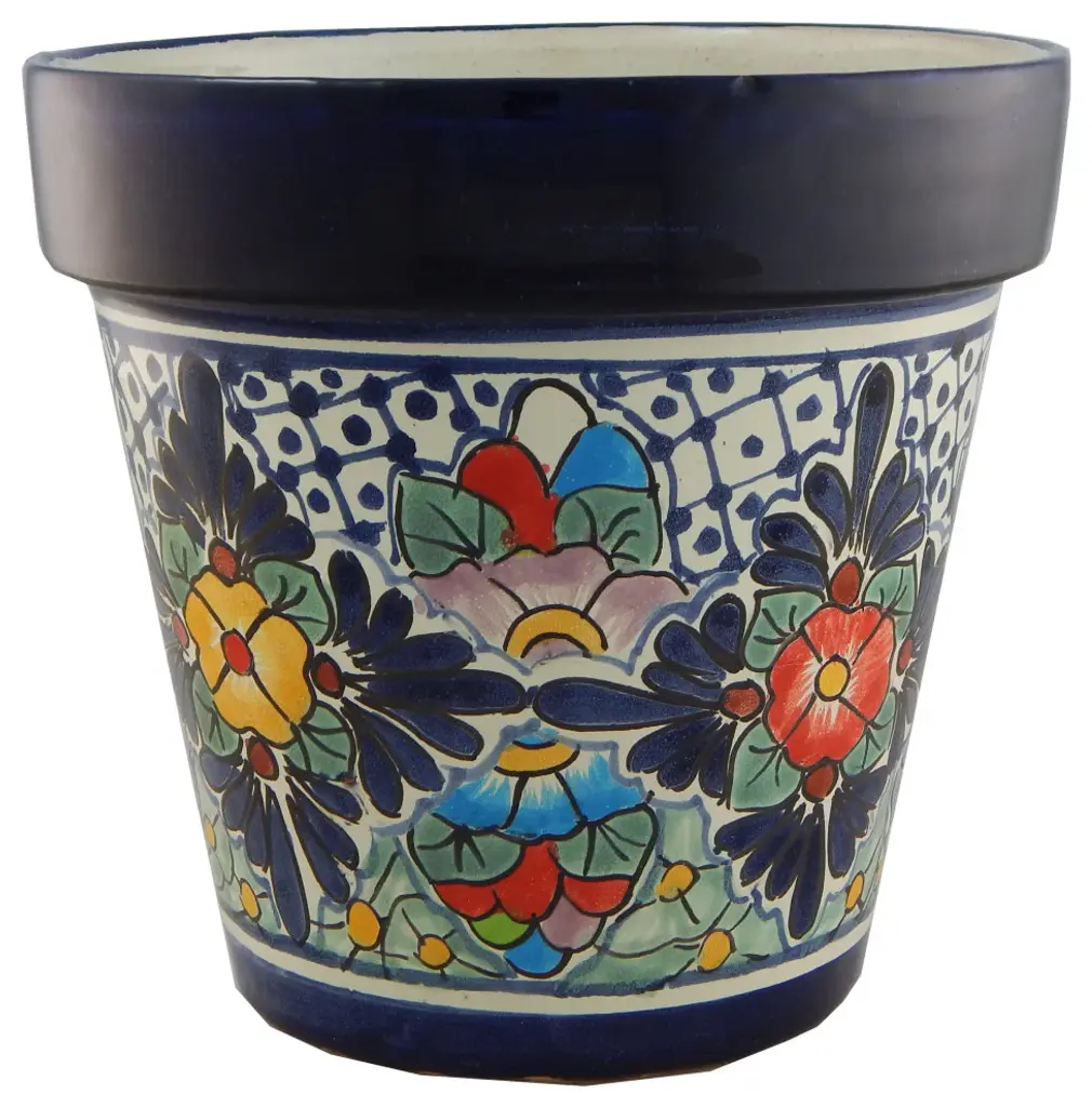 Bring quality craftsmanship to your home with this Talavera planter, handmade by skilled artisans in Mexico. With a raised texture that will delight your senses, this soothing blue planter is perfect for displaying your favorite plants. The glaze coating is applied by hand and seals in the intricate artistry and gives the planter a wonderful shine, making it safe for display indoors or out. Feature this planter in your living room, entryway, porch, deck and more. The hand-painted colors perfectly complement greenery, florals or neutral spaces in need of a colorful upgrade. Bottom drainage hole included.