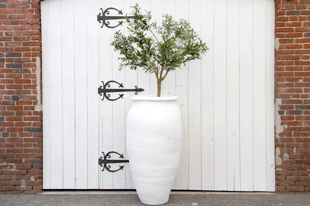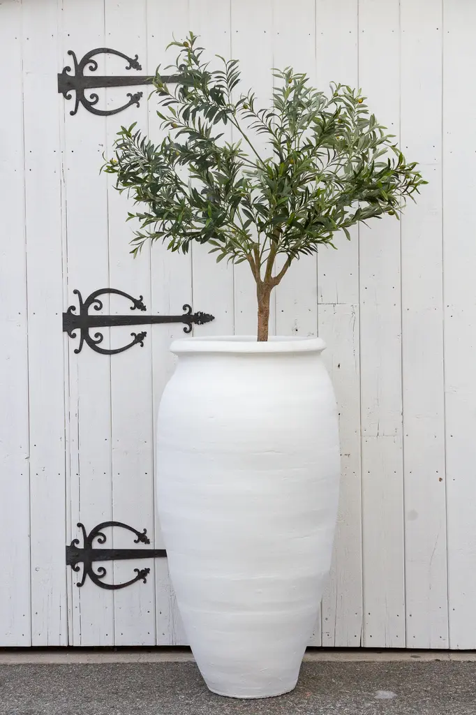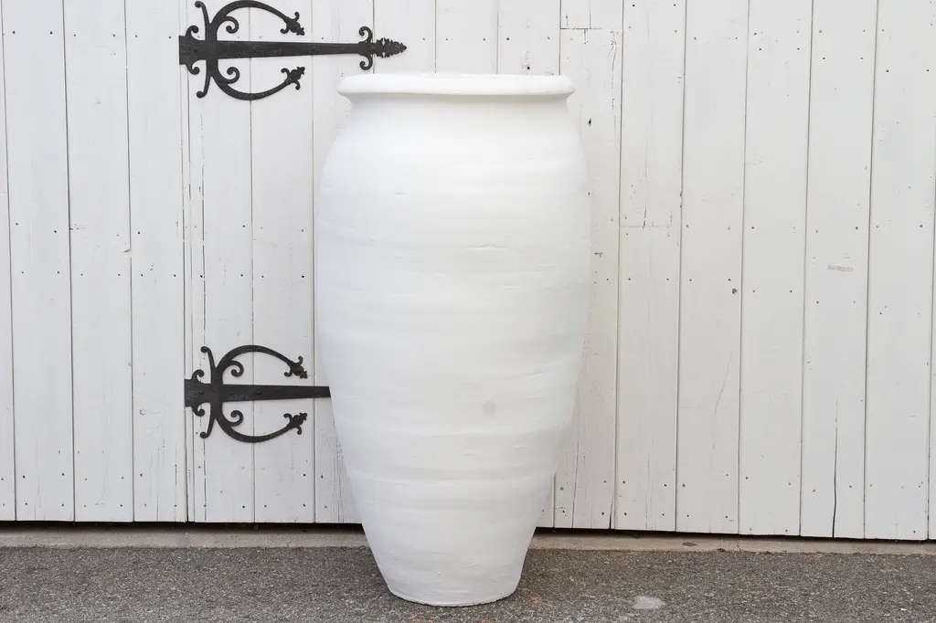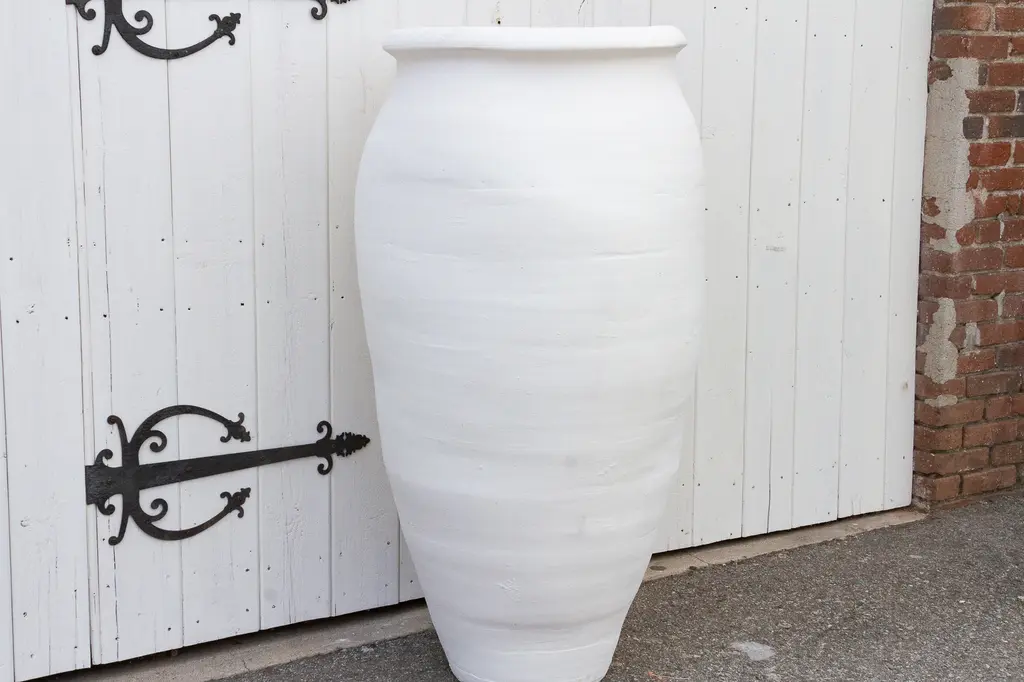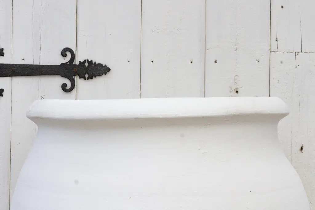 A grand and robust terracotta planter with wide top opening, amphora shape and un-glazed whitewash surface. Ready to be filled with gorgeous plants, this piece is perfect to add touch of nature to any home. This planter has a drainage hole at the bottom of its base.