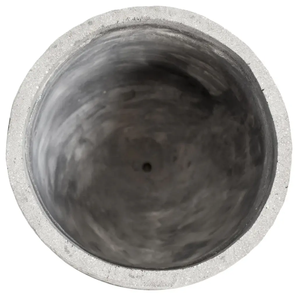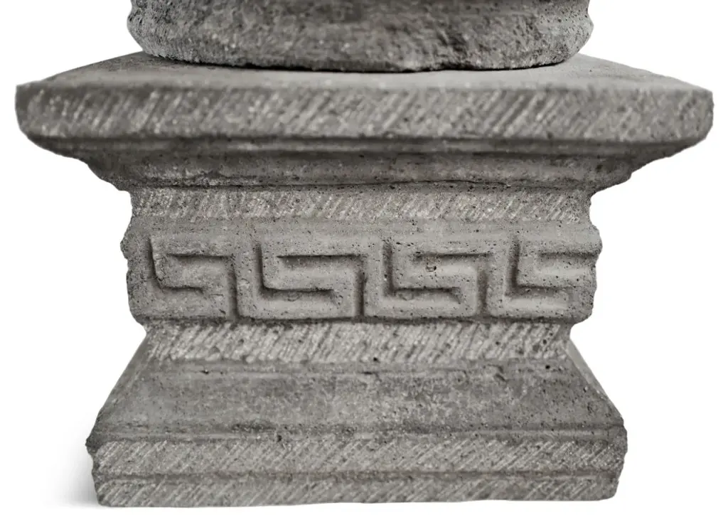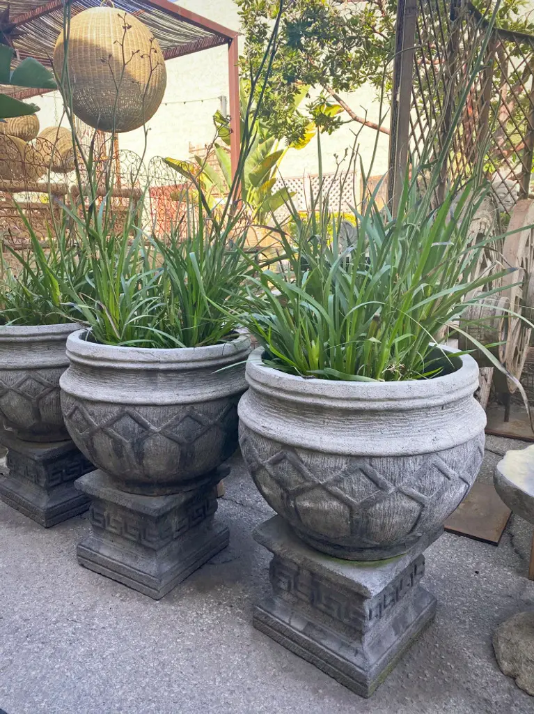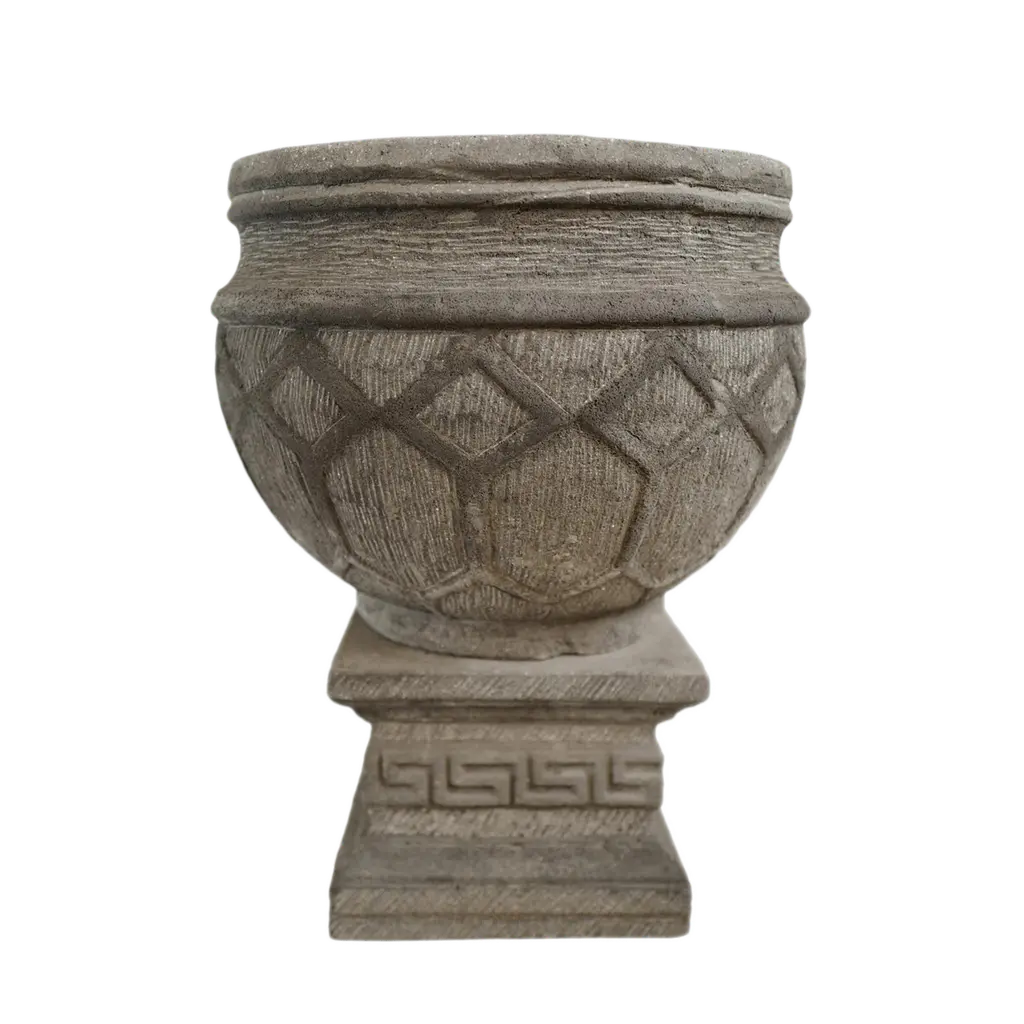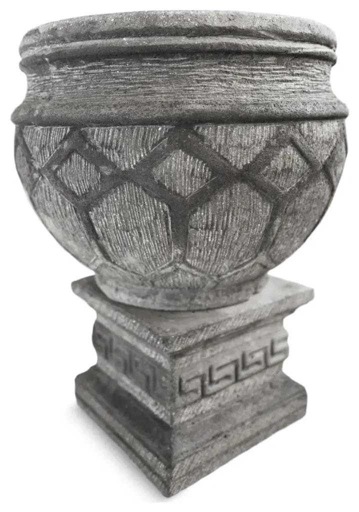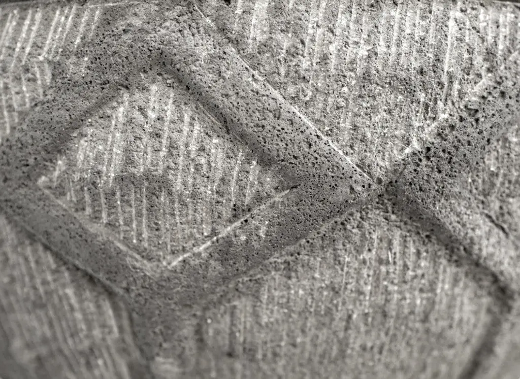 Carved outdoor lava stone planter bowl. Dark gray patina with carved designs. Base and bowl can be separated for moving. Drainage hole included. Each may vary in exact patina and marks. Opening at the top measures 18" diameter.
