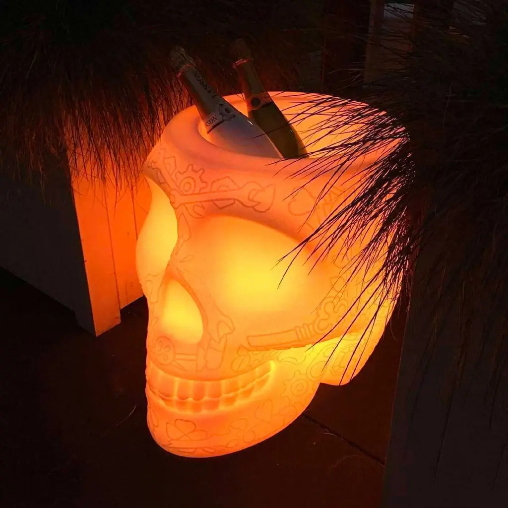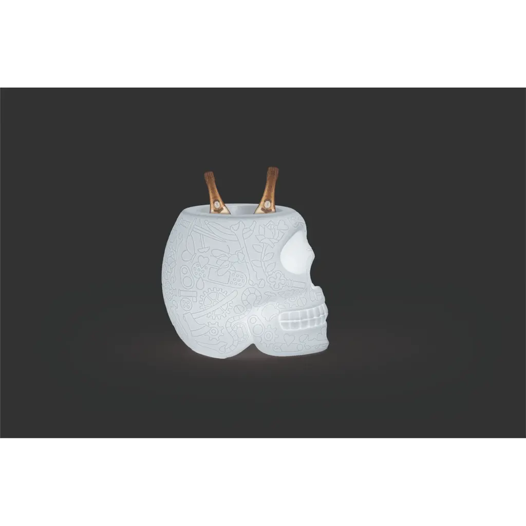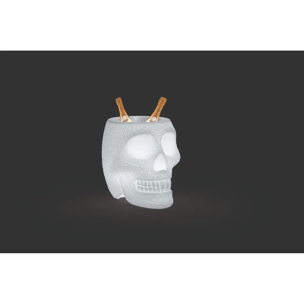 Introducing Mexico, a skull-shaped LED planter and champagne cooler lamp designed by Studio Job for Qeeboo. This whimsical piece adds a touch of elegance and sophistication to any lounge area, dining room, or outdoor space. With a rechargeable battery and 16 interchangeable RGB colors, it's the perfect addition for exorcising death and celebrating life in style.