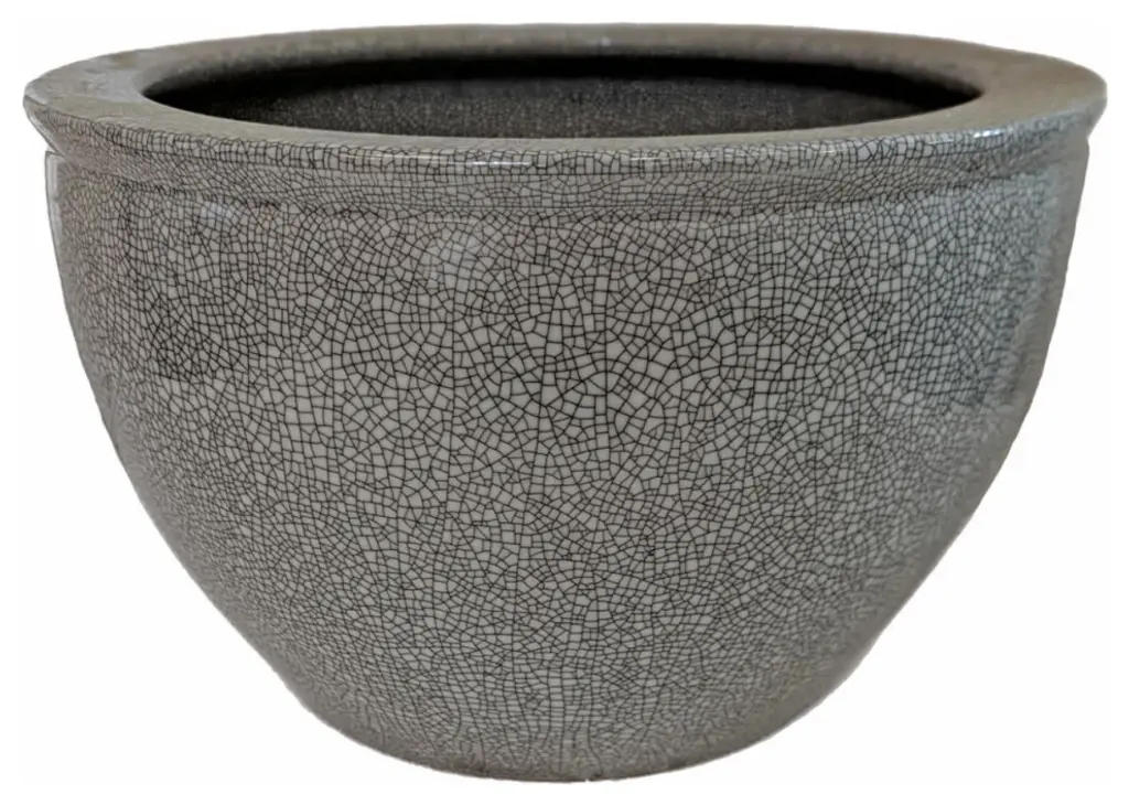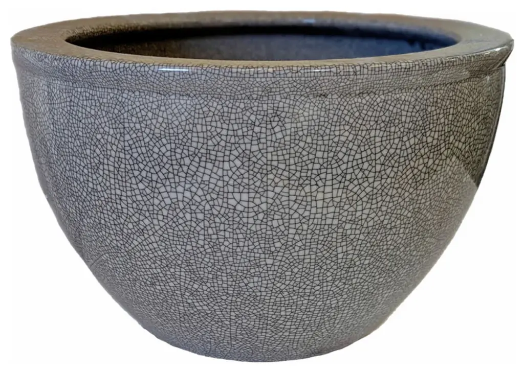 Grey Crackle is used on this Japanese styled porcelain fish bowl planter from China .Artfully hand-finished in a Grey Crackle glaze that resembles turquoise or jade stone. This large bowl is the perfect home for any large plant or tree , can be used outdoors or indoors. These are water tight glazed inside and out. Our artisans use only the highest quality porcelain, fire glazed inside and outside for added strength. Add an elegant design statement with one of our vase stands available in a wide assortment of sizes (including pedestal), styles and wood types. Remember to use the bottom diameter size when selecting your stand. Size 22" X 13.5"HInside Opening 16.5 x 12"Bottom Dia. 12.5"DiaCan be used both indoors and outdoorsMade from high quality porcelain,fire glazed inside and outside for added strengthWater tight, will not leave water marks Ships FedExStand Not IncludedGrey Crackle