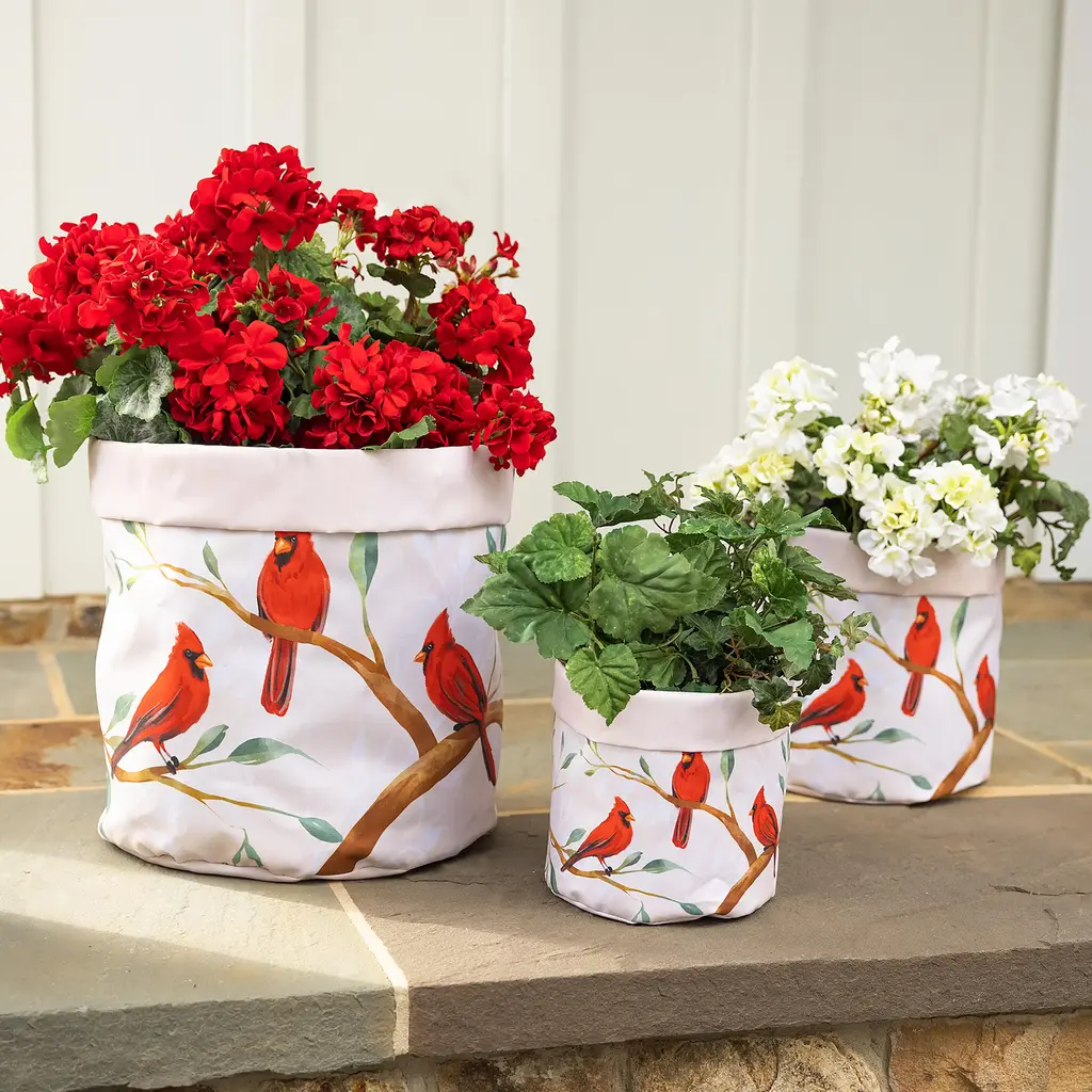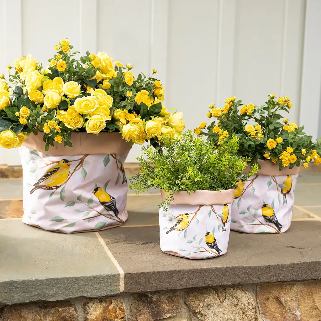 Our versatile set of three canvas planters, featuring charming bird designs, can be used in so many ways! Each set includes a small, medium and large container designed for planting flowers, herbs or veggies. Plant directly into the lined planters or use them to dress up plain pots. The beautiful designs make these containers as pretty as they are useful. The planters are flexible and collapsible, so they're easy to store when not in use. Cheerful and decorative, these planting pots can be used indoors or out. Use them as containers for anything too, from knitting and craft materials to storage for dog toys and more. Or, drop in a potted plant and give it as a gift for any occasion. Imported.