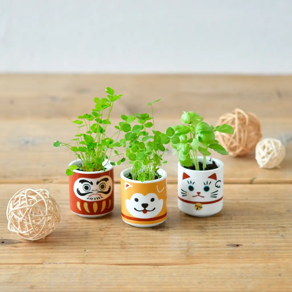Start a seedling the lucky way in these intricately painted mini planters that feature Japanese talismans of luck, including the Daruma Doll, the Beckoning Cat and the Lucky Dog, fashioned after the famous Japanese Akita named Hachi who met his owner every day at their train station. Each sweet, petite ceramic planter comes with a seed pack, coconut fiber growing medium and instructions for getting them to start producing green shoots. (The Cat and Dog include clover seeds, while the Daruma Doll includes basil seeds.) The Lucky Mini Planter is made from ceramic and coconut fiber pellets and includes a seed packet. Planter measures 1.8h x 1.75" diam.